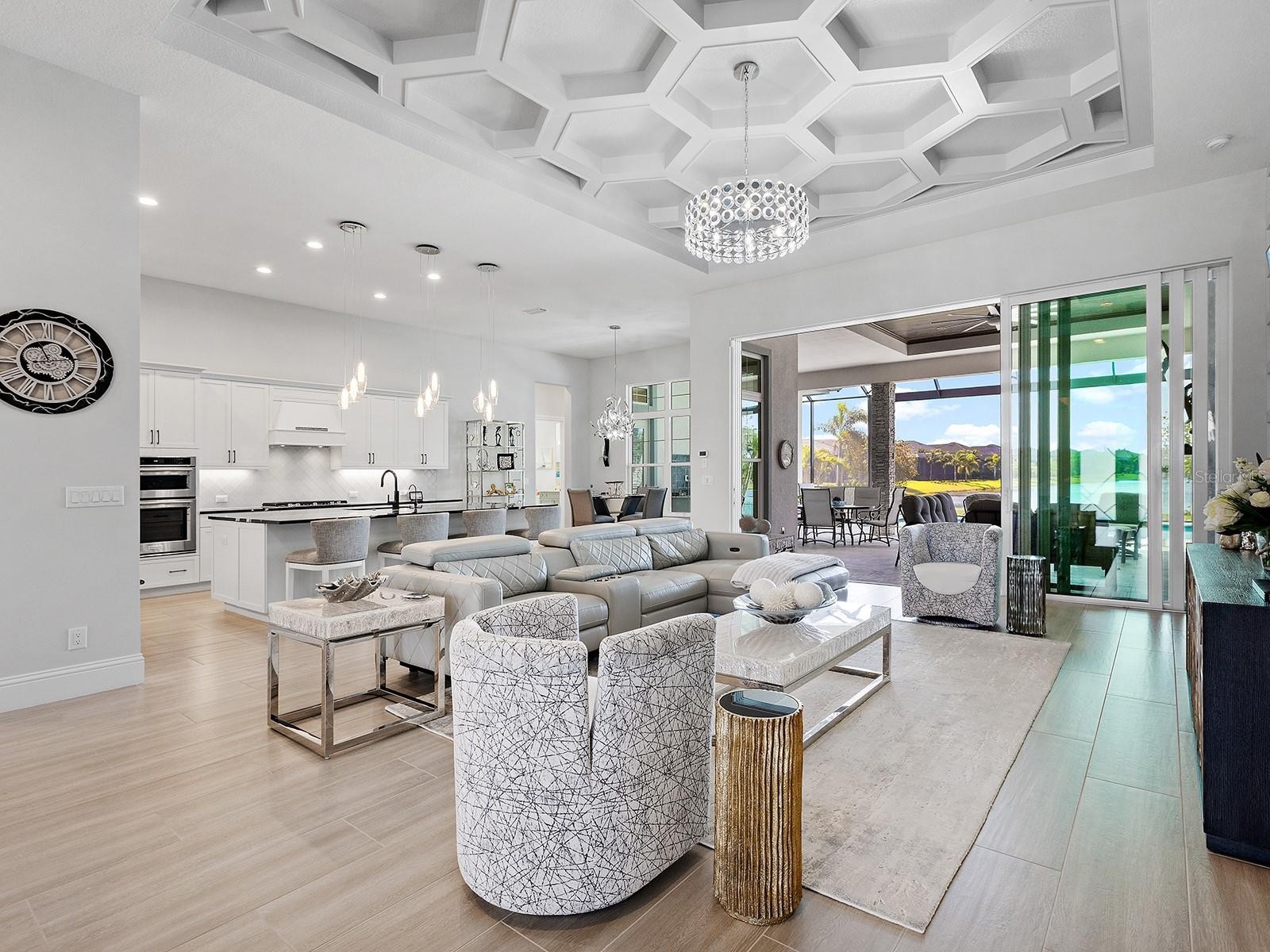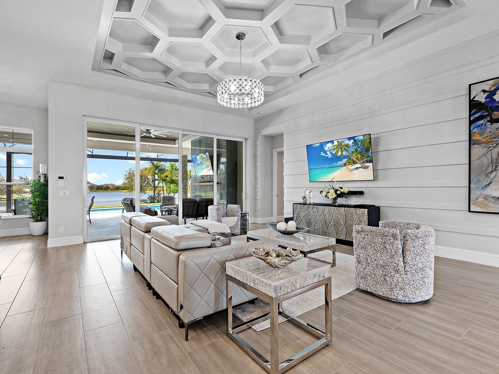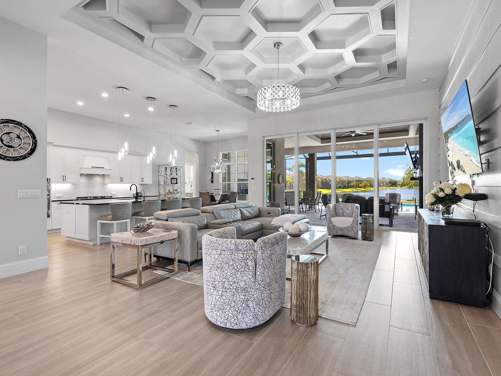 Set within the gated and prestigious The Lake Club, this Sterling III floor plan with a bonus room offers four bedrooms and four full baths on a 0.53-acre lakefront homesite, blending modern coastal architecture with thoughtful design. A paver driveway, mature landscaping framed by rock-edged planting beds, and stone accents create a welcoming first impression. Throughout the residence, wood-look plank tile flooring, designer lighting, and custom ceiling treatments elevate each space. The foyer features double hurricane-impact doors with geometric iron details and a dual locking system. The great room includes a custom feature wall and expansive sliding glass doors that open to the lanai. The dining area boasts exposed wood ceiling beams and plantation-shuttered windows. The private office includes double glass French doors, a gray wood-trim ceiling with recessed lighting, and built-in shelving and cabinetry. The kitchen balances functionality and design, anchored by a floating island with quartz countertops, storage, and three designer pendant lights above. Custom soft-close cabinetry is complemented by a glass tile backsplash, pull-out drawers, and a hidden trash compartment. A custom wood range hood highlights the five-burner gas cooktop, while the KitchenAid appliance suite and Kohler stainless steel undermount sink support everyday efficiency. A dedicated coffee bar and walk-in pantry with wood shelving provide additional storage and convenience. The adjacent breakfast area overlooks the lake through a large three-panel window, with an additional window facing the outdoor fireplace terrace. Nearby, a wet bar with upper cabinetry, a Brisas wine cooler, and a Sterling sink offers a convenient space for entertaining. The primary suite offers a private retreat with large windows and French doors opening directly to the pool area. Two walk-in closets with custom built-ins provide ample storage. The primary bath includes a dual-sink vanity with quartz countertops, a freestanding Maax soaking tub, and a walk-in glass shower with floor-to-ceiling tile, shelving, and a niche. Three additional guest suites offer walk-in closets and well-appointed bathrooms with a walk-in shower or tub/shower combo surrounds and custom vanities. One of these also serves as the pool bath for easy outdoor access. The bonus room offers flexibility and includes a stone accent wall with a linear fireplace and recessed TV niche, a dry bar with floating shelves, and a large closet with custom doors. The expansive lanai features decorative stone columns, marble pavers, and a linear fireplace with a wood mantle and custom tile surround. The outdoor kitchen includes a grill, hood, sink, beverage cooler, and tile backsplash. The panoramic screen enclosure frames the heated saltwater pool and spa with a sun shelf and fire bowls, while an additional seating area overlooks the lake. The laundry room features cabinetry, a utility sink, and a Whirlpool washer and dryer. The 3-car garage has epoxy flooring, floor-to-ceiling custom cabinetry, and ceiling storage. The home is equipped with impact-rated windows and doors, a security system with video cameras, and two HVAC systems (one with a UV light). Residents of The Lake Club enjoy resort-style amenities including a clubhouse, pool, fitness center, tennis and pickleball courts, dining, social events, and more, all just minutes from Waterside Place, UTC, Mote Aquarium, top-rated schools, and Gulf beaches.