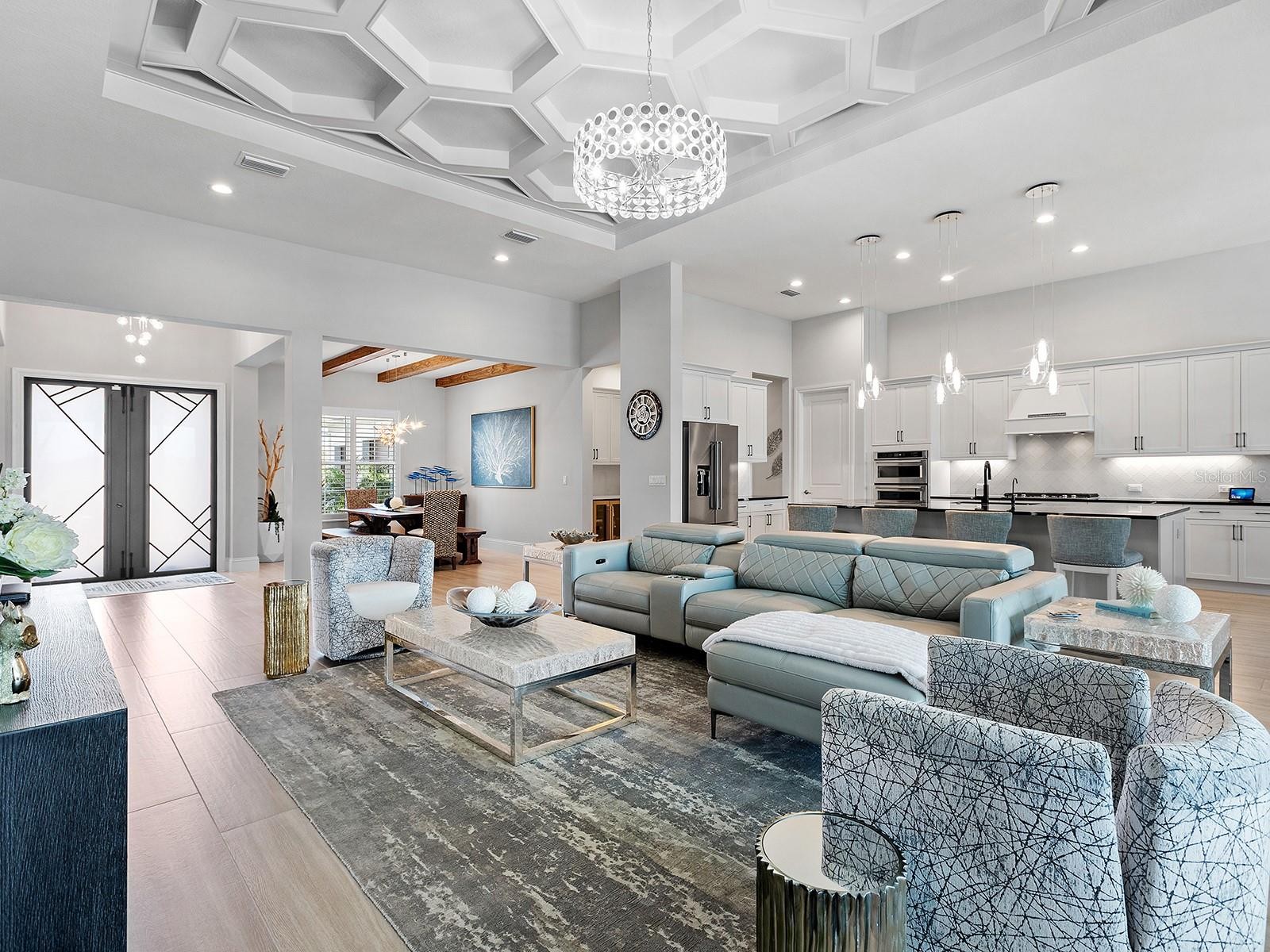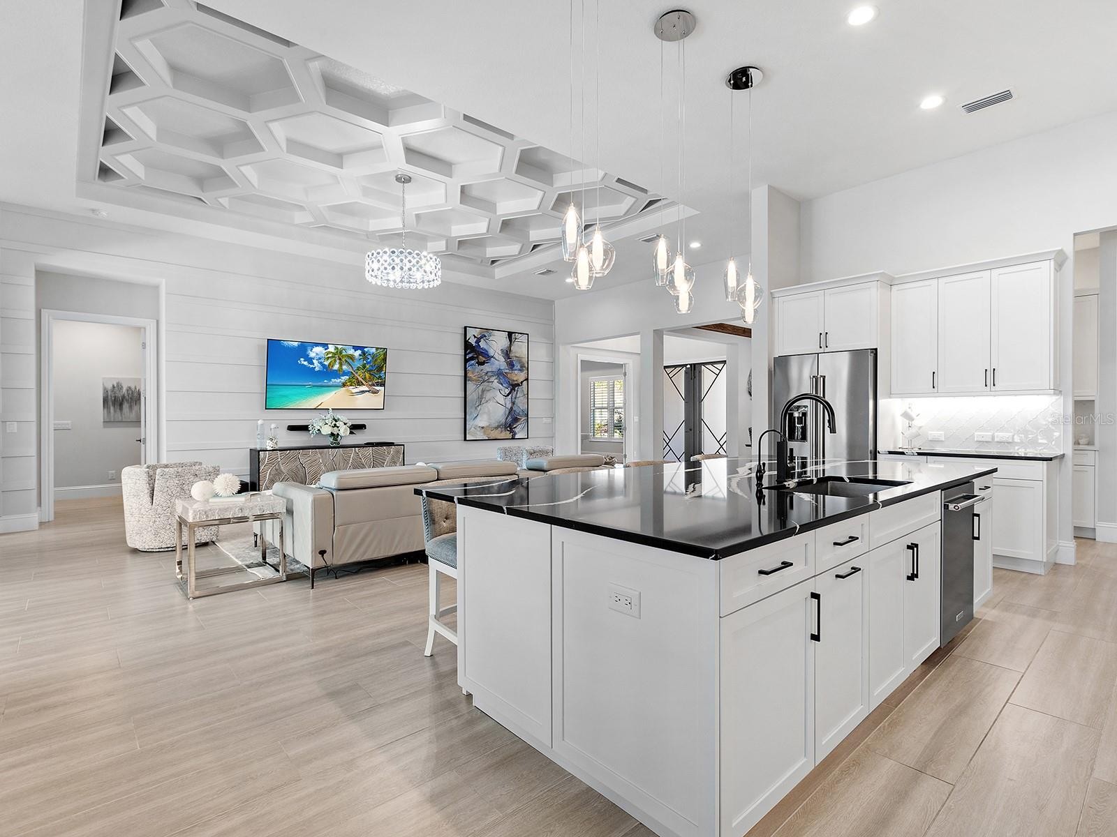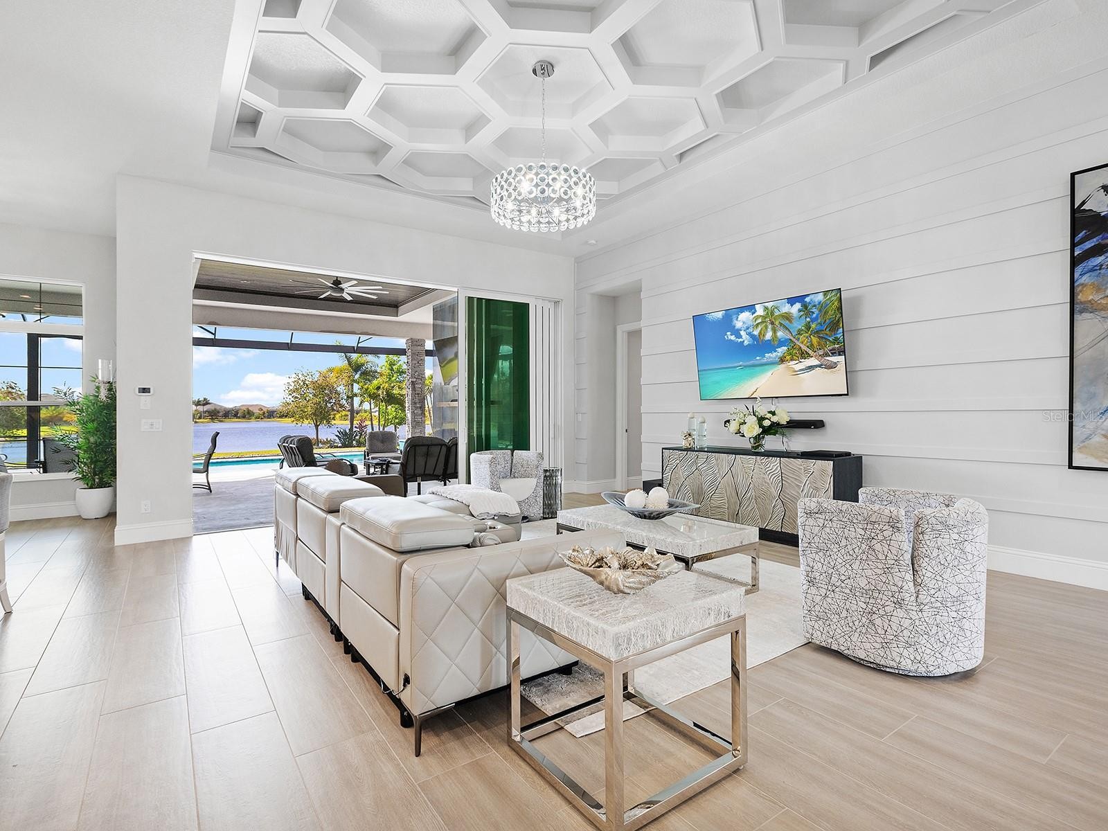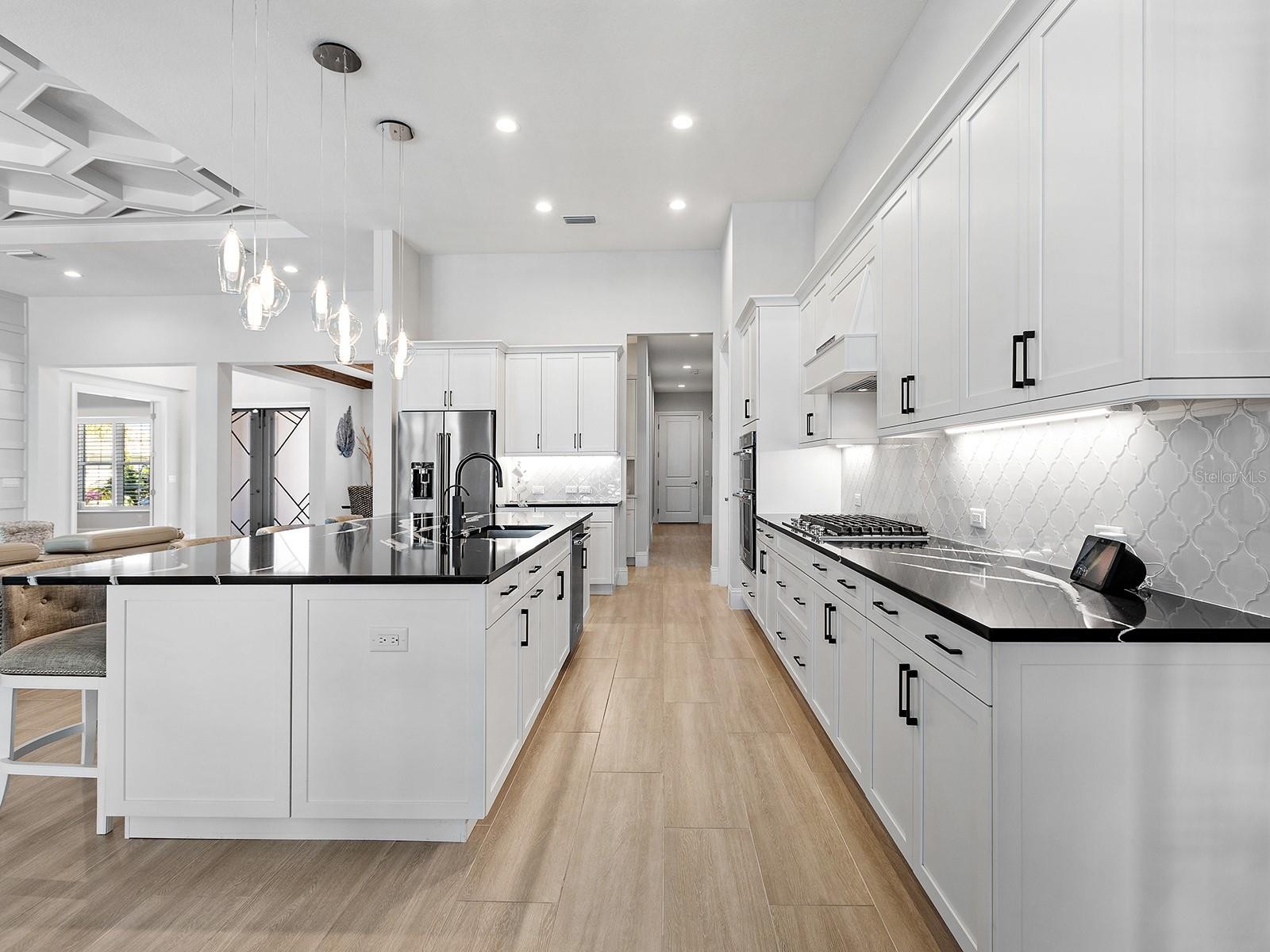 Set within the gated and prestigious The Lake Club, this Sterling III floor plan with a bonus room offers four bedrooms and four full baths on a 0.53-acre lakefront homesite, blending modern coastal architecture with thoughtful design. A paver driveway, mature landscaping framed by rock-edged planting beds, and stone accents create a welcoming first impression. Throughout the residence, wood-look plank tile flooring, designer lighting, and custom ceiling treatments elevate each space. The foyer features double hurricane-impact doors with geometric iron details and a dual locking system. The great room includes a custom feature wall and expansive sliding glass doors that open to the lanai. The dining area boasts exposed wood ceiling beams and plantation-shuttered windows. The private office includes double glass French doors, a gray wood-trim ceiling with recessed lighting, and built-in shelving and cabinetry. The kitchen balances functionality and design, anchored by a floating island with quartz countertops, storage, and three designer pendant lights above. Custom soft-close cabinetry is complemented by a glass tile backsplash, pull-out drawers, and a hidden trash compartment. A custom wood range hood highlights the five-burner gas cooktop, while the KitchenAid appliance suite and Kohler stainless steel undermount sink support everyday efficiency. A dedicated coffee bar and walk-in pantry with wood shelving provide additional storage and convenience. The adjacent breakfast area overlooks the lake through a large three-panel window, with an additional window facing the outdoor fireplace terrace. Nearby, a wet bar with upper cabinetry, a Brisas wine cooler, and a Sterling sink offers a convenient space for entertaining. The primary suite offers a private retreat with large windows and French doors opening directly to the pool area. Two walk-in closets with custom built-ins provide ample storage. The primary bath includes a dual-sink vanity with quartz countertops, a freestanding Maax soaking tub, and a walk-in glass shower with floor-to-ceiling tile, shelving, and a niche. Three additional guest suites offer walk-in closets and well-appointed bathrooms with a walk-in shower or tub/shower combo surrounds and custom vanities. One of these also serves as the pool bath for easy outdoor access. The bonus room offers flexibility and includes a stone accent wall with a linear fireplace and recessed TV niche, a dry bar with floating shelves, and a large closet with custom doors. The expansive lanai features decorative stone columns, marble pavers, and a linear fireplace with a wood mantle and custom tile surround. The outdoor kitchen includes a grill, hood, sink, beverage cooler, and tile backsplash. The panoramic screen enclosure frames the heated saltwater pool and spa with a sun shelf and fire bowls, while an additional seating area overlooks the lake. The laundry room features cabinetry, a utility sink, and a Whirlpool washer and dryer. The 3-car garage has epoxy flooring, floor-to-ceiling custom cabinetry, and ceiling storage. The home is equipped with impact-rated windows and doors, a security system with video cameras, and two HVAC systems (one with a UV light). Residents of The Lake Club enjoy resort-style amenities including a clubhouse, pool, fitness center, tennis and pickleball courts, dining, social events, and more, all just minutes from Waterside Place, UTC, Mote Aquarium, top-rated schools, and Gulf beaches.