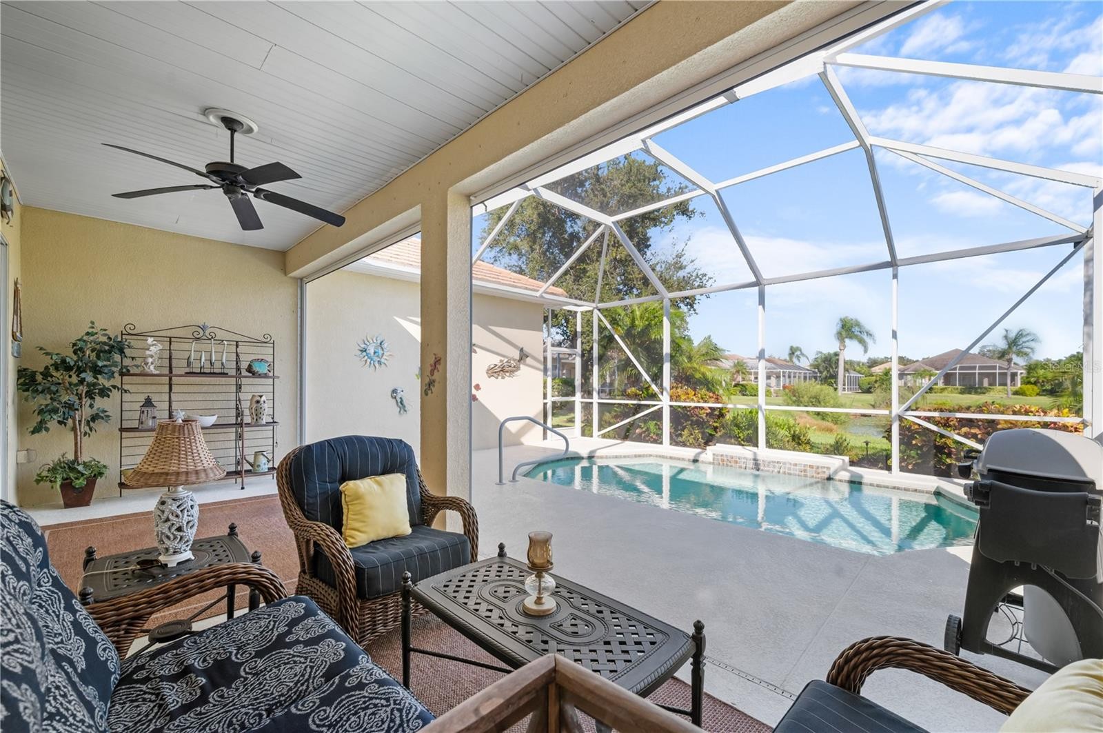STUNNING UPDATED POOL HOME IN WISTERIA PARK! Welcome home to this beautifully maintained former Neal “Endless Summer” model, thoughtfully upgraded to offer peace of mind, storm security, and effortless Florida living. Situated in Flood Zone X—high and dry, with no flooding or storm impact during the 2024 hurricane season—this home provides rare reassurance in coastal Florida. Enjoy IMPACT WINDOWS(2022), a WHOLE HOUSE GENERATOR (2022), REMOTE HURRICANE BLINDS ACROSS LANAI, and a recently inspected CONCRETE TILE ROOF, all designed to deliver lasting comfort and protection. Adding to the appeal, landscaping and irrigation are maintained by the HOA, allowing homeowners to enjoy a "MAINTENANCE-FREE" lifestyle—more time to relax by the pool or explore the nearby preserves and beaches. Perfectly positioned just steps from the gorgeous community pool, this residence blends modern upgrades, timeless design, and an unbeatable Northwest Bradenton location. From the moment you arrive, the home’s impeccable curb appeal and meticulous care are immediately evident. The neighborhood of Wisteria Park is known for its lush landscaping, stately palms, and peaceful atmosphere, creating a picture-perfect setting for Florida living. Inside, a thoughtfully designed open floor plan showcases elegant features including crown molding, tray ceilings, and custom plantation shutters throughout. The kitchen serves as the heart of the home, featuring quartz countertops, stainless steel appliances including a gas stove, and a large center island—perfect for entertaining or casual dining. The primary suite offers tranquil pond views, two custom walk-in closets, and a large bathroom with dual vanities and a large walk-in shower. Two additional bedrooms and a full guest bath provide comfort for family or visitors, while the oversized den/office offers flexibility for a workspace, library, or guest overflow. Step outside to your own private backyard oasis. The heated, screened-in pool and covered lanai are ideal for al fresco dining, lounging, or enjoying peaceful evenings. With motorized hurricane blinds, this space can easily transition for all-weather enjoyment. The garage with epoxy-painted floor and hanging storage system adds both style and functionality. Beyond your doorstep, Wisteria Park offers a community pool, playground, and open green spaces for walking or gathering with neighbors. Just minutes away, you’ll find Robinson Preserve, a local treasure with walking and biking trails, kayak launches, and stunning coastal views. The DeSoto National Memorial Park and Anna Maria Island’s world-famous beaches are close by, as well as convenient access to SRQ International Airport, downtown Bradenton, and vibrant Sarasota for shopping, dining, and culture. Combining modern upgrades, hurricane protection, flood safety, maintenance-free convenience, and a prime location, this exceptional home truly embodies the Florida lifestyle at its best. Move in, unwind, and start enjoying your endless summer today.
