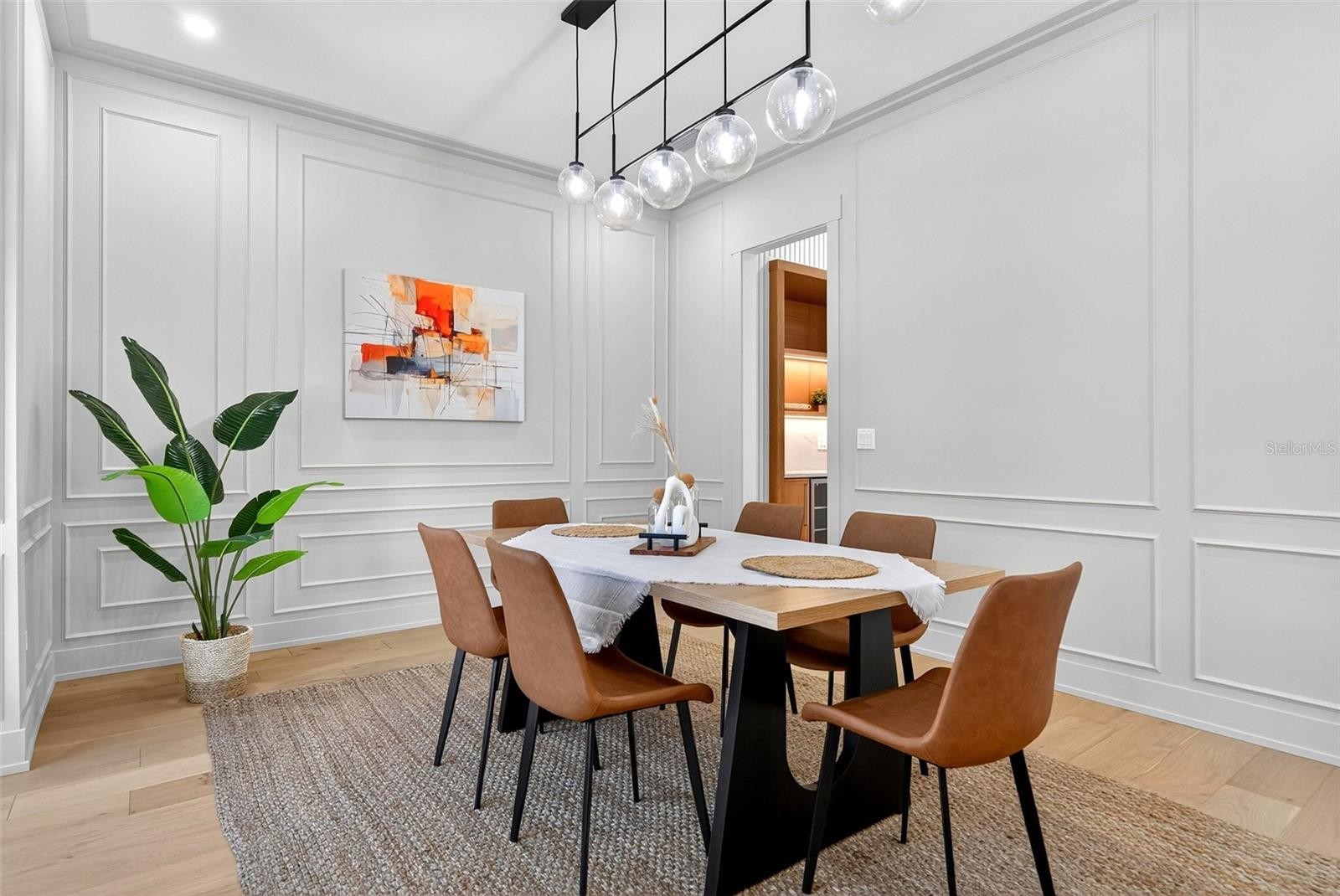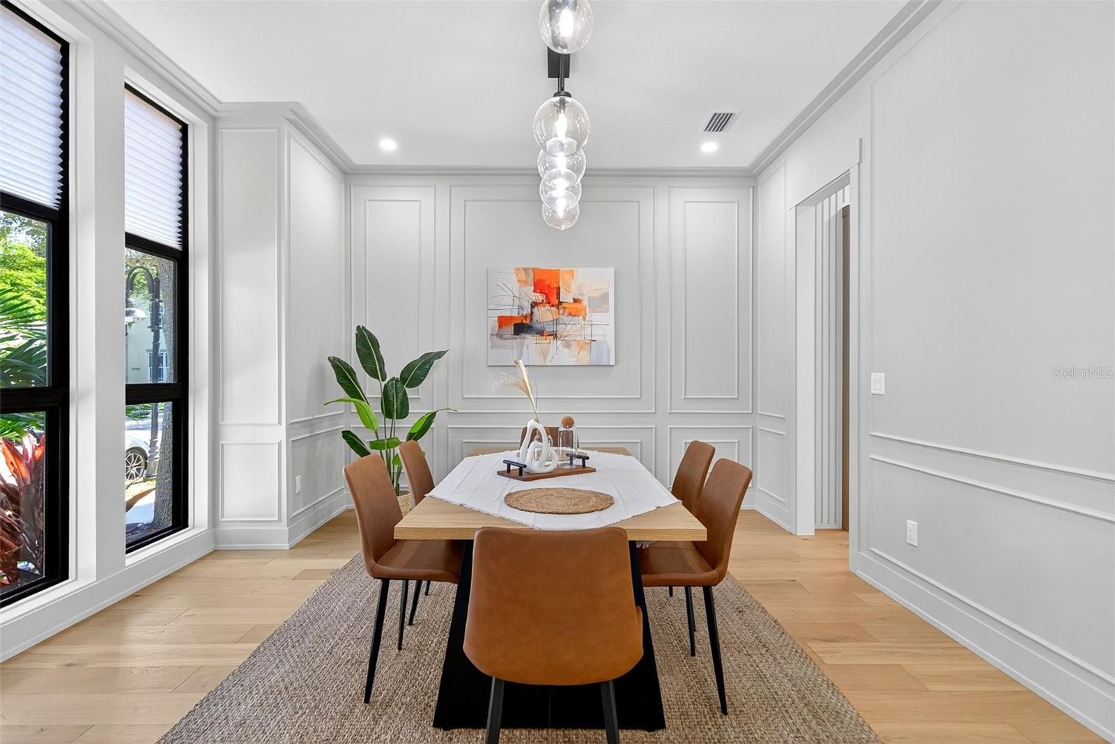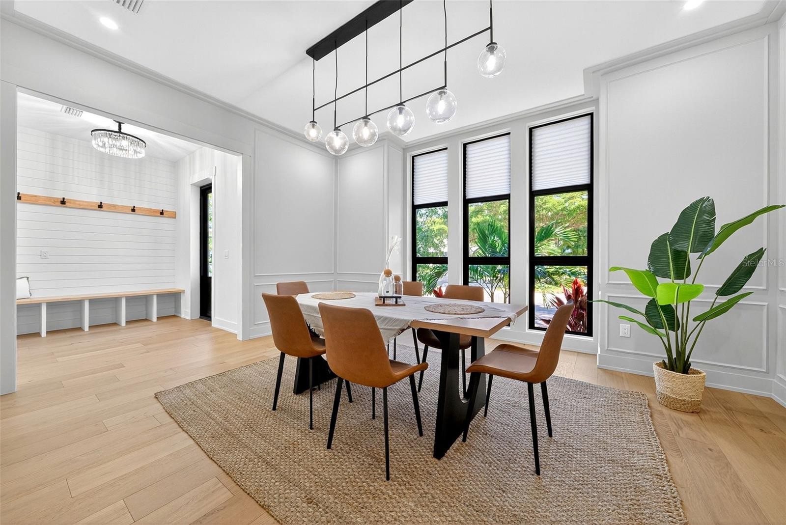 Brand new, impeccably designed modern home in the private, gated community of Granada Park. Welcome guests into the chic shiplap foyer, complete with a built-in bench and coat rack. An elegant dining room with custom millwork and a designer chandelier sets the tone for both casual gatherings and formal entertainment. The conveniently located butler’s pantry between the dining room and kitchen is equipped with a wine and beverage refrigerator, bar area, and a spacious walk-in pantry—making entertaining effortless. The kitchen is a chef’s dream, featuring custom cabinetry with matte quartzite counters, a large island with seating, and a Ruvati workstation sink with accessories. Premium Bosch appliances include a five-burner induction cooktop, convection oven with microwave, and under-counter lighting, complemented by an LG refrigerator and freezer and designer pendant lights above the island. Engineered hardwood floors throughout the main living areas provide warmth and sophistication. The spacious, light-filled living room showcases elegant millwork detail and an electric fireplace, opening to a large private terrace with a hot tub—perfect for relaxing or entertaining outdoors. The owner’s suite features a custom-designed accent wall, a large walk-in closet, and a private balcony. The spa-like owner’s bath includes a striking accent wall framing a freestanding tub, double vanities with Grohe plumbing fixtures, lighted vanity mirrors, a private water closet, and a seamless glass walk-in shower with rain head and handheld shower. Upstairs, the conveniently located laundry room includes a Samsung washer and dryer, built-in cabinetry, and tile flooring. The ensuite guest bedroom offers a private bath, while two additional guest bedrooms share a spacious hall bathroom with dual vanities, lighted mirrors, a tub and shower combination with handheld showerhead, designer pendant lighting, and classic penny tile details. An additional second floor large outdoor terrace with fireplace is perfect for watching football games and entertaining your guests. A charming mudroom with entry from the garage features a single vanity with sink, built-in coat rack, and shoe bench. The two-car garage offers high ceilings and keypad entry. Enjoy a prime location close to Publix, Southside Elementary School, Morton’s Market, Siesta Key Beach, and all that downtown Sarasota has to offer. Granada Park residents enjoy a community swimming pool, cabana, and a maintenance-free lifestyle—ideal for convenient, luxurious downtown living.
