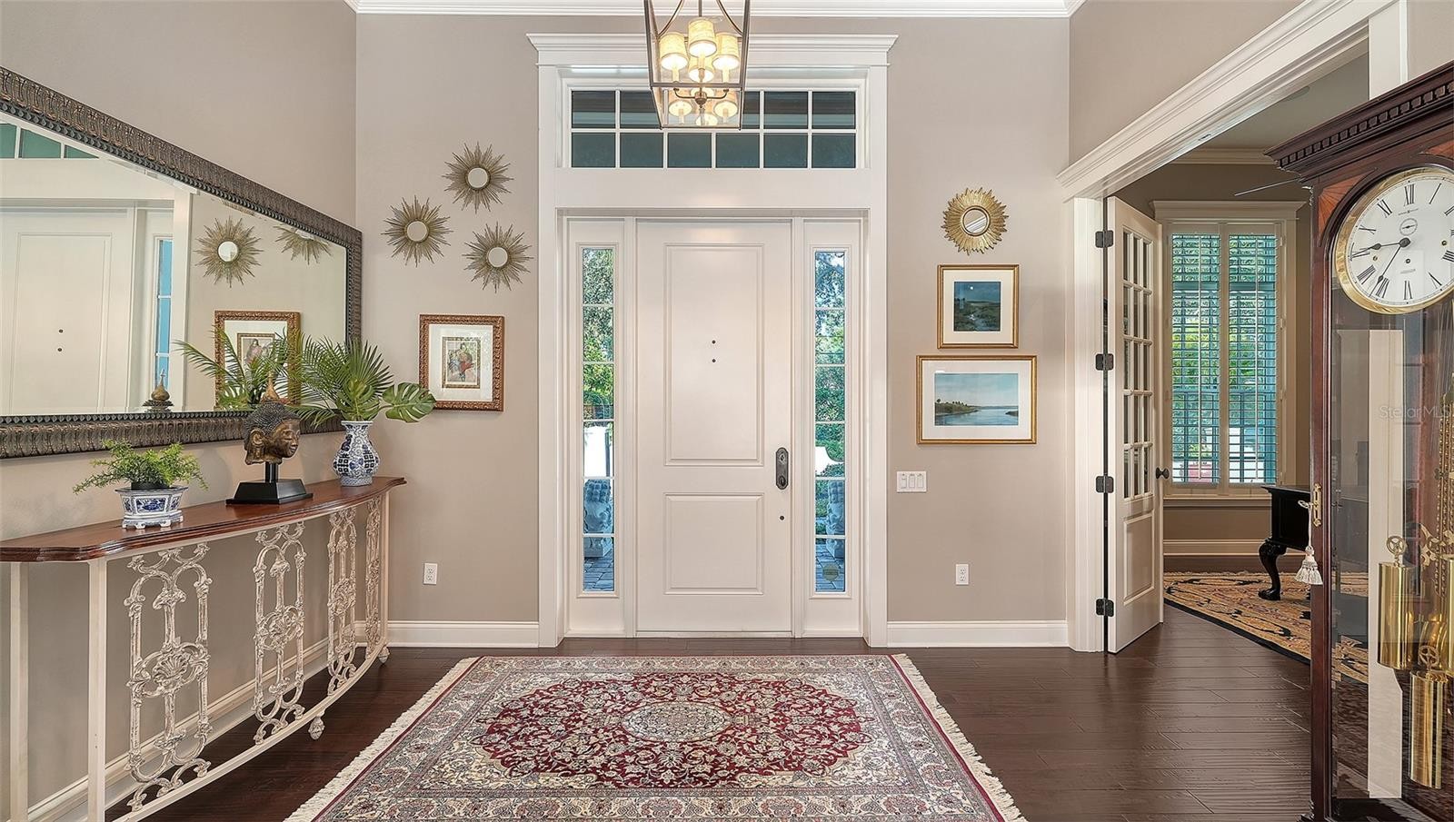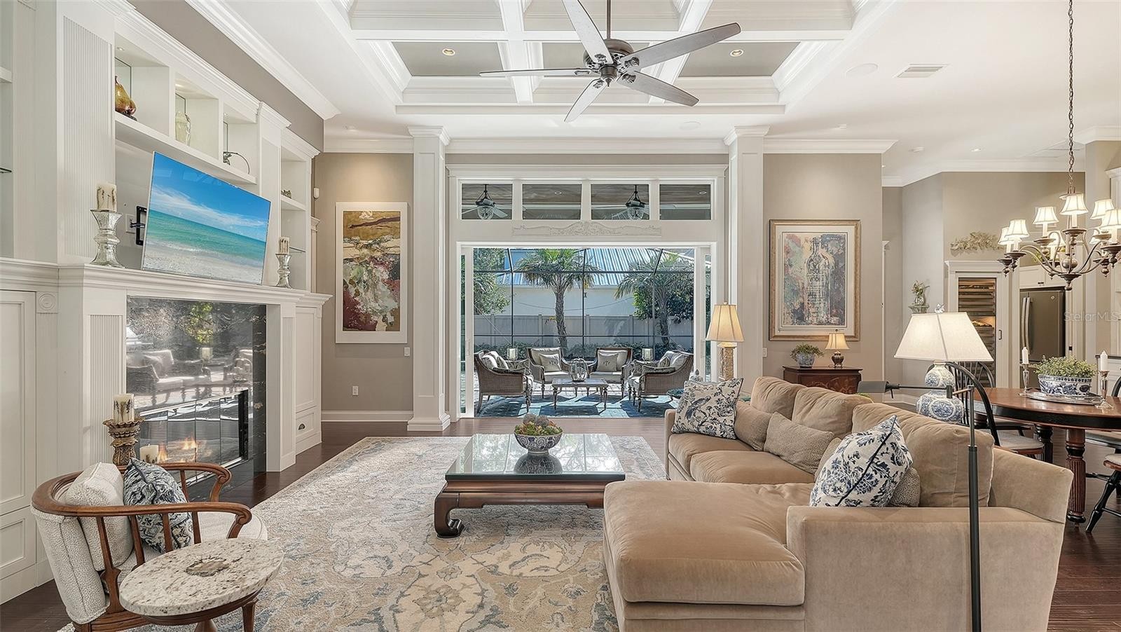 Simply stunning custom residence crafted by Todd Johnson, set within a private, oversized homesite west of the Trail. Designed for effortless one-level living, this refined home offers an open, flowing floor plan with three spacious bedrooms—each with an en-suite bath—plus a well-appointed powder room. Warm and inviting interiors feature rich wood floors throughout and generous living spaces ideal for both everyday comfort and elegant entertaining. A handsome study just off the living room showcases custom woodwork and built-ins, creating a distinguished retreat for work or reading. The gourmet kitchen is a standout, appointed with extensive cabinetry, a large center island, paneled appliances, gas cooktop, double ovens, a full-size wine refrigerator, and an oversized walk-in pantry. Expansive sliding glass doors open to a screened patio and pool area, seamlessly blending indoor and outdoor living. Designed with entertaining in mind, the outdoor space includes a built-in gas grill and refrigerator, a cozy fireplace, and a heated pool and spa for year-round enjoyment. A private massage room just off the patio adds a spa-like touch rarely found. Additional highlights include a side-load 2.5-car garage with abundant storage, an impressive 22-foot elevation—among the highest in the area—and construction with the highest quality materials, including full impact windows and doors for comfort and peace of mind. Ideally located within easy walking distance to Southside Village and Southside Elementary School, this exceptional home offers privacy, quality, and convenience in equal measure. Truly a residence that is sure to please.