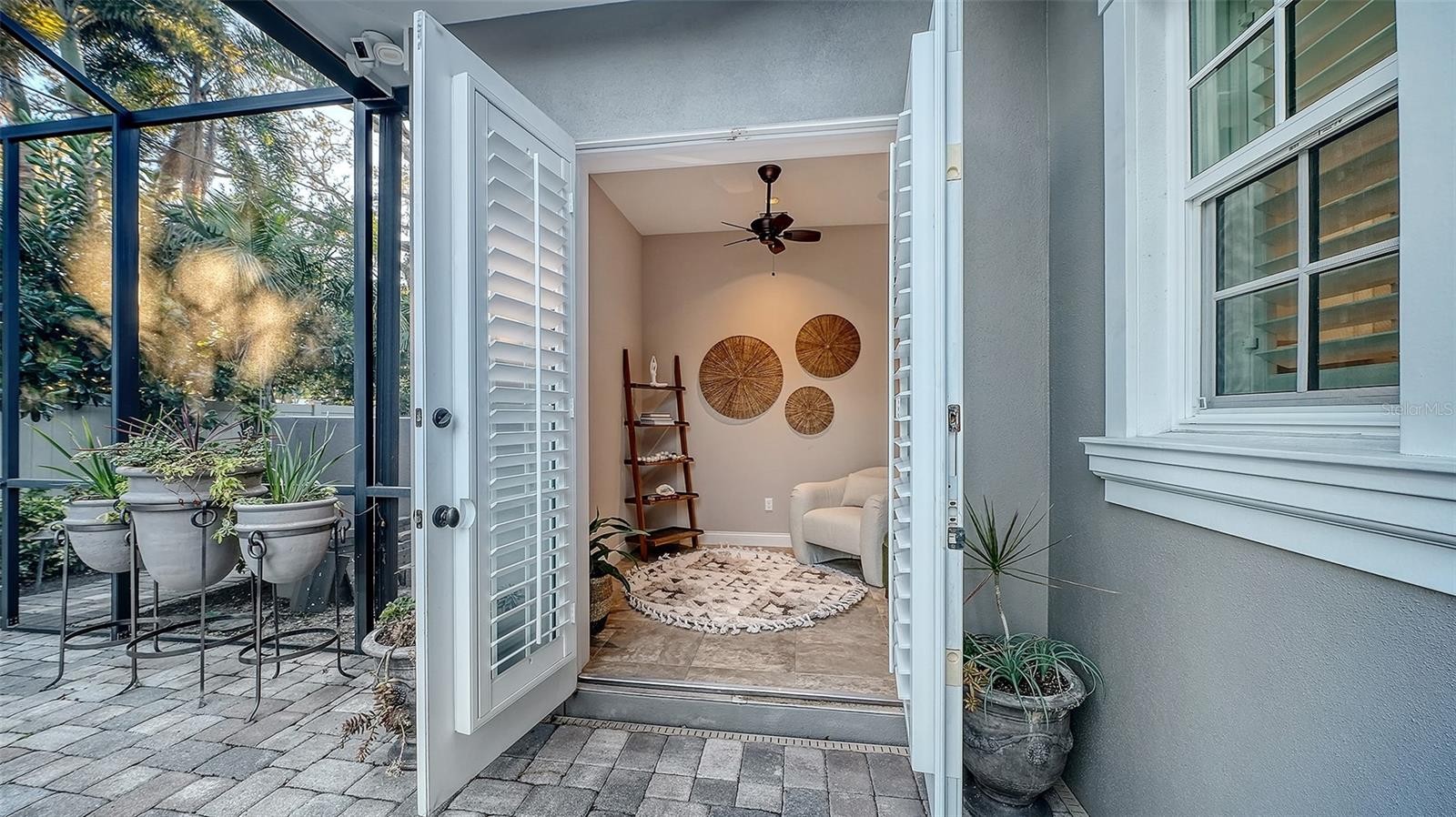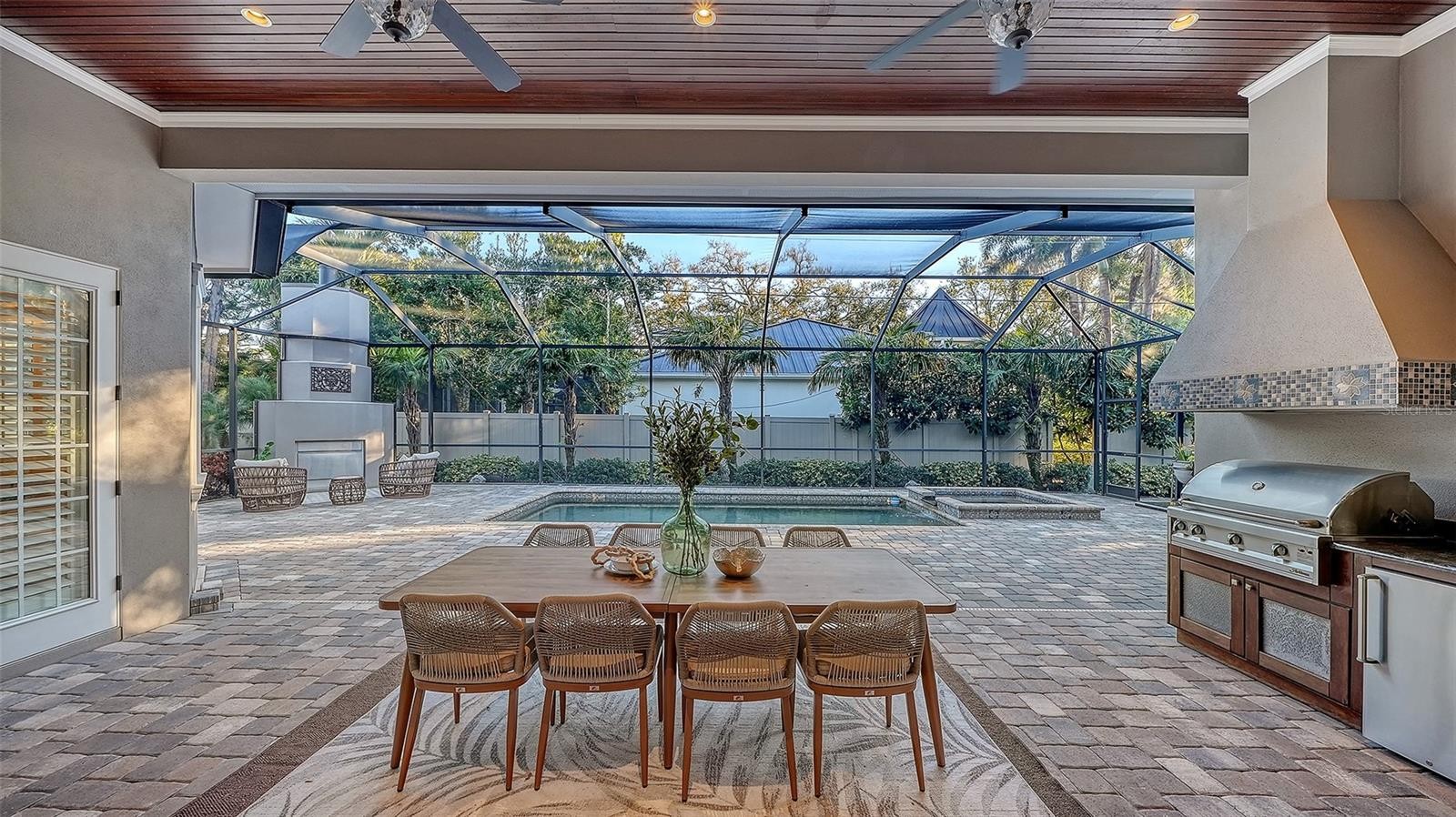 Simply stunning custom residence set within a private, oversized homesite west of the Trail. Designed for effortless one-level living, this refined home offers an open, flowing floor plan with three spacious bedrooms—each with an en-suite bath—plus a well-appointed powder room. Warm and inviting interiors feature rich wood floors throughout and generous living spaces ideal for both everyday comfort and elegant entertaining. A handsome study just off the living room showcases custom woodwork and built-ins, creating a distinguished retreat for work or reading. The gourmet kitchen is a standout, appointed with extensive cabinetry, a large center island, paneled appliances, gas cooktop, double ovens, a full-size wine refrigerator, and an oversized walk-in pantry. Expansive sliding glass doors open to a screened patio and pool area, seamlessly blending indoor and outdoor living. Designed with entertaining in mind, the outdoor space includes a built-in gas grill and refrigerator, a cozy gas fireplace, and a heated pool and spa for year-round enjoyment. A bonus room just off the patio adds additional private space. Highlights include a side-load garage with abundant storage, an impressive 26-foot elevation—among the highest in the area—and construction with the highest quality materials, including full impact windows and doors for comfort and peace of mind. Ideally located within easy walking distance to Southside Village and Southside Elementary School, this exceptional home offers privacy, quality, and convenience in equal measure. Truly a residence that is sure to please.