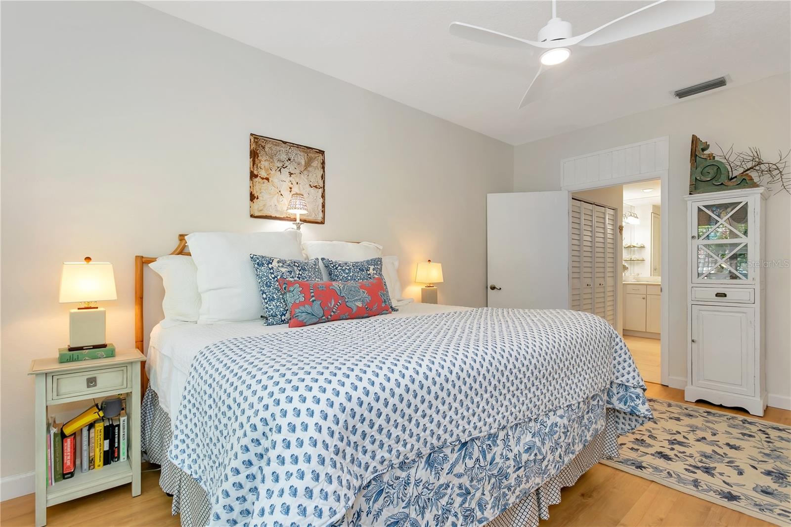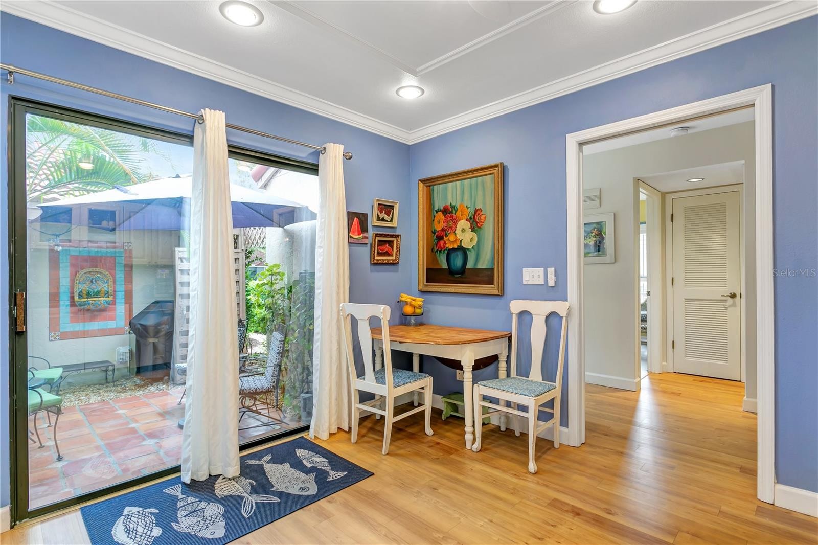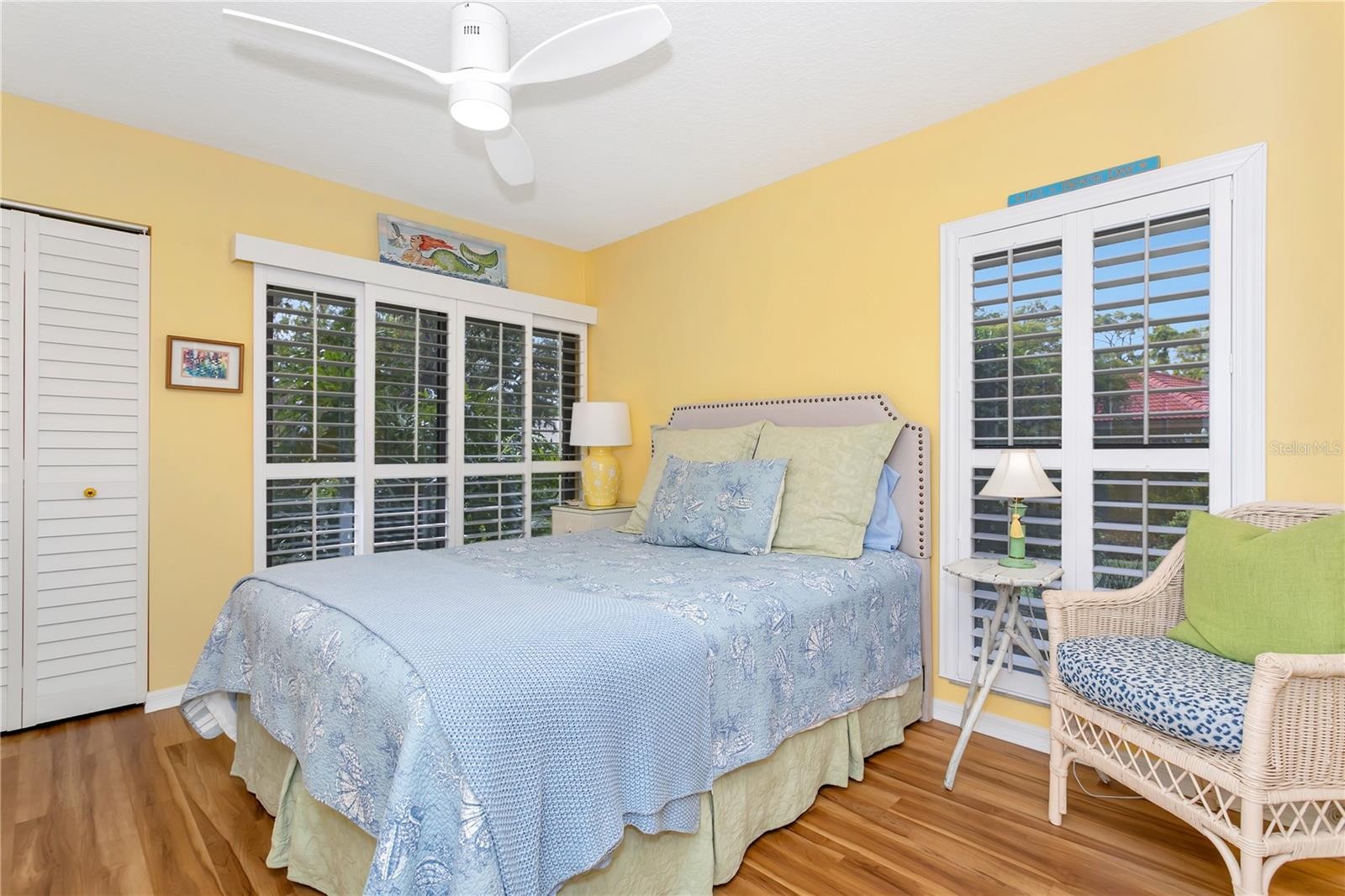 THIS RARELY AVAILABLE and highly sought-after Landings Carriage Home, nestled within mature landscaping and offering verdant vistas from every room, is ready for its next owner. This residence lives like a single-family home, featuring a charming living area with a wood-burning fireplace, custom mantle, glass-topped shelf divider, and LVT plank flooring. Abundant windows fill the home with natural light, while plantation shutters provide privacy and character. The surrounding landscaping includes hibiscus, palms, ferns, and flowering trees, supported by an irrigation system, creating a peaceful garden setting. A paver driveway and walkway enhance the welcoming curb appeal. The split floor plan offers privacy, with a spacious primary suite featuring a dressing-room-style closet. The updated primary bathroom includes a walk-in shower with travertine, stone vanity top, high ceilings, and mirrored and tiled accents. The suite also features a ceiling fan and access to a private patio. The guest bedroom offers two closets and a full patio door for natural light. The second bathroom includes a granite-top vanity and tub/shower combination. The dining area is highlighted by a coastal-style glass bead chandelier. A glass-enclosed lanai provides flexible space for an office, den, or guest area. The kitchen features newer stainless steel appliances, granite countertops, a breakfast area, and a patio door leading to a private walled courtyard with a ceramic tiled fountain—ideal for relaxing or outdoor dining. Residents of The Landings enjoy scenic nature trails leading to Roberts Bay, along with a private fishing gazebo and kayak launch. Conveniently located between the Siesta Key bridges and approximately seven miles to downtown Sarasota. THIS IS THE LOCATION!! New additional gutters (2025), new TPO lanai roof (2026), new barrel tile roof (2022 association maintained), tankless hot water heater, new GE stacked full size washer and dryer with wifi capability (2021), new stainless steel Kitchen Aid appliances (2023), new garbage disposal (2024), new wifi controlled thermostat (2022), newer A/C system, create a home for you to easily move right into. Landscaping and building exterior maintenance are included in the monthly fees, so you are free to take advantage of the ideal Landings location—strategically developed as one of Sarasota’s premier gated communities with optional Racquet Club membership with 8 Har-Tru tennis courts, pro shop, fitness center, meeting rooms, pool and spa. The Landings has a lush well maintained nature trail that leads to Roberts Bay with a private fishing gazebo and rental space to park your kayak. Midway between the two Siesta Key bridges and approximately 7 miles from downtown—this is THE LOCATION.”