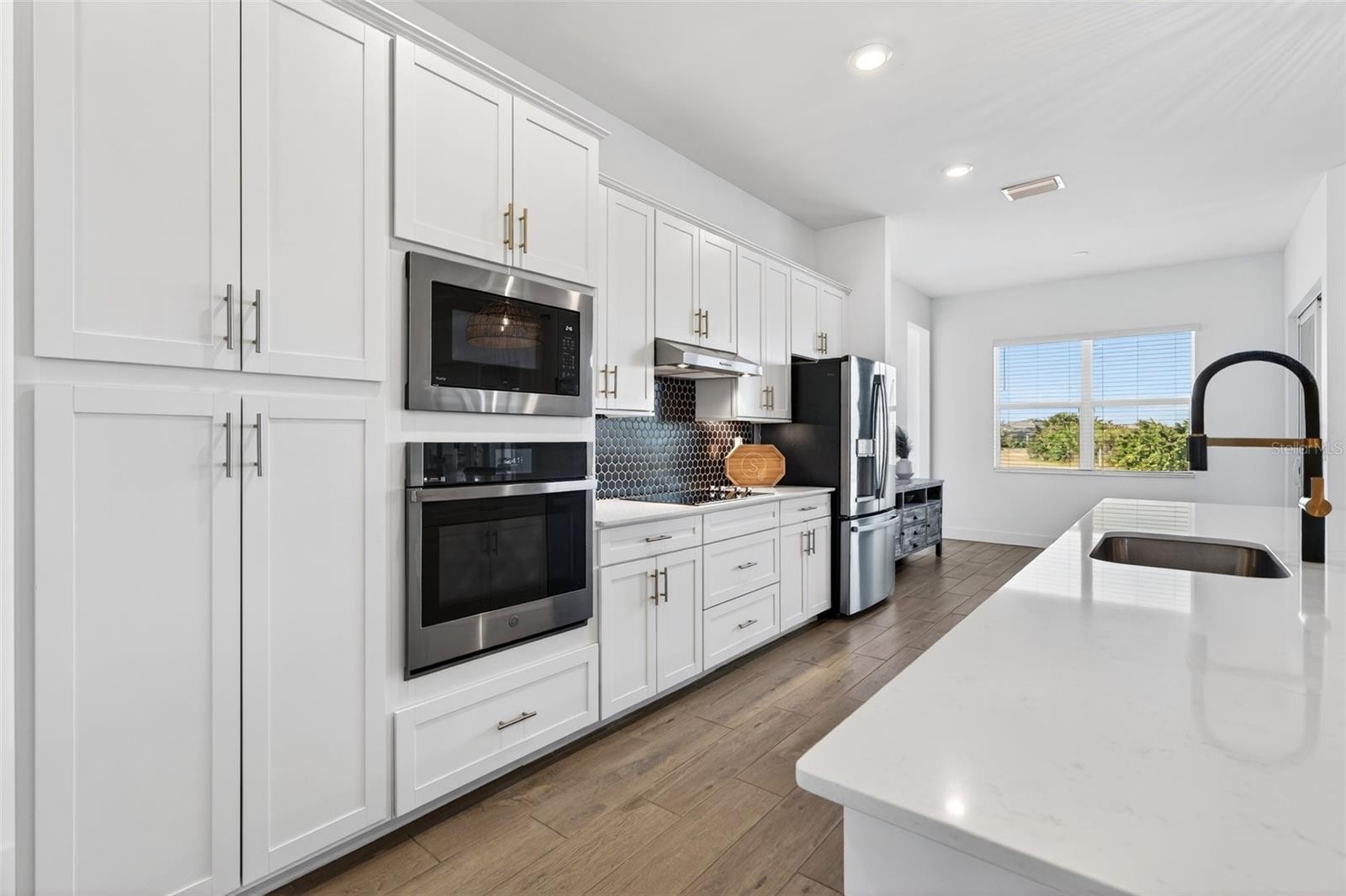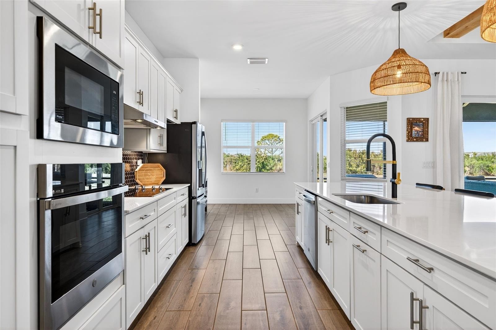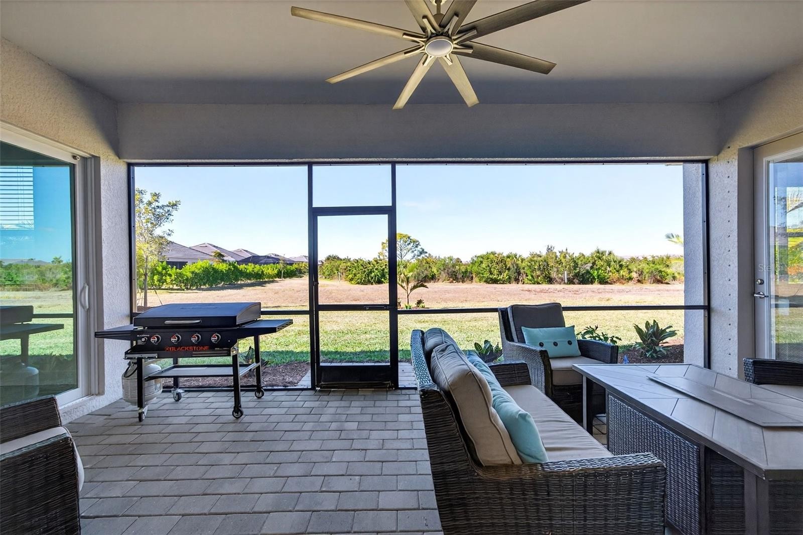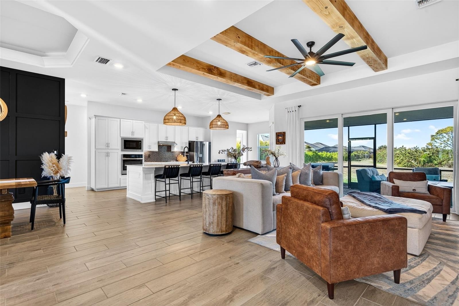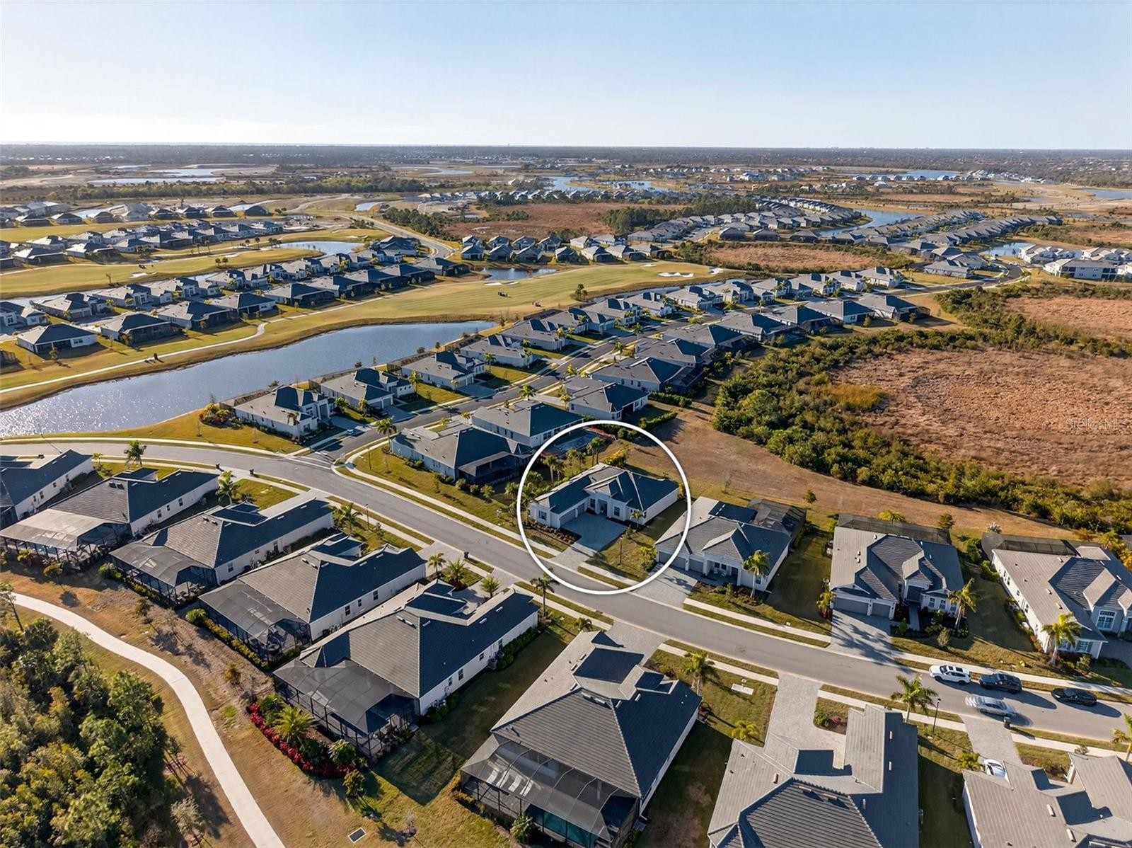 Rare golf-deeded estate home in Wellen Park Golf & Country Club offering private preserve views, refined upgrades, and resort-style living. Refined coastal architecture, a paver driveway, and a desirable side-entry three car garage create a striking first impression. Inside, the bright open layout features soaring ceilings, custom wood beam accents, and curated finishes that blend warmth with modern sophistication. Architectural upgrades include tray ceilings with crow molding, upgraded baseboards, and refined millwork details. The great room showcases a statement fireplace wall and expansive sliding glass doors framing peaceful preserve views. The gourmet kitchen impresses with an oversized island, quartz surfaces, premium cabinetry, stainless steel appliances, and designer tile backsplash. The private owner's retreat offers a spa-inspired bath and custom walk-in closes, while guest bedrooms provide comfort and privacy. Enjoy sunset skies and preserve privacy from the covered lanai. The epoxy-finished garage includes overhead storage for maximum functionality. Golf-deeded ownership includes championship golf, resort amenities, clubhouse, dining, fitness center, tennis , and pickleball, plus access to Downtown Wellen and Golf beaches minutes away!