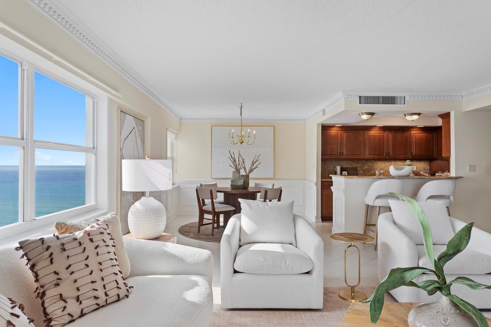 Welcome to your direct beachfront 2 bedroom, 2 bath condominium located in the highly desirable Key Tower South on Lido Key featuring panoramic views of the Bay, Ringling Bridge, Sarasota City skyline and Gulf of Mexico. Enter through the front door of this corner unit into a welcoming foyer, ideal for showcasing large-scale artwork, where the eye is immediately drawn toward the light-filled main living and dining area beyond. The open layout is beautifully accented by hand-laid dentil and picture frame molding, creating a sense of timeless refinement. The dining room is perfectly positioned to capture the mesmerizing Gulf view and sunsets, while the adjoining enclosed Florida Room reveals sweeping vistas of Sarasota Bay, the Ringling Bridge, and the Downtown skyline—a front-row seat to dazzling fireworks and twinkling city lights. The kitchen combines classic craftsmanship with thoughtful design, featuring wood cabinetry, granite countertops, and a peninsula with generous seating for casual dining. Tile flooring flows throughout the main living spaces, enhancing the coastal ease of this well-appointed home. The primary suite is a serene retreat, offering gorgeous water views, new plush carpeting, and private access to the Florida Room. A spacious walk-in closet provides ample storage, while the en suite bath showcases granite countertops and a tub-shower combination. The guest bedroom is equally inviting, featuring new carpet, a walk-in closet, and stunning views that mirror the home’s tranquil setting. Additional conveniences include a dedicated covered carport and private storage locker located in the shared laundry room. Key Tower South is a meticulously maintained beachfront community boasting 201 feet of pristine Gulf frontage. Residents enjoy a heated beachside pool with an expansive sundeck for soaking in the endless horizon, as well as direct access to the sugar-white sands just steps from home. The first-floor community spaces were fully remodeled in 2025, offering a stylish and welcoming lobby, fitness room, library, and social room with a catering kitchen—perfect for gatherings. Additional amenities include saunas with showers, bicycle storage, and on-site management ensuring effortless living. Set on the quiet, walkable streets of Lido Key, the neighborhood offers a relaxed, beachside lifestyle. Spend your days exploring South Lido Park’s nature trails and kayak launches, strolling to the boutique shops and cafés of St. Armands Circle, or crossing the iconic Ringling Bridge into downtown Sarasota’s vibrant cultural and dining scene. Even SRQ Airport is just minutes away, adding convenience to this idyllic coastal address.