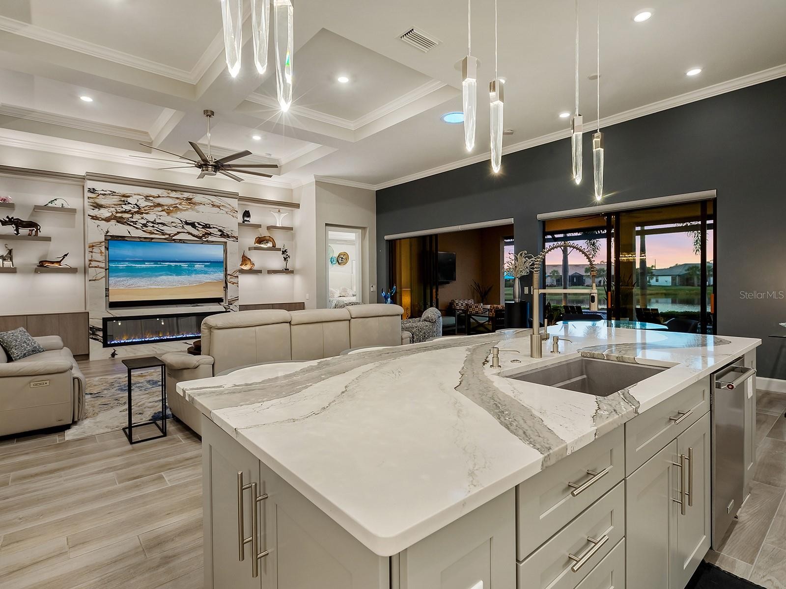 Filled to the brim with clever and beautiful upgrades, this fully FURNISHED home on a prime lakefront lot is the crowning jewel of Del Webb, Lakewood Ranch's premier 55+ active adult community. Starting with this spacious single level floor plan, the owners made numerous upgrades enhancing the beauty; and then expanded on those upgrades throughout 2022 to 2025 improving the form, function and appearance of this residence even more. From the moment you enter you will be greeted by upscale front landscaping with rocks and lights, large lake views, wood-look porcelain plank flooring throughout, an open floor plan ideal for entertaining and custom upgrades in every room that make this home truly one of a kind. The central great room boasts a 2023 feature wall with custom built-in cabinetry and under-lit floating shelves, a full porcelain wall with 85” TV, built in sound system, electric fireplace and solar skylights, plus coffered ceiling and wall of sliding glass doors to the lanai. The opulent formal dining room features a showstopping custom dry bar added in 2023 with granite counters, crackle glass display cabinets, and custom handpainted backsplash, plus 2023 crystal chandelier. The chef’s kitchen shines with 2023 Calacatta quartz island counter, 2023 crystal pendants, custom two-tone cabinetry with additional lit upper glass displays, walk-in pantry, and adjacent dinette. The stainless-steel appliance suite includes 2021 induction cooktop (pre-plumbed for future gas cooktop if desired), dishwasher, 2023 Advantium built-in microwave and wall oven, and refrigerator. Through the sliding glass doors, take in the gorgeous lake views from the 2021 paver lanai with summer kitchen, pool and motorized hurricane screens. Enjoy meals alfresco from the outdoor kitchen with stainless steel grill, dual-drawer bar fridge and side burner. Lounge by the lakeside in your custom 2021 pool with large sunshelf, raised spa, fire bar, water features and surrounded by panoramic screen enclosure with additional integrated sunshade for privacy on the east side. Inside the primary bedroom is your private oasis with sunset lake views, large walk-in closet with custom shelving and spa-like bathroom with oversized walk-in shower. Guests will cherish the two guest bedrooms and two full guest bathrooms outfitted with luxe upgrades. When you’re ready for privacy, retreat to the study with dual walls of desks and storage. Also included in this impeccable residence is a laundry room with 2023 floor-to-ceiling storage cabinetry and large folding counter, along with an expanded 3-car garage with its own air conditioner and workshop space. Enjoy premium peace of mind with a 2023 Kohler whole-house GENERATOR and 2023 whole-house storm power and roller shades. Additional upgrades include blackout window treatments, 2023 gas pool heater and salt cell and 2023 upgraded front landscaping. Offered fully FURNISHED, this residence is ready for you to move in right away! Del Webb is a premier 55+ active adult, gated community with extensive resort-style amenities and social activities including an expansive clubhouse, restaurant, fitness center with classes, resort-style pool, lap pool and spa, outdoor and events areas, dog park, tennis and pickleball courts, social clubs and events, full-time lifestyle director and more! Lakewood Ranch is the top multi-generational community in the country for seven years in a row with plentiful shopping, dining, parks and nearby beaches.