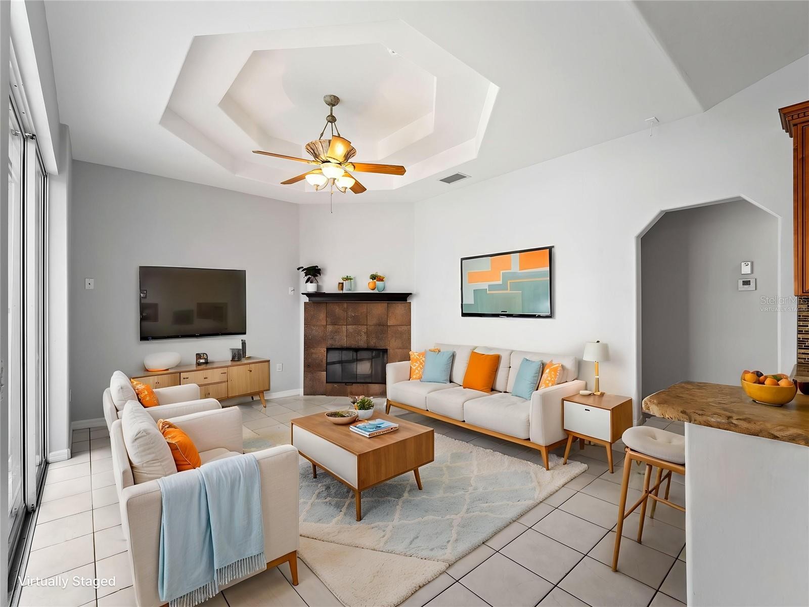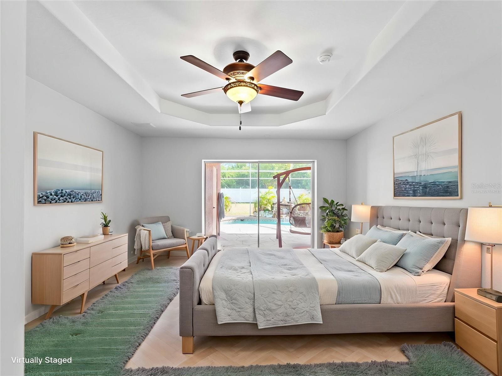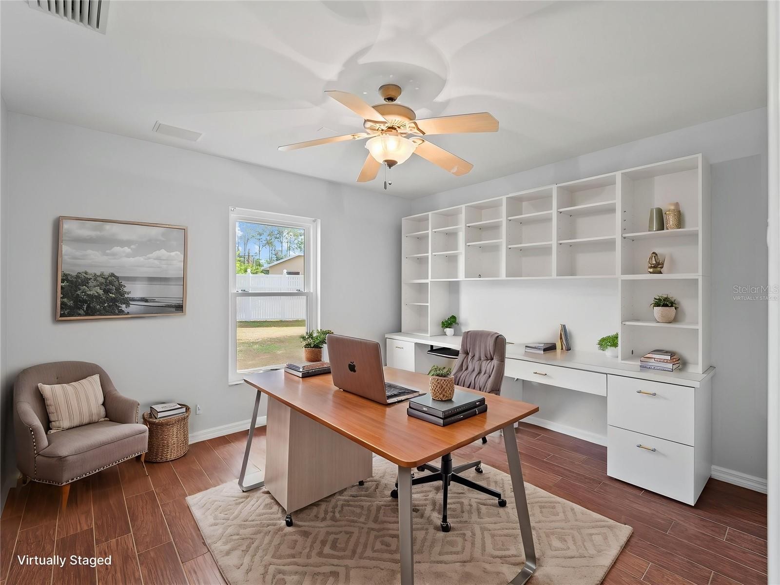 This custom built one owner home will greet you with an extended driveway, fresh new exterior paint and a new roof in 12/2022. Walk through the double glass doors and get the feeling of wonderful spaciousness with soaring cathedral ceilings, crown molding, pocket sliding glass doors opening up to your large covered lanai, beautiful pool with soothing waterfall and privacy fenced back yard. But wait there is so much more to this home! Just inside the front door to your right is your light and bright dining room with built in cabinets. Back to the left is your luxurious master suite with octagonal tray ceiling and double pocket sliding glass doors looking over your lanai and pool. The master bathroom features a jetted tub, walk in shower, dual sinks and water closet, two walk in closets complete the suite. Walk back through the living room and dining area and into your kitchen and family room, The kitchen features custom cabinetry and Cambria quartz countertops, all soft close doors and drawers with pullouts and newer appliances. Two very nice features are the pantry closet and the built in desk area beside the breakfast nook with aquarium window over looking, your wonderful pool and backyard, no neighbors in sight :) The family room features a double octagonal tray ceiling, wood burning fireplace and three pocket sliding glass doors overlooking the pool and is wired for sound. Your guests can have their privacy or you can have your privacy, if you work from home, as the hall door closes to shut out the bathroom, and two bedrooms. One bedroom has a built in desk and shelves perfect for those that work at home. The whole interior has been freshly painted including the garage floor, electric hurricane shutters for the front and lanai areas, the other windows not covered by the shutters are impact as well as roll in for easy cleaning from the inside. Take note that with this custom home you have an additional linen closet in the master bath, guest bath and utility room. The home is powered by solar which will convey with no lien. Backyard shed to store your yard equipment. Easy to see, this could be home.