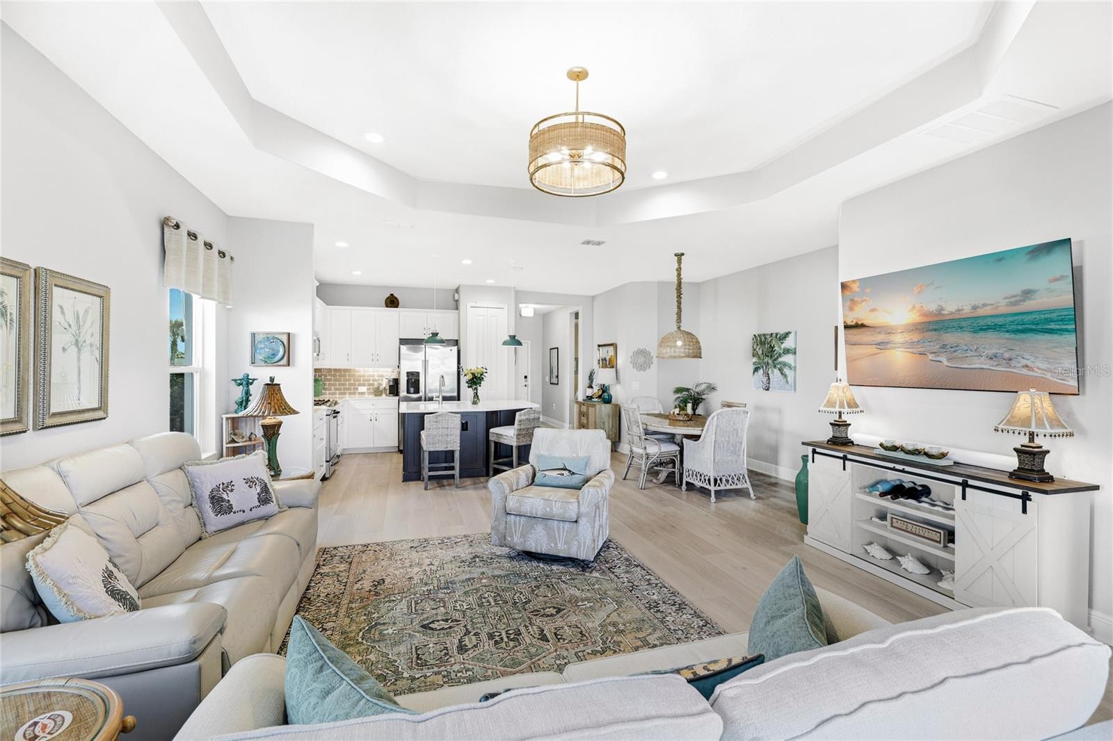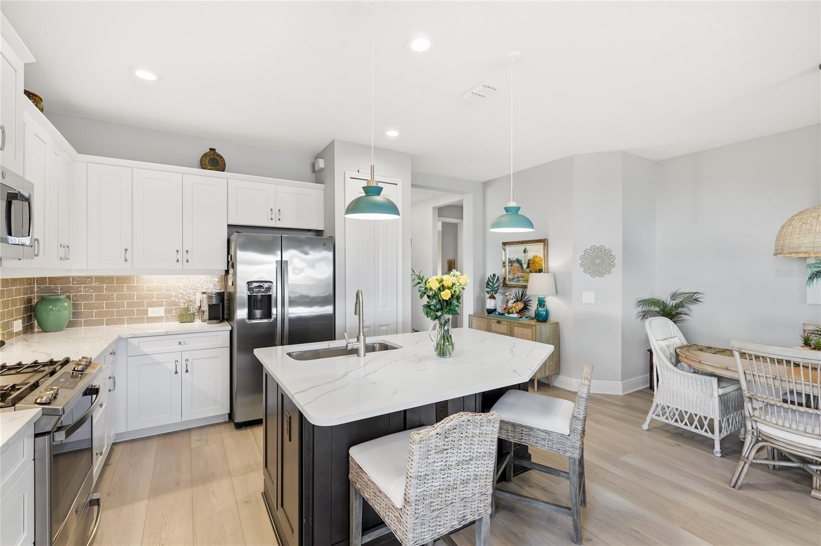 This exceptional, like new 2023 Tidewater Villa shows better than a model home, highlighting the seller’s exquisite design choices and décor throughout. Perfectly situated at the end of a quiet cul-de-sac, the home features an extra-long, curved driveway providing ample additional parking for family and guests. This thoughtfully upgraded 2-bedroom, 2-bath villa with a den/office and 2-car garage offers serene lake views and a bright, open layout designed for comfortable living and effortless entertaining. Notable upgrades include lush enhanced front landscaping, a custom kitchen backsplash, luxury vinyl plank flooring throughout the main living areas and bedrooms, upgraded floor tile in the bathrooms and wall tile in the primary shower, 8-foot interior doors, tray ceilings, designer lighting in the kitchen, great room, and primary bathroom, and ceiling fans in both the primary bedroom and lanai. Additional highlights include an upgraded laundry room with extra cabinetry for enhanced functionality, whole house impact-resistant glass windows and doors, a reinforced garage door, and wood-look cordless push-up blinds for added safety and style. The stunning kitchen serves as the heart of the home, showcasing Calacatta Novella quartz countertops, GE stainless steel appliances with a slide-in gas range, pull-out pot and pan drawers, LED under-cabinet lighting, upgraded pendant lighting, and timeless finishes that are perfect for everyday living and entertaining. The primary suite is a peaceful retreat with views of lush landscaping and a long lake view, featuring a spa-inspired ensuite with dual vanities, a walk-in shower, and a private water closet, while guests enjoy the privacy of their own separate wing. The den, enhanced with solid French doors, offers flexible space ideal for a home office, media room, or additional guest accommodations. The extended screened lanai features upgraded pocket sliders, a remote-controlled interior privacy shade, two exterior pull-down lanai shades/screens, a gas stub and barbecue paver pad, creating an ideal setting for seamless indoor-outdoor living and entertaining. The two-car garage is functional space with extra shelving and a pull-down ladder, providing convenient access to additional storage. Located within the highly sought-after community of Wysteria, residents enjoy resort-style amenities including a pool, spa, pickleball courts, and pavilion, with HOA fees covering lawn care, trimming, mulching, fertilizer, irrigation, cable, and internet for truly low-maintenance living. Ideally located just minutes from Downtown Wellen Park, CoolToday Park, dining, shopping, Publix, Costco, schools, future medical facilities, and Gulf beaches, this golf-cart-friendly community places the best of Southwest Florida at your doorstep. This beautifully upgraded, move-in-ready home presents a rare opportunity to own one of the premier lot properties in Wysteria and begin enjoying the Florida lifestyle today.