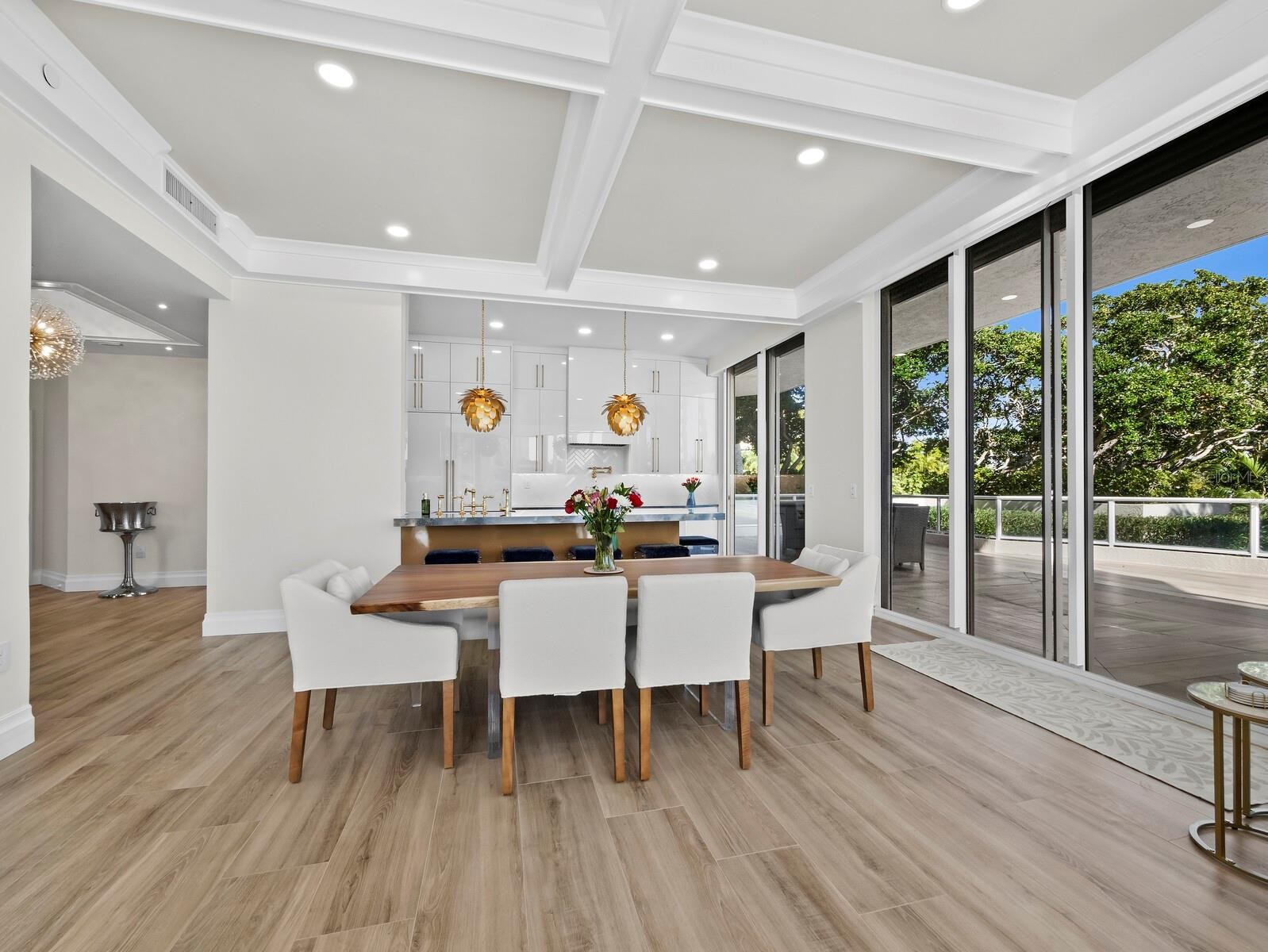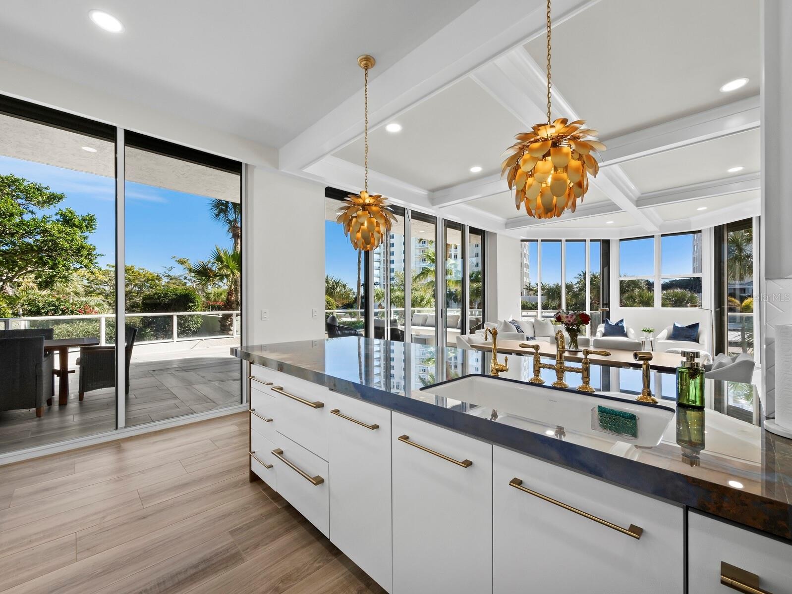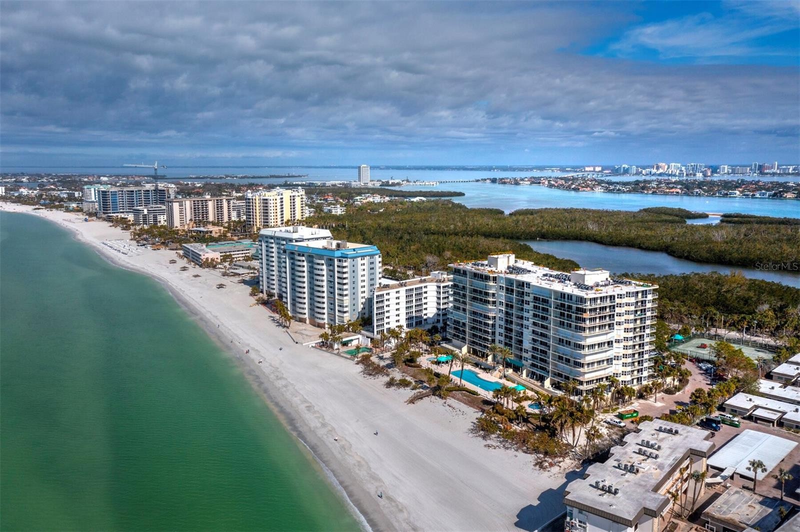 Designer finished and absolutely stunning, this condo is quintessentially L'Elegance. Just through the guarded gate of the highly sought-after L’Elegance on Lido Beach, this rarely available first-floor corner residence offers the perfect blend of refined luxury and effortless beachfront living. Completely renovated from top to bottom, this 3-bedroom, 3-bath condo showcases designer, high-end finishes throughout, creating a sophisticated yet welcoming coastal retreat. With higher ceilings unique to these residences and expansive floor-to-ceiling windows in every room, natural light fills the almost 2,000 square-foot interior, enhancing the home’s open and airy feel. Located on the amenity level with easy access to the lobby for enjoying the sunset beach views, the fitness center with his and hers saunas, billiards and card room, and pool and beach, these spaces become an extension of your own living space. On the desirable south end of the building, this home is distinguished by an extraordinary 50’ x 20’ private terrace—one of the largest you’ll find in any beachfront condo. Porcelain tile flooring extends from the inside out, expanding the interior living to the outside where the massive balcony is surrounded by lush landscape. Quietly positioned on the south end of Lido Beach, yet just minutes from the world-class dining and shopping of St. Armands Circle and downtown Sarasota, the location is unbeatable. This residence has undergone a complete down to the studs renovation with no detail overlooked. All new drywall with smooth finish, a new plumbing stack, upgraded electrical and new panel, a fully reimagined floor plan set the foundation for this high-end transformation. Thoughtful and elegant designer updates include all-new HVAC and water heater, and laundry cabinetry with premium fixtures, all new appliances, designer lighting and ceiling fans, upgraded base moldings and coffered ceilings, and a spa-inspired primary bath with steam shower. Custom built-in closets throughout, motorized shades throughout the unit, and a murphy bed with integrated desk in the second bedroom complete this exceptional offering. A rare opportunity to own a truly luxuriously finished condo - this one must be seen to fully appreciate the craftmanship and timeless design. L’Elegance is known to be a friendly and well-managed beachfront community, offering 400 feet of deep, private beach just steps from the heated swimming pool. Residents enjoy 2 Har-Tru tennis courts, kayak access, garage parking, and the peace of mind provided by a full-time, on-site manager and maintenance staff. This is a unique opportunity to enjoy a completely reimagined luxury residence in one of Lido Beach’s most desirable buildings—where elegance, comfort, and coastal living come together beautifully. And if this all wasn't enough, this building is pet friendly allowing large dogs!