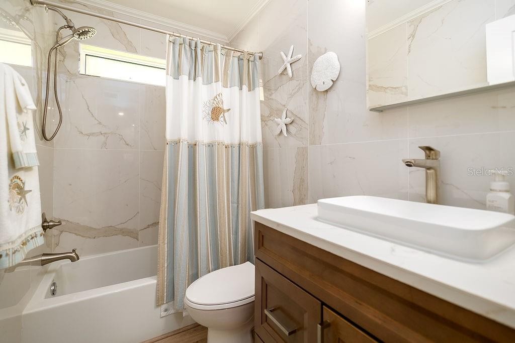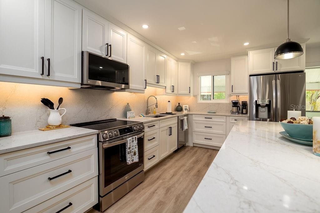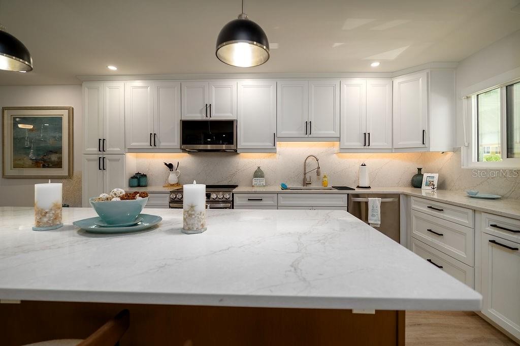 SPECTACULAR! One of the nicest condos in Runaway Bay! Step into luxury with this impeccably designed condo, beautifully redone in late 2023/early 2024 with over $150,000 in high-end renovations. Every detail has been thoughtfully created to deliver contemporary style, exceptional functionality, and long-lasting quality. This fully remodeled, 2 Bed/2 Bath second floor corner unit has a lovely view of RAB’s iconic lagoon, including two fountains. It is one of the very few condos on the property that sustained no damage during and after the two hurricanes in 2024. This turnkey, modern condo is move-in ready and waiting for you! HIGHLIGHTS & UPGRADES Impact (Hurricane) windows and doors installed in late 2023 (insurance approved, which resulted in a significant reduction in the homeowner’s insurance rate)! New water heater in late 2023 and new HVAC IN 2020.Two spacious bedrooms & two beautifully redesigned bathrooms. Primary bathroom expanded by an additional three feet. Beautiful large format porcelain wall tiles in both bathrooms. Primary suite and second bedroom feature custom built-in closet systems. Luxury vinyl plank flooring throughout. GORGEOUS custom kitchen with: large center island, soft-close cabinetry, Quartz countertops & matching backsplash, under-cabinet lighting, and new print proof stainless-steel appliances. Recessed LED lighting with dimmers and designer window coverings! All solid-core interior doors. Smooth finish ceilings and walls for a sleek, contemporary look. Full-sized washer and dryer included. Stylish turnkey furnishings—many pieces from Pottery Barn, Crate & Barrel, and Wayfair—are included for a ready-to-enjoy living experience. Roof replaced in late 2024/2025, offering long-term durability. Whether you're looking for a year-round residence, a seasonal escape, or a smart investment rental property, this beautifully updated condo delivers unmatched quality, comfort, and modern living—all in a truly move-in-ready package.