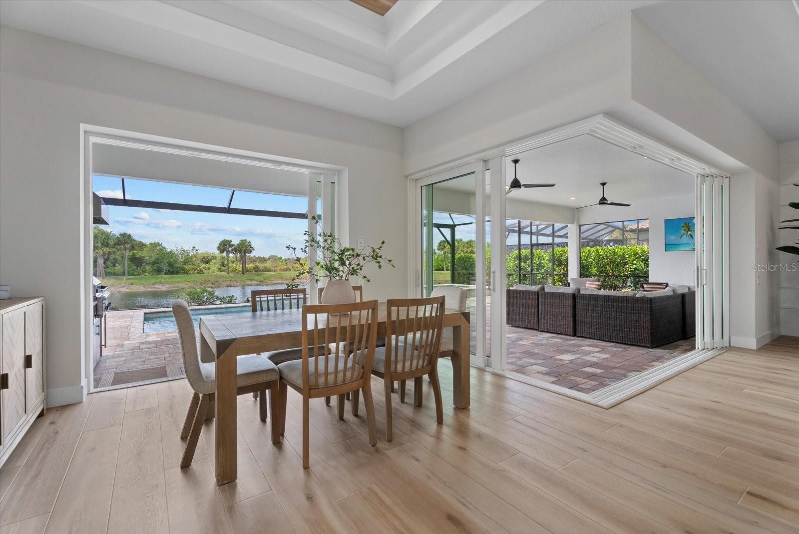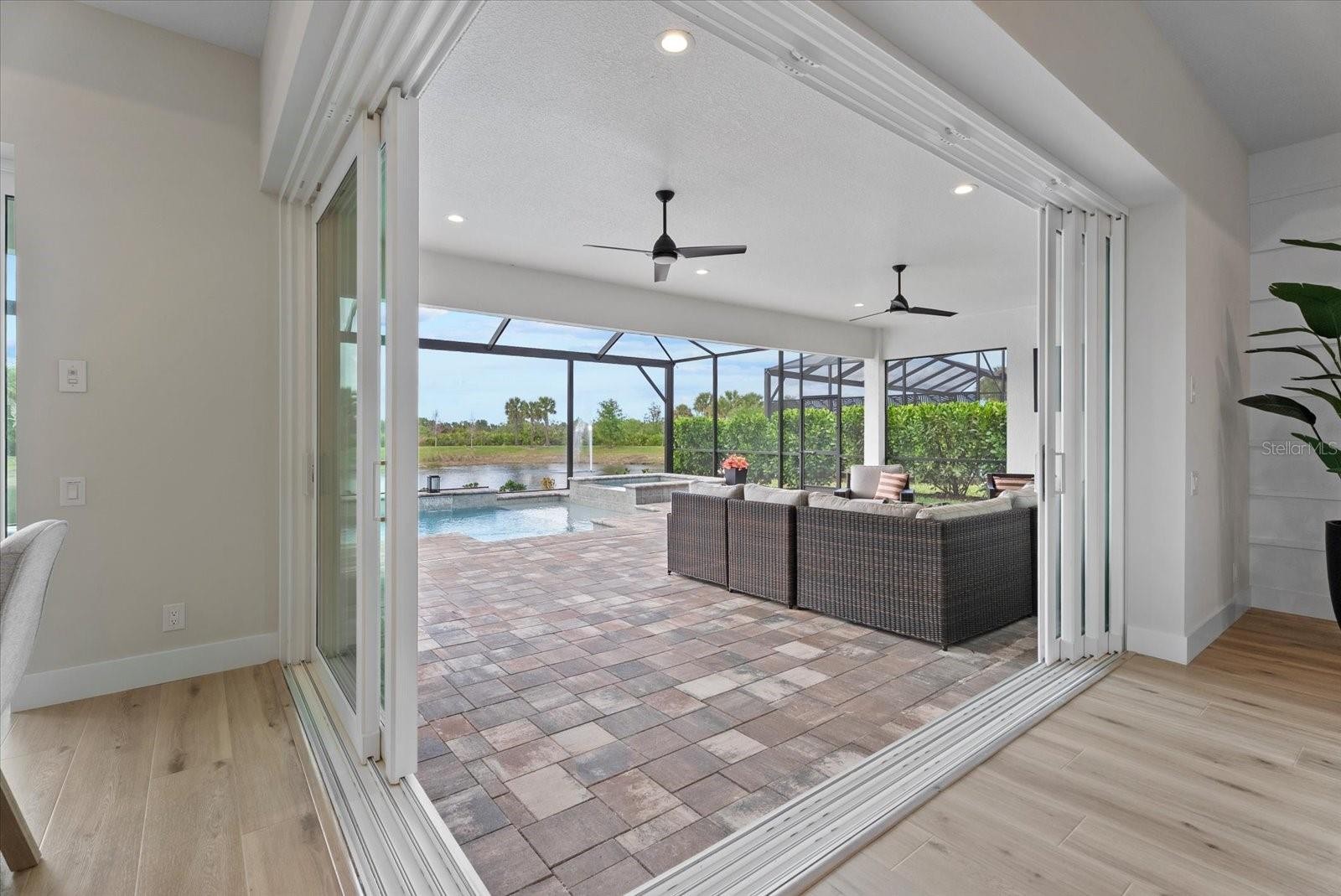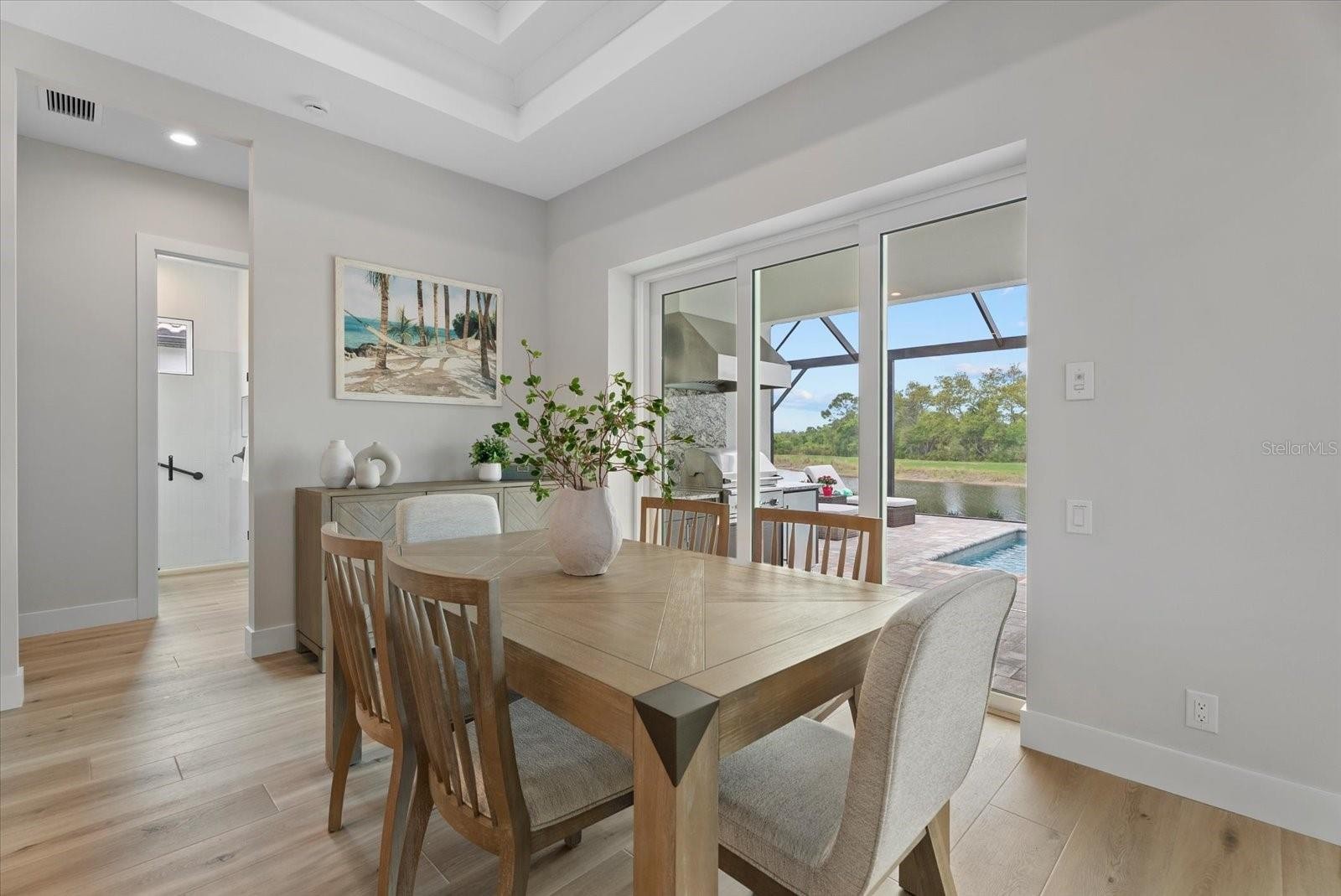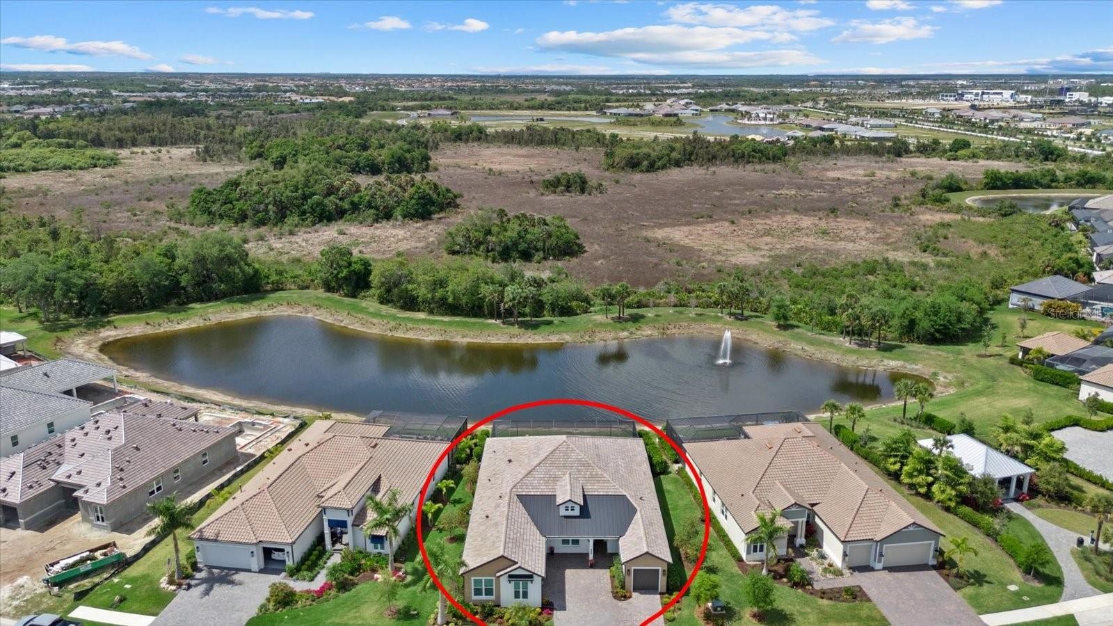 Experience elevated Florida living in this exceptional 4-bedroom, 3 full bathroom, 3 1/2 Car Garage residence offering over 2,900 square feet, perfectly positioned on a tranquil pond with protected green space behind the home and in front of the home —ensuring privacy and serene views that will never be built on. Built by renowned Sam Rodgers Custom Homes, this property showcases superior craftsmanship and thoughtful design throughout—and is walkable to the highly sought-after Wellen Park, offering convenient access to dining, shopping, and vibrant community events. With over $395,000 in builder upgrades, this home seamlessly blends luxury, style, and functionality. The striking curb appeal is enhanced by Nichiha architectural siding on the front elevation, setting the tone for the high-end finishes found throughout. Inside, you’ll find custom wood beams, luxury vinyl flooring, and plantation shutters throughout, creating a warm yet sophisticated ambiance. Designed for effortless entertaining, the home features a dramatic 90-degree sliding glass door that opens to a large covered lanai, extending your living space outdoors. The chef’s kitchen is elevated with custom pantry storage and under and above cabinet lighting, combining elegance with everyday practicality. The primary suite is a true retreat, complete with a custom vanity and a spa-inspired bath featuring a Kohler soaking tub. Every closet has been thoughtfully designed with custom built-ins, offering exceptional organization throughout. Step outside to your private oasis, where a panoramic screen enclosure frames breathtaking water and preserve views. The fully equipped outdoor kitchen with gas grill, refrigerator and sink makes year-round entertaining a breeze. Additional premium features include hurricane-impact windows and sliders, a mini-split A/C unit in the garage, polyaspartic garage floors (more durable than epoxy), gutters, a tankless gas water heater, and a dedicated electric vehicle charging outlet. This meticulously upgraded home offers a rare combination of luxury finishes, modern convenience, and an unbeatable location—delivering the ultimate Florida lifestyle.