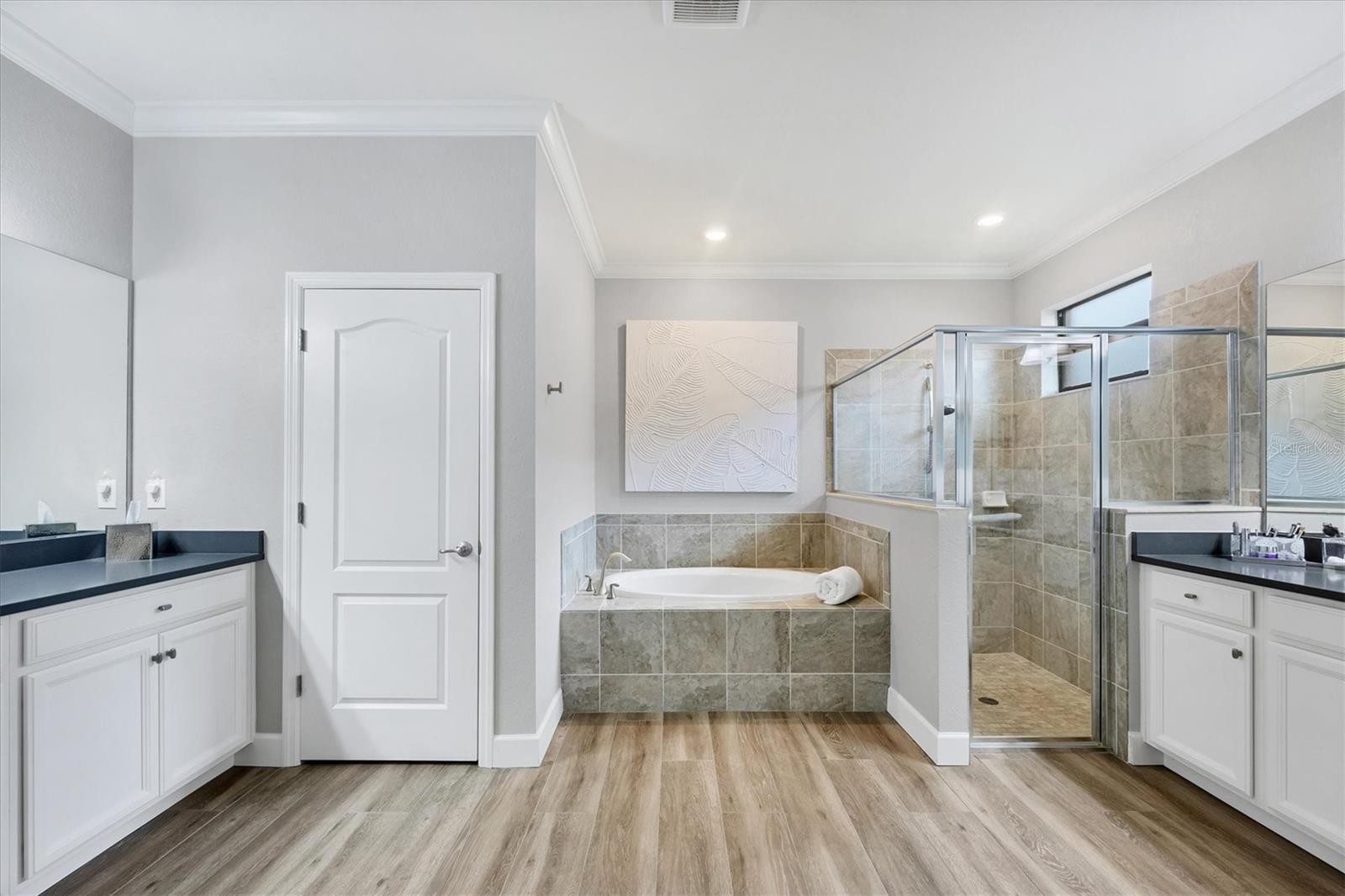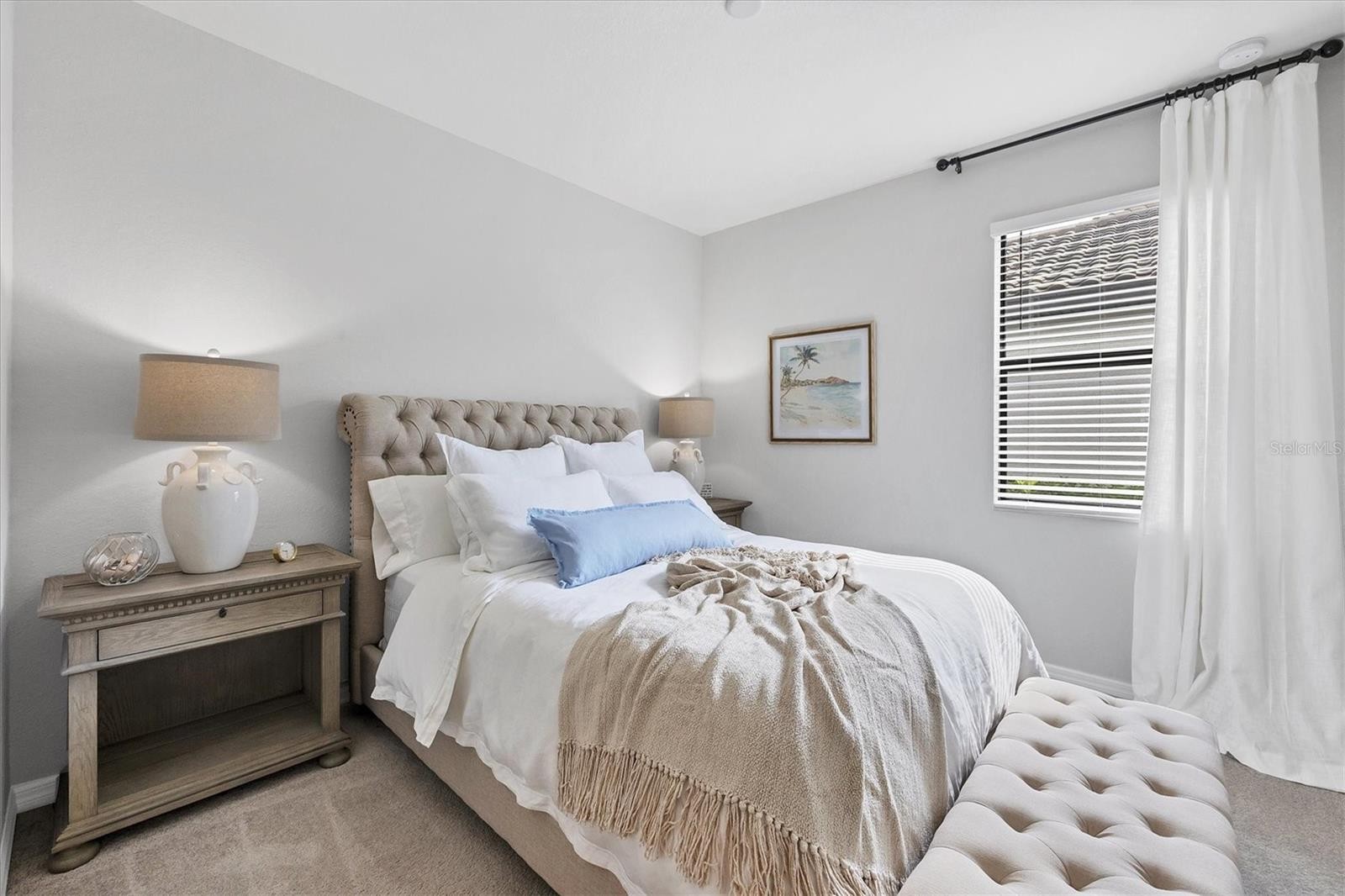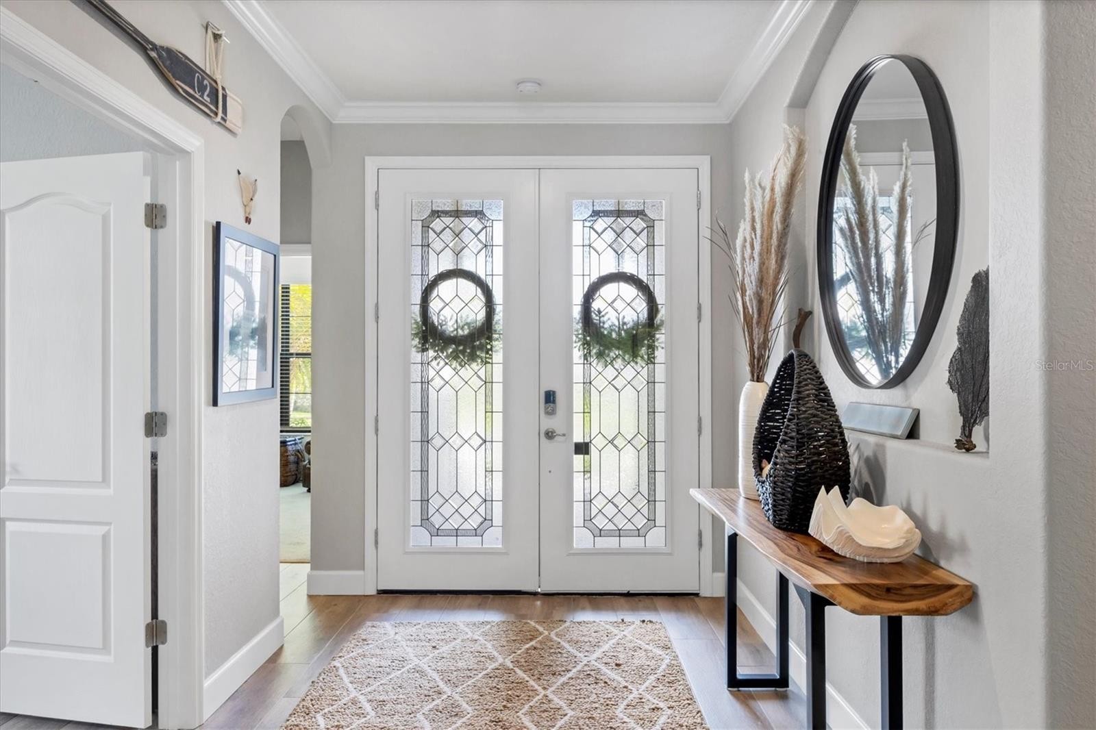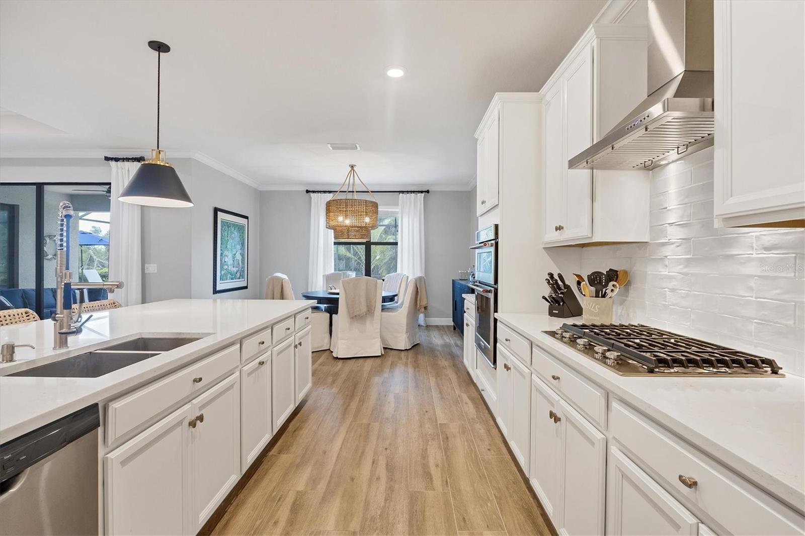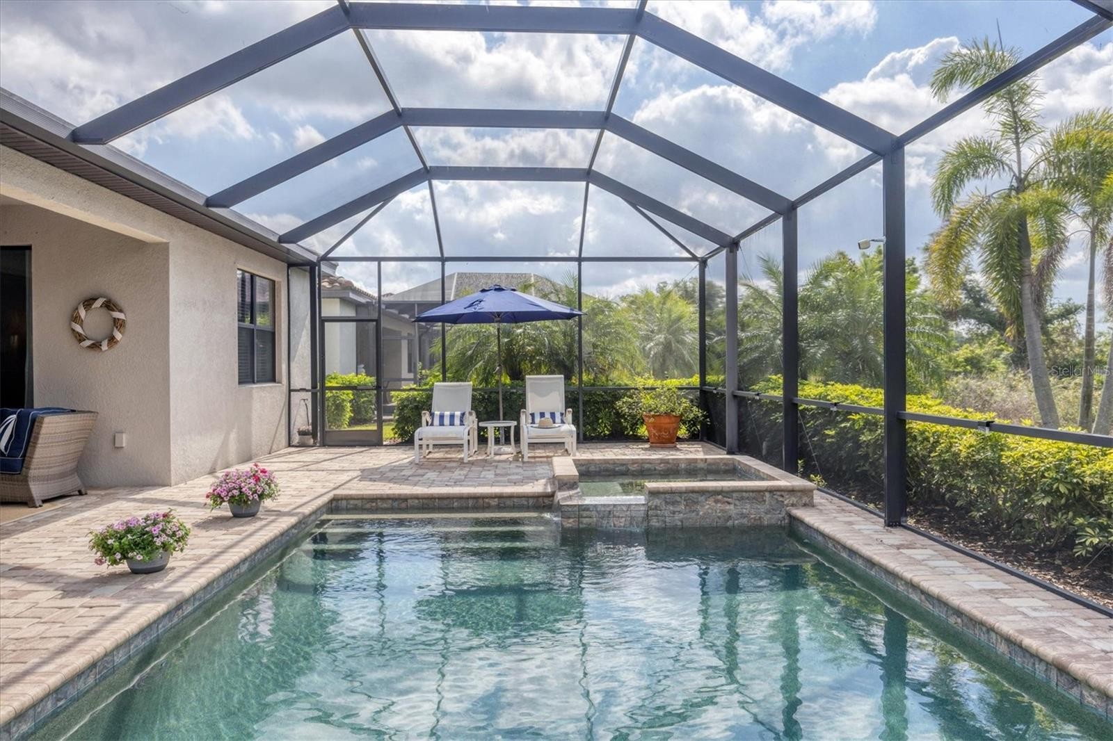 This GORGEOUS 3 bedroom, 3 bath plus den home in the sought after gated community of Polo Run has been tastefully upgraded throughout. Stately double entry front doors open to a sweeping open, airy floor plan that leads to expansive glass sliders revealing a luxurious outdoor gathering area overlooking a large pebble-tec® finished, gas heated pool and spa beyond in a private, tranquil preserve setting. High tray ceilings with crown moldings and upgraded porcelain warm wood-tone plank tile floors run throughout the home exuding elegance and luxury. The heart of this home is the gourmet kitchen with a massive center island with gorgeous white quartz countertops, KitchenAid double wall ovens each with convection capability, a 5-burner gas cooktop with a chic Z-Line stainless-steel hood, designer white tiled backsplash, custom pull-out drawers in all the lower cabinets and a counter depth side-by-side stainless steel refrigerator complete this Chef’s delight! Adjoining the kitchen the spacious family room has a gorgeous custom stacked stone-faced TV wall with a built-in Dimplex 74” fireplace with changing light and heat settings creating a delightful ambiance for entertaining or quiet relaxation. The master bedroom has 2 impressive walk-in closets with custom shelving leading to a spacious ensuite bathroom complete with his and her separate vanities, a soaking tub, large walk-in shower and private water closet. One guest bedroom has an ensuite bathroom offering comfort and privacy for guests. There is a second guest bedroom plus a bonus room that can be a den/office/craft room or currently an exercise/yoga room. The laundry room has a large washer/dryer and sink leading to an oversized 3 car garage with custom overhead storage. Polo Run is a beautifully maintained lifestyle community with an array of amenities including a tastefully decorated clubhouse, impressively equipped exercise room, aerobics room, pickleball, tennis and basketball courts, bocce ball, and playground all overlooking a resort-style heated pool and lovely lake beyond. There is also a dog park and expansive walking trails offering something for residents of all ages. Each home is equipped with solar panels, one of the first solar-powered communities in Lakewood Ranch. Lawn maintenance, irrigation and mulching are included in the low HOA fees allowing time to enjoy all the amenities as well as the thriving master-planned community of Lakewood Ranch, the #1multi-generational community in the U.S. since 2018 with easy access to I-75, nearby metro areas like Tampa and Sarasota, world-class beaches, high-end retail at neighboring University Town Center, 5-star dining as well as favorite locals eateries, weekend markets, abundant entertainment venues, professional sports, cultural attractions and airports. This home is truly one-of-a-kind, meticulously designed exuding warmth, luxury and sophistication in a community that has it all.