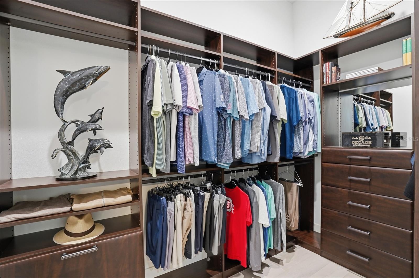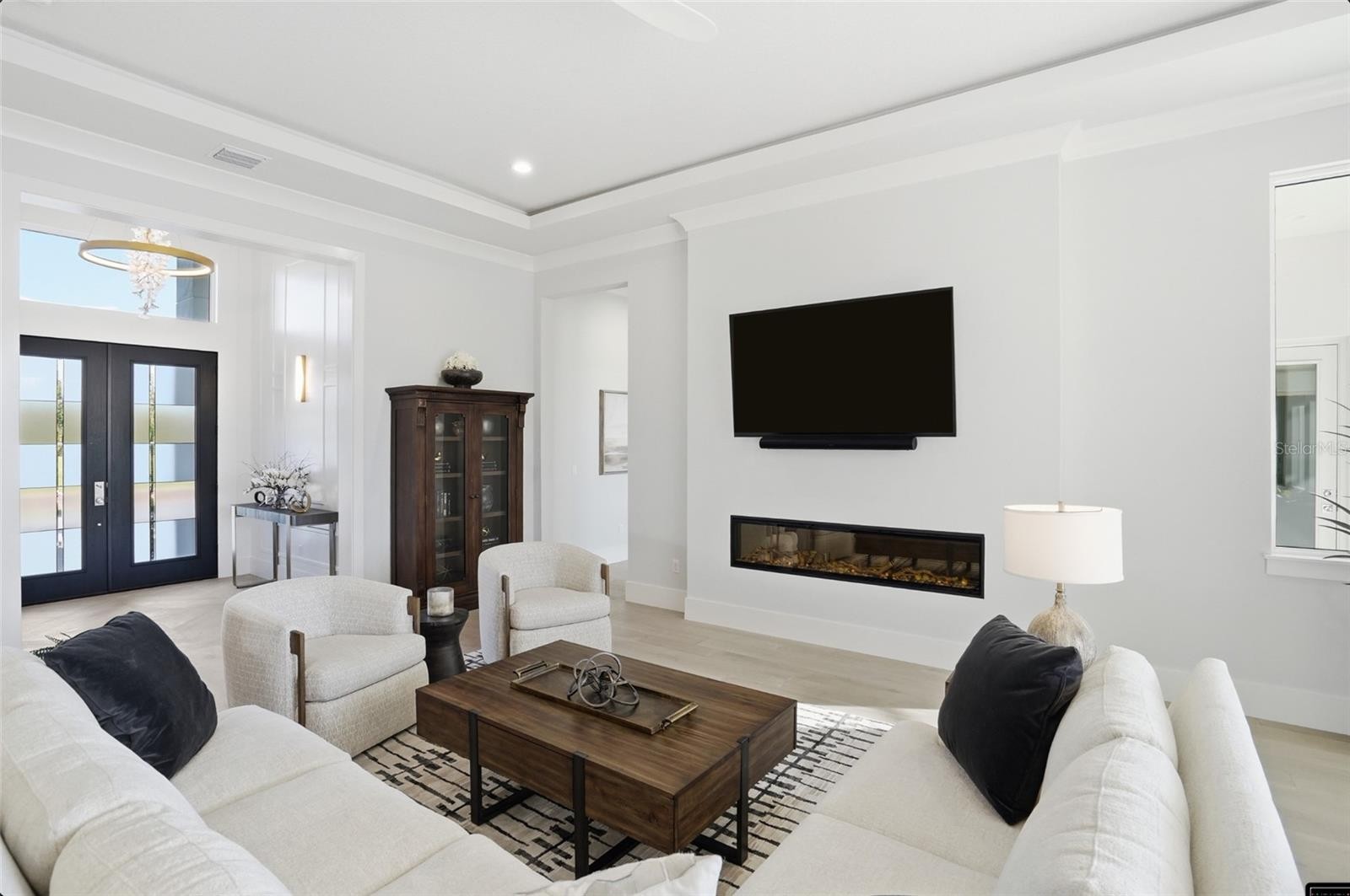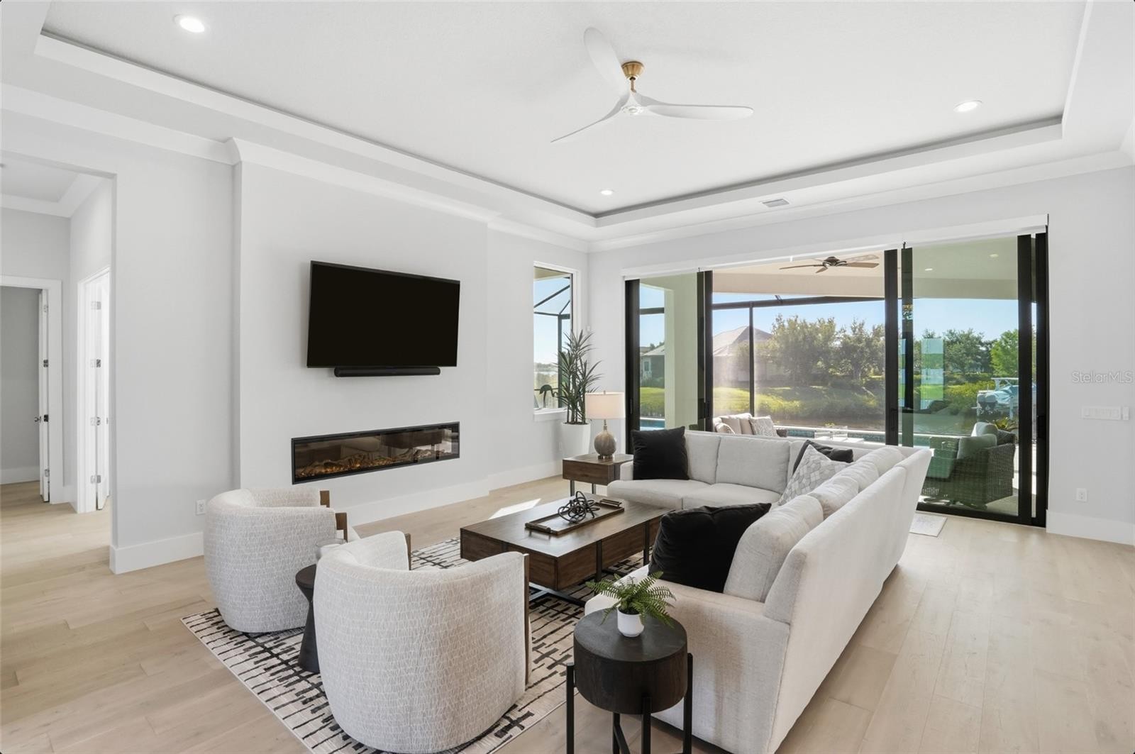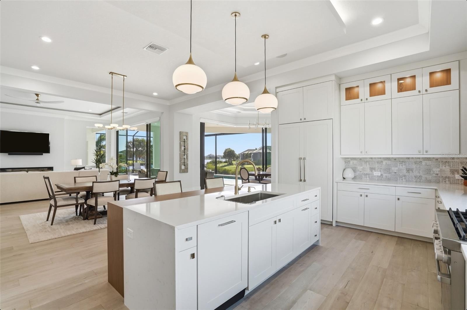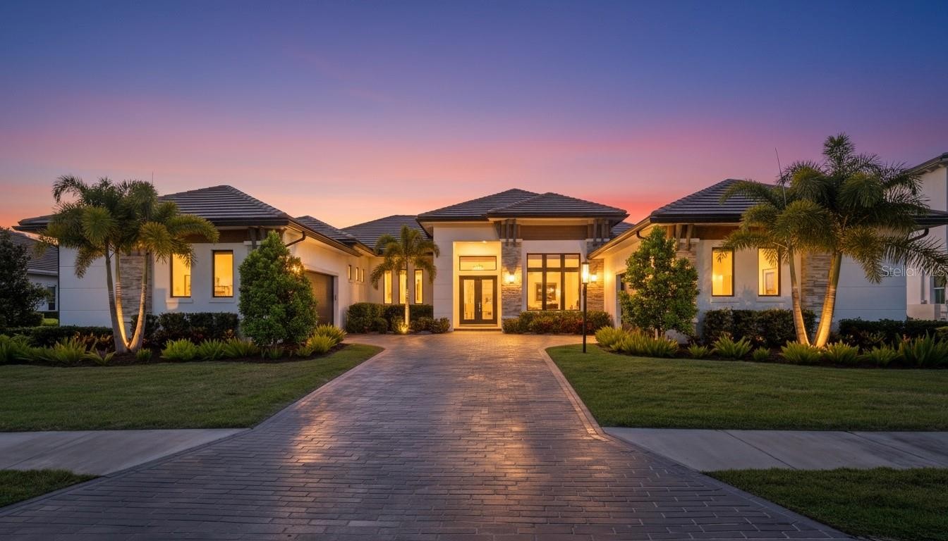 Custom built in 2024, this luxury John Cannon Homes Tindarra model estate is designed for refined Florida waterfront living—where architectural elegance meets a seamless, open-concept flow. Richly detailed yet timeless, the residence captures breathtaking western sunset views along a canal with direct access to the Manatee River, delivering a rare expression of luxury waterfront real estate, boating lifestyle, and the ultimate Florida living experience. Located in The Islands on the Manatee River, an award-winning, gated waterfront community recognized as Best Overall Community (category 3) in the 2026 Parade of Homes for the 8th year, this exceptional residence spans 3,612 square feet under air (5,291 square feet total). The thoughtfully designed split floor plan offers three spacious bedrooms with their own en-suites plus a full pool bath, ideal for both privacy and entertaining. Upon entry, the home makes an immediate impression with custom inlay wood flooring, designer molding, and a grand great room with soaring 11-foot ceilings, a sleek electric fireplace, and expansive water views. The space flows effortlessly into the dining room and then into a chef’s kitchen designed for entertaining, featuring solid wood white cabinetry, premium Dacor appliances (six-burner gas range, electric wall oven, warming drawer, microwave, and built-in refrigerator) along with a discreet hideaway pantry for added function and elegance. An expansive bonus room extends the living space—perfect as a media room, club room, or sunset lounge—framing picturesque canal views and golden evening skies. A private study/den with sliding glass doors opens to the lanai, offering a flexible home office or quiet retreat. The expansive owner’s suite is a true sanctuary, featuring private lanai access, dual custom walk-in closets, one with a 9 x 15 boutique-style dressing space with chandelier. The spa-inspired primary bath showcases a walk-through double-entry shower, soaking tub, and dual vanities, blending luxury with everyday comfort. Car collectors and hobbyists will appreciate the dual two-car garages (4-car capacity) with a 14’ paver driveway and additional overhead storage via pull-down access. Outdoors, the home transforms into a private resort-style retreat, featuring an expansive 1,008 square foot lanai, a fully equipped outdoor kitchen, and multiple seating areas ideal for entertaining. Trex decking leads to a private, lighted dock with a 15,000 lb vertical boat lift, power, and water, with dual access points for ease of onboarding. Additional features that deliver both peace of mind and modern convenience include PGT impact windows and doors, smart home wiring (Cat6), kitchen and lanai overhead speakers, security system, custom lighting, dimmable recessed lighting, crown molding, ceiling fans, low-voltage window coverings, 500 gallon buried propane tank and a private irrigation well. A rare opportunity to own a like-new construction waterfront estate, this home offers the perfect blend of luxury, functionality, and lifestyle—an exceptional boating home, canal-front property, and sunset-facing residence designed to be as effortless as it is extraordinary.