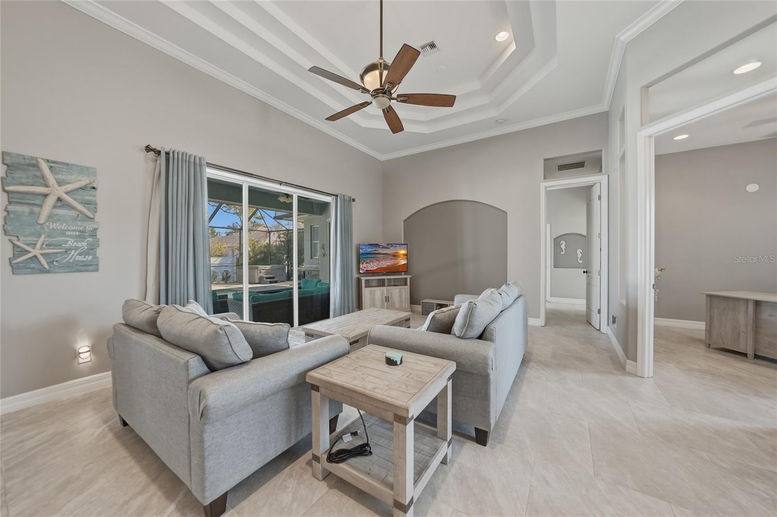 Discover comfortable Florida living in this well-maintained, furnished 4 bedroom, 2.5 bath home located in a peaceful North Port neighborhood. NOT A FLOOD ZONE! The property features an inviting open layout with bright living areas that flows easily into the dining space and kitchen, creating a functional setup for everyday living. The kitchen features slow close wood cabinets, granite countertops, stainless steel appliances, breakfast bar and nook. Two living areas include a large living room with triple tray ceiling and glass pocket sliders, the den with glass sliders that both lead to the lanai and pool area. The split-bedroom design provides privacy, with a spacious primary suite offering walk-in closets and an en-suite bath with two sinks, and jetted soaking tub. Tray ceiling in the primary bedroom with glass sliders leading to the pool area. The additional bedrooms are well-sized and versatile for guests, or furniture enhancements. Heated saltwater pool and hot tub, wet bar, storage, and a half bath. NEW ROOF and Insulation 2022. New tile throughout all living areas. Conveniently situated near shopping, dining, parks, and Gulf Coast Beaches. The home delivers a balanced blend of comfort, convenience, and value in a growing community. “Virtual Tour 1” to view the 3-D Tour and Floor Plan. "Video Tour 2" to view video tour.
