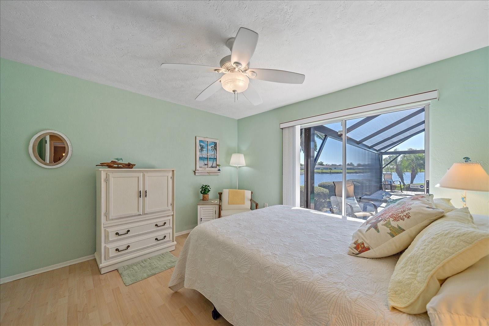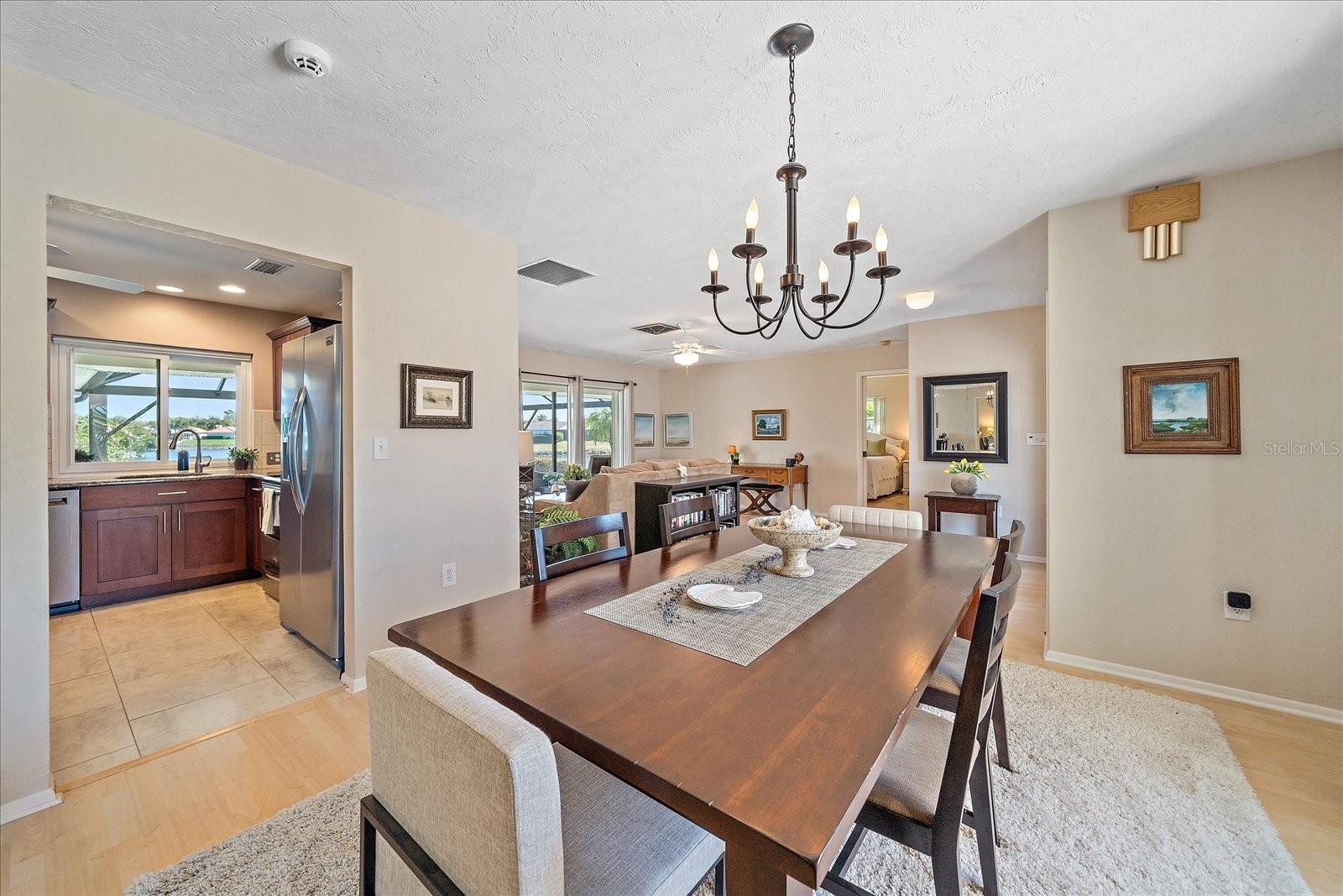 Under contract-accepting backup offers. PANORAMIC LAKE VIEWS! This quality constructed model home built by Lincoln Homes is situated on a quaint street in highly sought-after Heritage Lake Estates/ Jacaranda West. Enter the courtyard and through the beautiful new double doors and you'll notice the water view from the moment you step inside! And, the WATER VIEWS continue to nearly every room! This 3-bedroom 2-bathroom home is in immaculate condition and has been loved and cared for by the original owner and family. This is the first time ever on the market! OFFERED TURN-KEY FURNISHED. You'll truly appreciate the layout of this home designed to wrap around the private lanai and pool. The split bedroom floor plan offers a guest wing, great for hosting company. The spacious kitchen, open to the family room is conveniently located in the center of the home and features eat-in space, granite countertops, plenty of cabinetry, a large breakfast bar and a pocketing pass-through window to the lanai providing a nice view while cooking. The family room has vaulted ceilings with beautiful wood beams and a fireplace. Additional features include an OVERSIZED GARAGE, WALK-IN CLOSETS in every bedroom and LARGE LAUNDRY/PANTRY ROOM. Updates include the NEW PANORAMIC SCREEN ENCLOSURE for unobstructed water views, NEW FULL LITE DOUBLE ENTRY DOORS, STORM SHUTTERS, WINDOWS, REPIPE and more. Pocketing sliding glass doors from the living room, family room, primary bedroom and guest bedroom provide plenty of natural light and allows you to extend your living area to the outdoors. Open all the sliding glass doors on a nice day and relax by the heated salt water pool or soak in the hot tub under the expansive covered lanai. You'll have a spacious backyard with 95 ft of lake frontage and seawall. Beautiful curb appeal surrounds this lovely home with tropical landscape, palm trees, blooming hibiscus and an irrigation system fed by reclaimed water. Jacaranda West is best known for its excellent location, beautifully manicured lawns, mature landscape, oversized lots and quality-built homes, each with charm and character! Low HOA Fee. NO CDD Fee. Don’t miss out on this rare opportunity. Schedule a showing today!