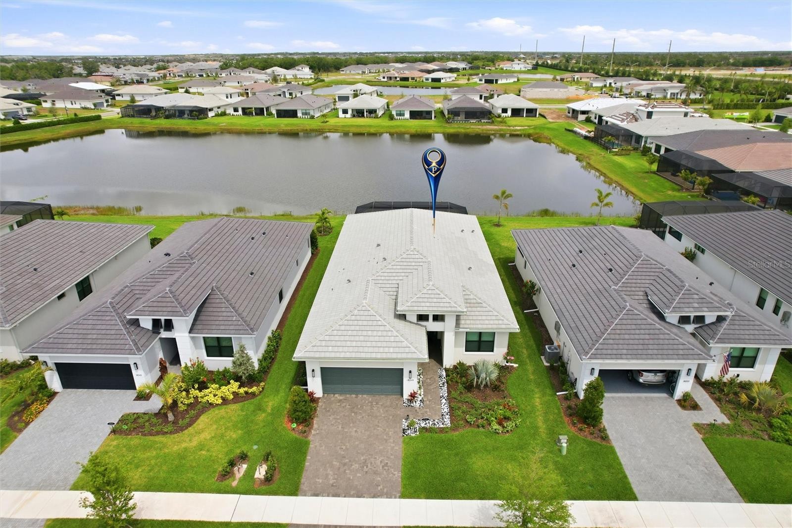 Welcome to the “House of Zen” — a better-than-new, one-owner Fiesta model perfectly positioned on a premium waterfront lot with expansive, unobstructed lake views and designed with balance, flow, and positive energy throughout. Offering 2,318 sq ft under air and 3,087 total sq ft, this open-concept home features 3 bedrooms, 3 full bathrooms, den, and a 2-car garage with LiftMaster smart opener (camera + keypad). The heart of the home is a stunning designer kitchen showcasing a Quartz Cambria “Skara Brae” waterfall island and matching quartz backsplash, GE Café stainless steel appliances including a 36” gas cooktop, built-in microwave/convection oven, 30” wall oven, dishwasher, under-cabinet lighting, a double pull-out trash system, and porcelain tile flooring that flows through the main living and dining areas. The spacious primary suite offers a private retreat with a spa-like bath, while a full en-suite guest bedroom with a walk-in closet provides ideal privacy for visitors, and a third bedroom offers flexibility for an office or additional guest space. All three bathrooms feature extended shower walls for a more luxurious experience, and bedrooms are finished with high-end KARASTAN carpet for added comfort. The spacious den is ideal for a home office. Step outside to an extended screened lanai with a panoramic picture window enclosure, private wall, and upgraded modern pavers, creating a peaceful outdoor living space with uninterrupted lake views. Additional upgrades include impact-rated windows, patio doors, and an entry door for storm protection and energy efficiency, a SpringWell whole-house water softener and filtration system, a tankless water heater, in-wall pest control, an attic ventilator and automatic ventilation for enhanced air quality, custom lighting fixtures throughout, plantation shutters; a laundry room with cabinets and a sink, and rain gutters. Security features include an alarm system, smoke detectors, and guard-gated community access. Builder warranties convey including 1-year workmanship, 2-year systems, and 10-year structural. Located in the highly sought-after Cresswind Lakewood Ranch 55+ community, which offers a resort-style pool and spa, fitness center, clubhouse, pickleball and tennis courts, walking trails, a dog park, and a full calendar of social activities, with HOA including cable TV, internet, grounds maintenance, and more. This is a rare opportunity to own a fully upgraded, move-in ready waterfront home that combines modern luxury, thoughtful design, and a serene, elevated lifestyle. Come experience the views, the energy, and the feeling. This is Lakewood Ranch living at its finest.