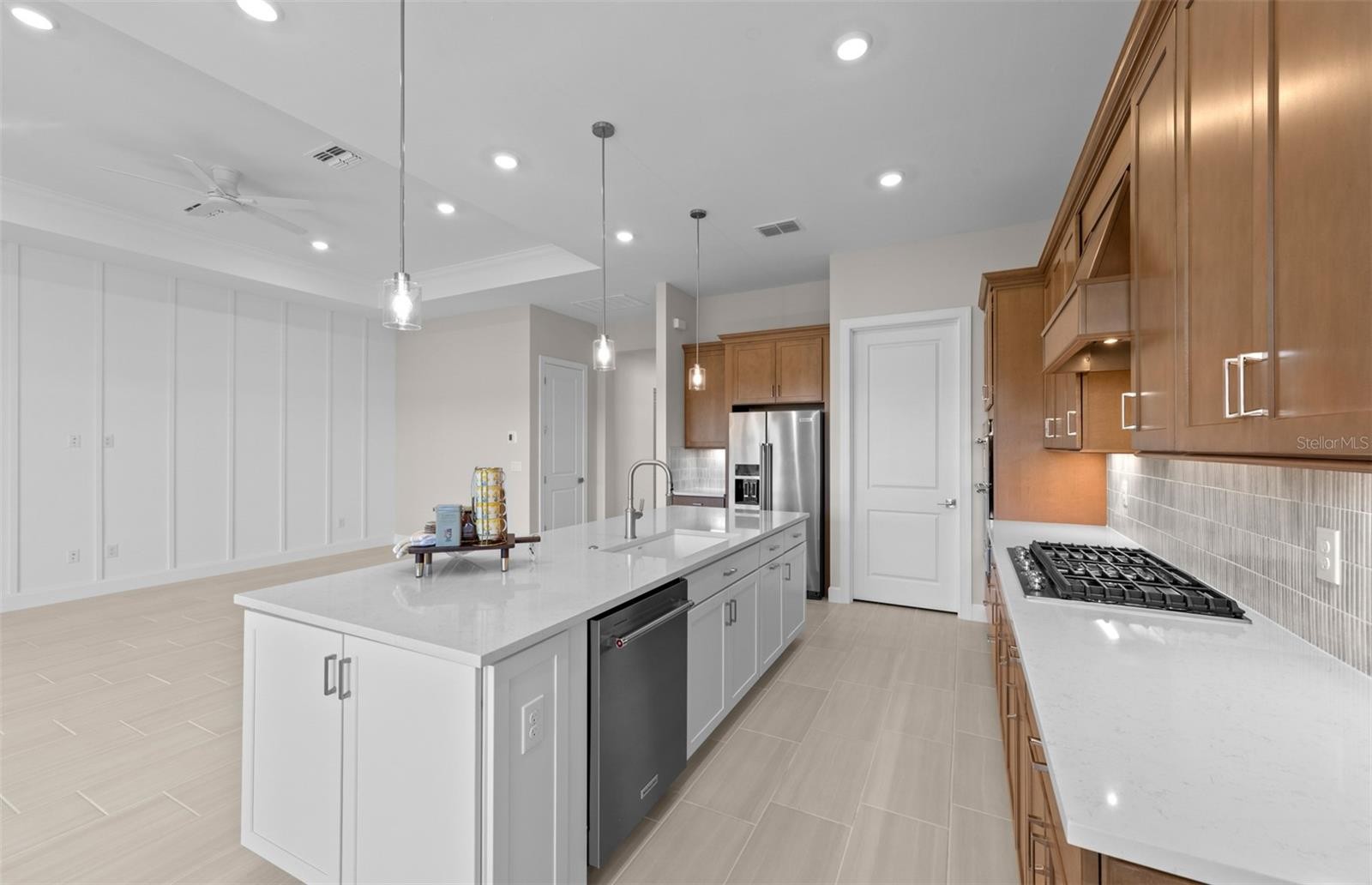 Under Construction. Enjoy this spacious Prestige floor plan featuring 2 bedrooms, 2.5 baths, a flex room and 2-car garage, nestled in a brand new boutique style community. This home features an open floor plan with porcelain tile flooring throughout, impact-resistant doors and windows, and tray ceiling in the gathering room The kitchen is a chef’s delight with gas cooking, a built-in microwave/wall oven combo, two pantries, warm tone wood cabinetry w/undercounter lighting with white cabinets on large island & Silestone countertops. Other features include an enlarged shower in the owner's bedroom, upgraded laundry rm w/sink and cabinetry, screened lanai and washer/dryer/fridge are included! Relaxation is easy at the community pool and cabana while cooking at the BBQ grill area. Don't miss this opportunity to own a brand-new home only 3.5 miles to the beach! Photos are from a furnished model. Options for this home may vary.
