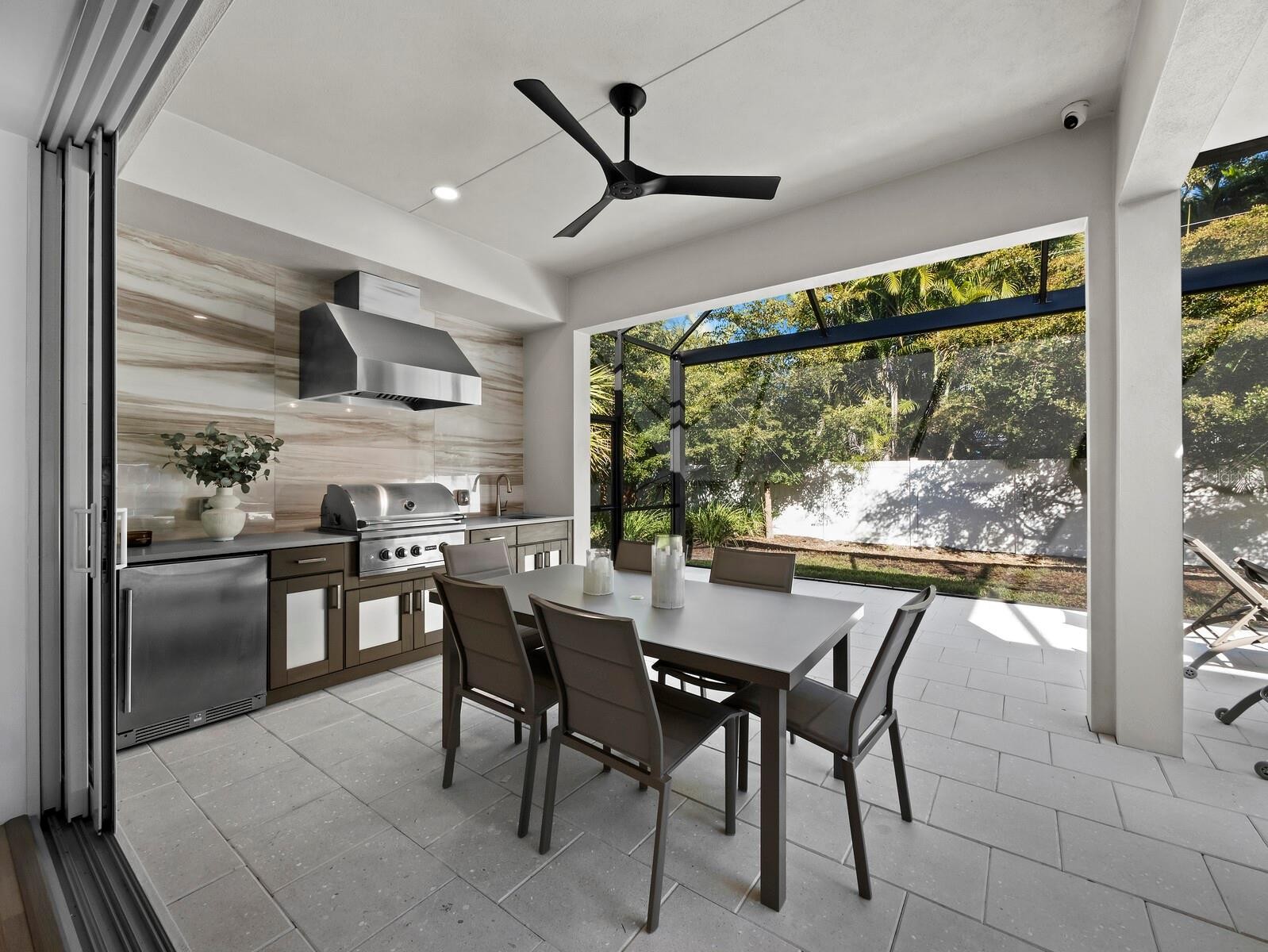 This exceptional soft contemporary single story home, built in 2022, is a former model home by Allegra Homes and features numerous upgrades and custom built-in details. Offering 3 bedrooms, 3 full and 2 half bathrooms, an office, and multiple outdoor living spaces, the home features an open floor plan with high ceilings, allowing an abundance of natural light. The kitchen includes a large waterfall-edge island with seating, Sub-Zero and Wolf appliances, ample storage, and a walk-in pantry. The dining area and both living areas have pocket sliding doors that create a seamless flow to the outdoor spaces and pool deck. The primary suite includes a large walk-in closet with built-ins, direct access to the laundry room, and a spacious bathroom with dual vanities, a zero-threshold shower, and a garden tub. Two additional bedrooms are en suite with walk-in closets. Additional features include a study with built-ins, tray ceilings, cove crown molding, and quality fixtures throughout. Outdoor amenities include a heated pool and raised spa, sun shelf, outdoor fireplace, summer kitchen, and panoramic screened lanai. The home also offers an oversized three-car garage (one of which has been converted into a home gym with air conditioning), hurricane impact windows, central vacuum, security cameras, a tankless water heater, and lush tropical landscaping. Situated in the desirable South Poinsettia neighborhood, west of the Trail, just steps from the shops and restaurants of Southside Village and a short drive to downtown Sarasota Bayfront, St. Armands Circle, and the beaches of Lido and Siesta Key. It is also located in the highly sought-after Southside Elementary School District. Book your showing today!