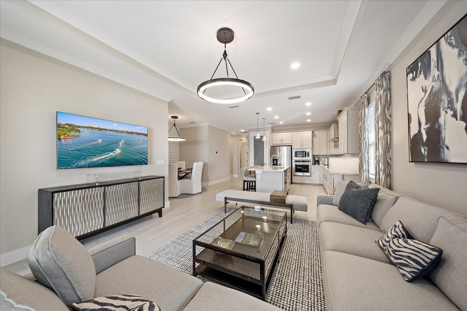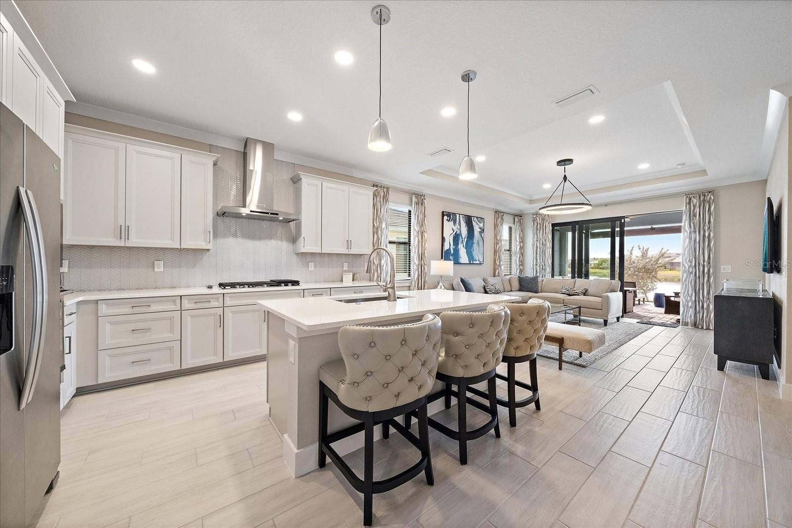 **DESIGNER FURNITURE (partial or all) and GOLF CART AVAILABLE FOR PURCHASE SEPARATELY OR INCLUDE INTO PROPOSAL.** Customized Toll Brothers Rosehall paired villa is loaded with top-of-the-line builder options PLUS additional custom upgrades after purchase including trim work, designer finishes and a huge expanded lanai with lake and fountain views. This beautifully maintained home features 2 bedrooms, 2 bathrooms, and a versatile flex room with a hidden bonus closet—currently styled as an office/TV room/guest space and easily used as a third bedroom. This home features tile flooring throughout, and the 2-car garage features an epoxy-coated garage floor. Notice the upgrades to this home and attention to detail: from the designer lighting & ceiling fans, custom doors, and elegant custom molding and trim work throughout, including eye-catching accent walls in the hallway and flex room. The executive gas kitchen, complete with built-in KitchenAid appliances, quartz counter tops, large island & custom pantry door. The guest bathroom is equally impressive, showcasing a UPGRADED gorgeous walk-in shower with upgraded tile and a luxury rain shower head in addition to the handheld. Open the back glass sliders to your huge expanded lanai that wraps around the back of the villa, featuring a picture-frame screen that creates unobstructed, postcard-worthy views of the serene lake and fountain—a true showstopper and the ideal place to relax morning or night. Schedule your private showing today.