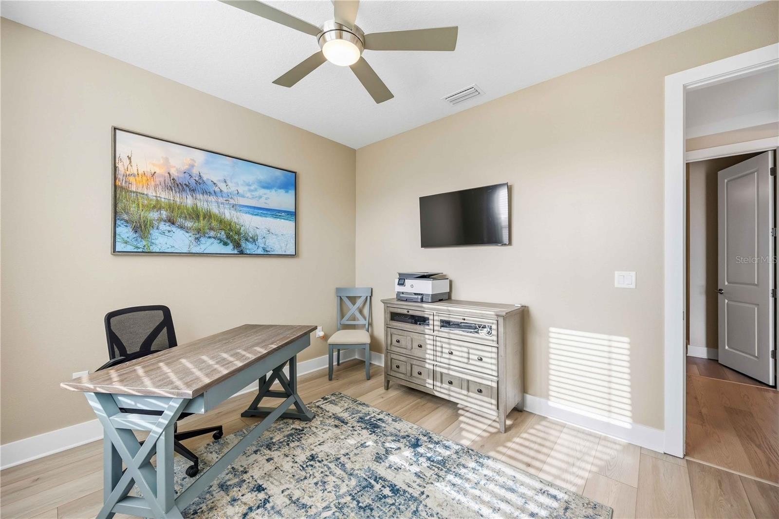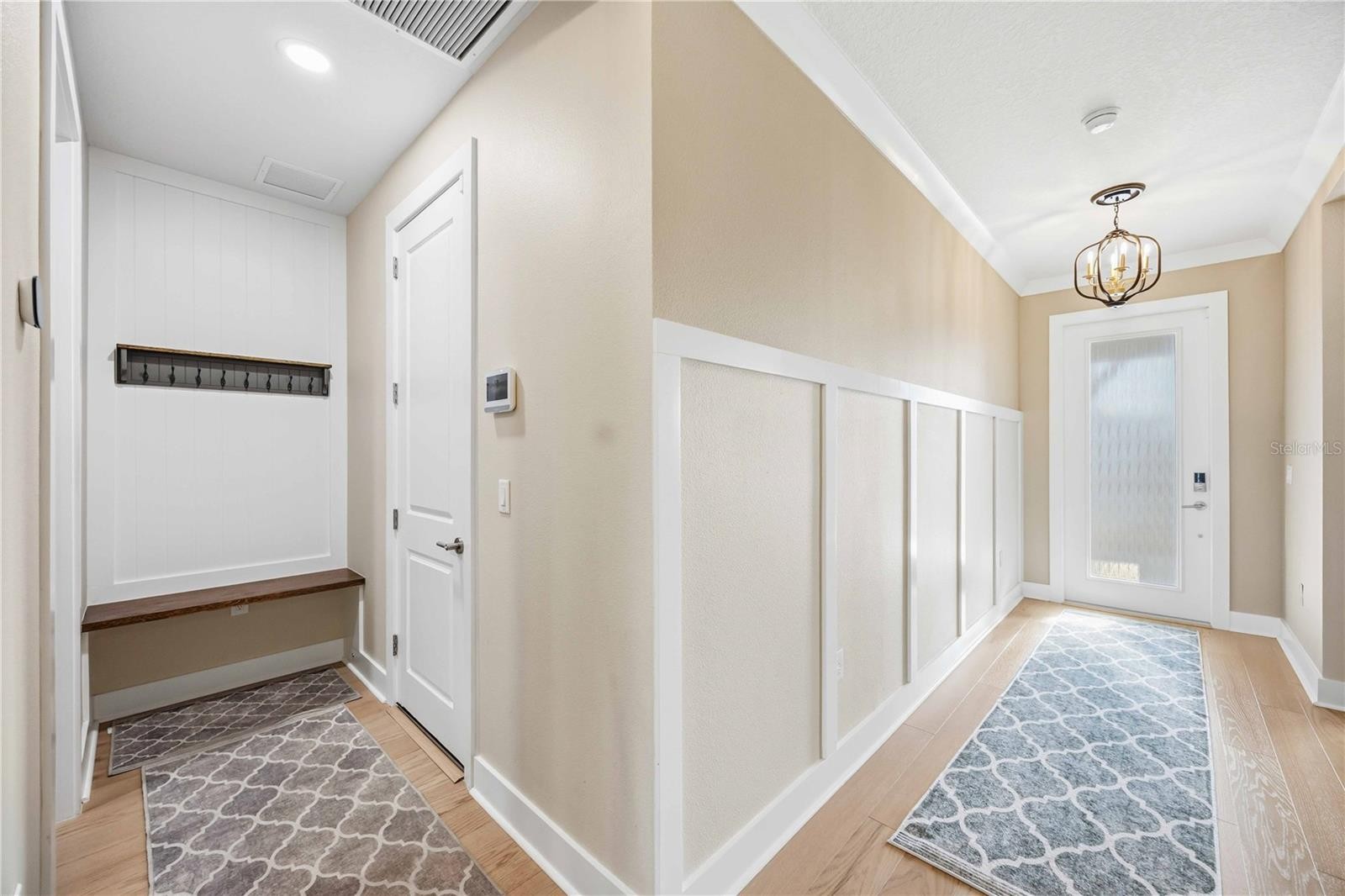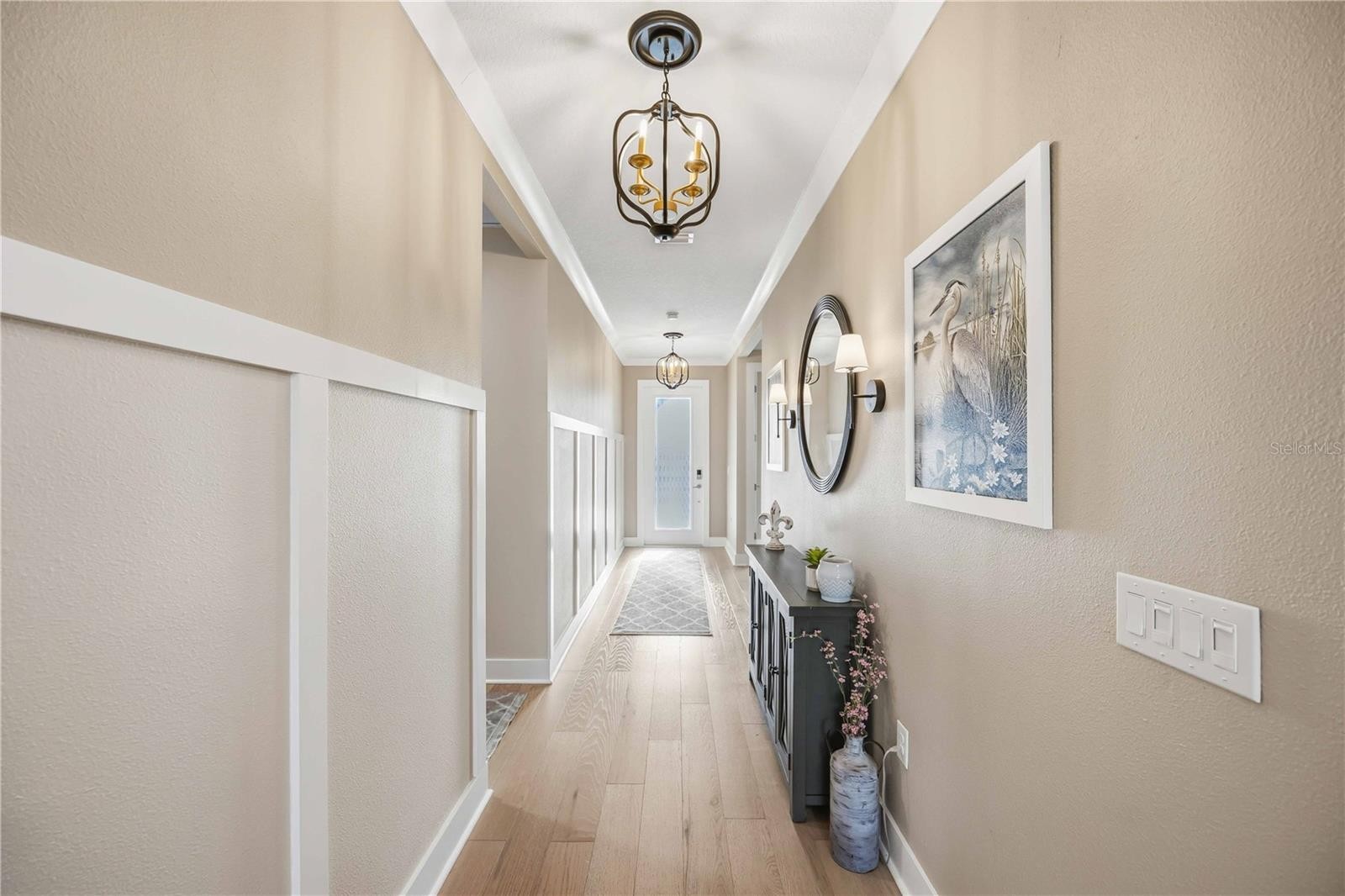 One or more photo(s) has been virtually staged. GAS COMMUNITY, FULL GUTTER SYSTEM, WHOLE-HOME GENERAC GENERATOR, IMPACT-RATED WINDOWS AND DOORS, CUSTOM CEILING BEAMS, CROWN MOLDING, DESIGNER LIGHTING, KITCHENAID APPLIANCES, OUTDOOR KITCHEN PREPPED full-height backsplash, upgraded pendant lighting, oversized pantry, water softener system with reverse osmosis, engineered hardwood flooring throughout with no carpet set the tone for the level of upgrades and care found throughout this beautifully enhanced three-bedroom, two-bath home in the gated community of Solstice at Wellen Park, set on a premium pond-view homesite. Enjoy outdoor living on the extended, sealed paver patio and screened lanai with added landscaping, creating a private, relaxing space designed for year-round Florida living. The spacious primary suite features double crown molding and a professionally designed custom closet, with additional highlights including a custom drop zone, glass shower doors in the guest bath, window blinds throughout, designer ceiling fans, and an Electrolux washer and dryer. Walking trails connecting to Downtown Wellen and the Atlanta Braves stadium enhance the lifestyle, along with maintenance-free living and resort-style amenities including a clubhouse, yoga lawn, and pool, with future plans for a fitness center, pickleball and bocce courts, scenic gathering spaces, and more, all near top-rated Sarasota County schools and less than 15 minutes to the Gulf Coast’s beautiful beaches.one or more photos have been digitally edited