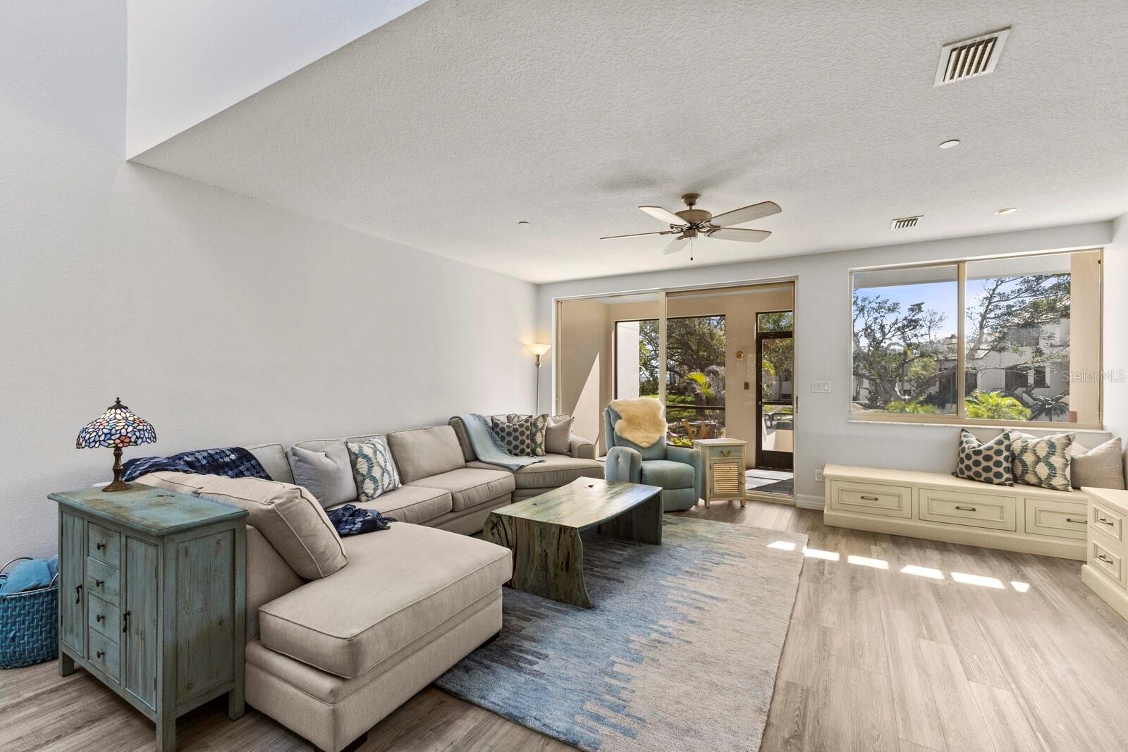 REDUCED PRICE! Are you looking for a RESORT home with spacious rooms, fine finishes, vaulted ceilings and the convenience of a condo community with bay and beach access? Look no further. Luxury and style await in this beautifully updated townhouse, located behind the gates of the exclusive Bay Isles resort. With 1,590 sq. ft. of meticulously designed and finished indoor living space plus another 1,100 sq. ft. of screened lanai, storage and garage space, this resort home provides the ultimate in luxe living, comfort and convenience. Upon entering this home, you're greeted by an open concept great room and designer kitchen, vaulted ceilings, a conveniently placed guest bathroom, and views over the very private community pool. You'll never want to leave! The gourmet kitchen is a chef’s dream, featuring gleaming granite countertops including a striking azure blue granite breakfast bar, custom mosaic glass tile backsplash, solid wood cabinetry, and stainless JennAir appliances. Easy to maintain luxury vinyl plank floors flow throughout, adding sophistication and durability. Soaring cathedral ceilings and abundant natural light enhance the light, bright, spacious feel of this home and the private screened lanai offers a serene retreat with access to lushly landscaped grounds and the resort style pool. The oversized primary suite boasts vaulted ceilings, a walk-in closet, and an elegant ensuite bath with natural stone and custom tile shower. The second bedroom also has a vaulted ceiling plus walk-in closet and beautifully finished adjacent bathroom. The ground-level garage has extra depth enabling covered parking for two cars plus there's a separate room that can be flexibly used for storage, a home gym, or a wine cellar. As a Bay Isles resident, you'll enjoy exclusive access to resident-only amenities including a private clubhouse, fitness center, heated pool and spa, tennis courts, and the private Bay Isles Beach Club. This resort home is just minutes from the vibrant dining, shopping, and cultural scene of St. Armands Circle and downtown Sarasota. See this home today and enjoy the best of Longboat Key living.