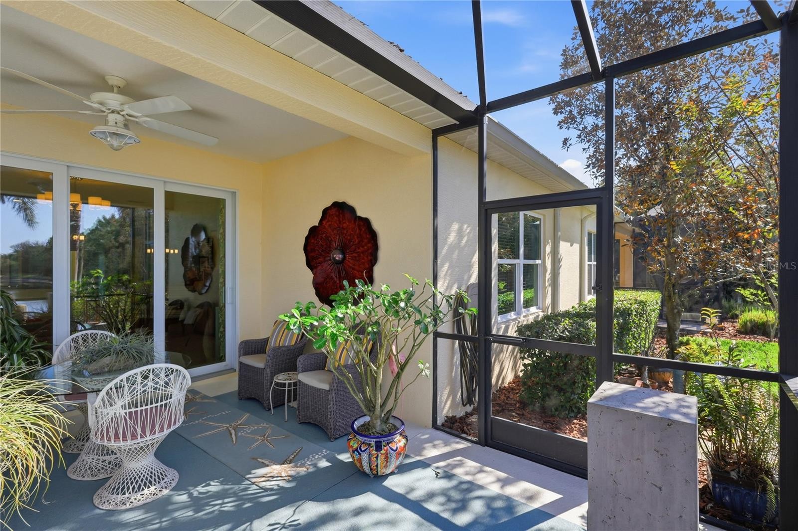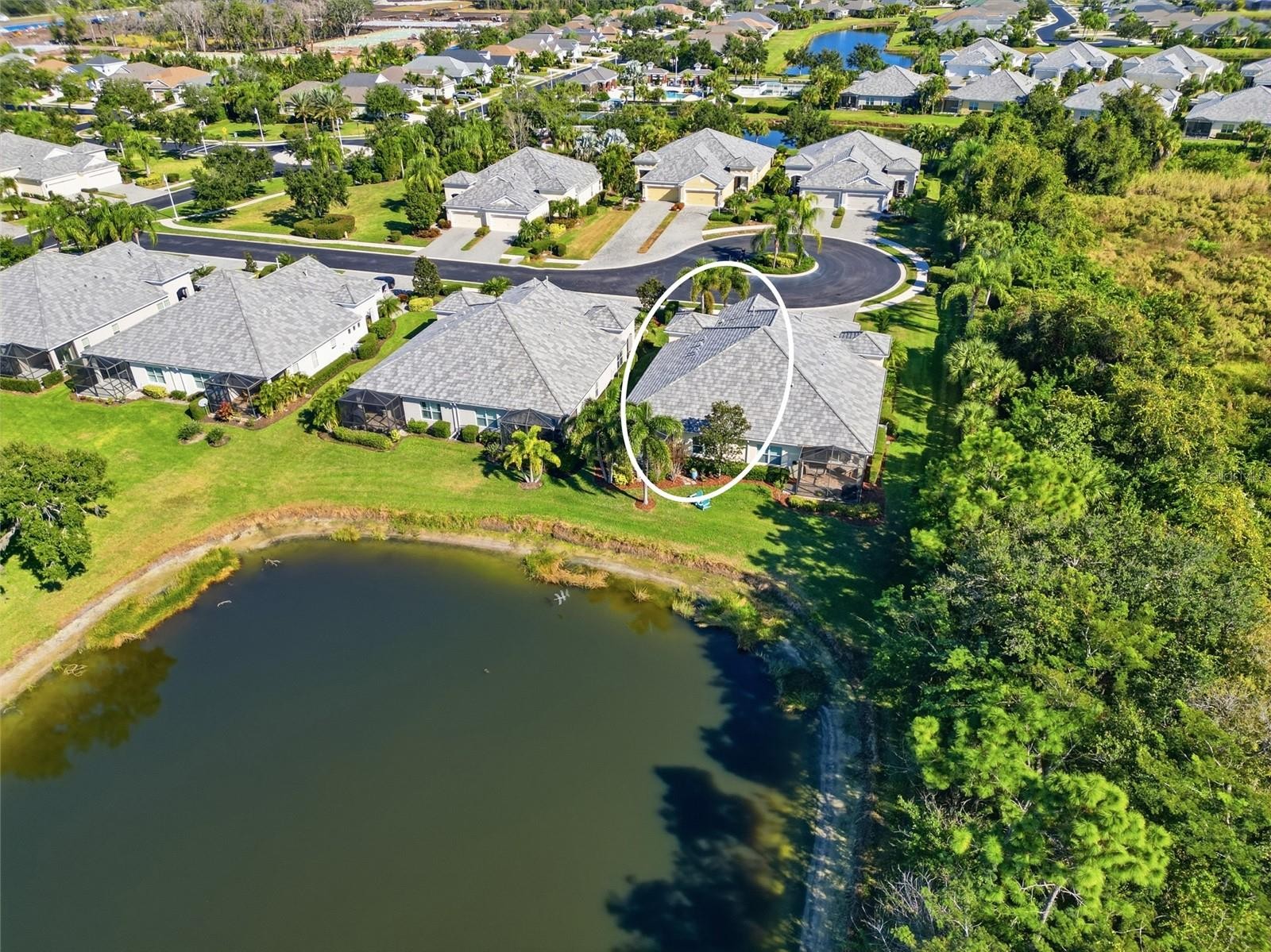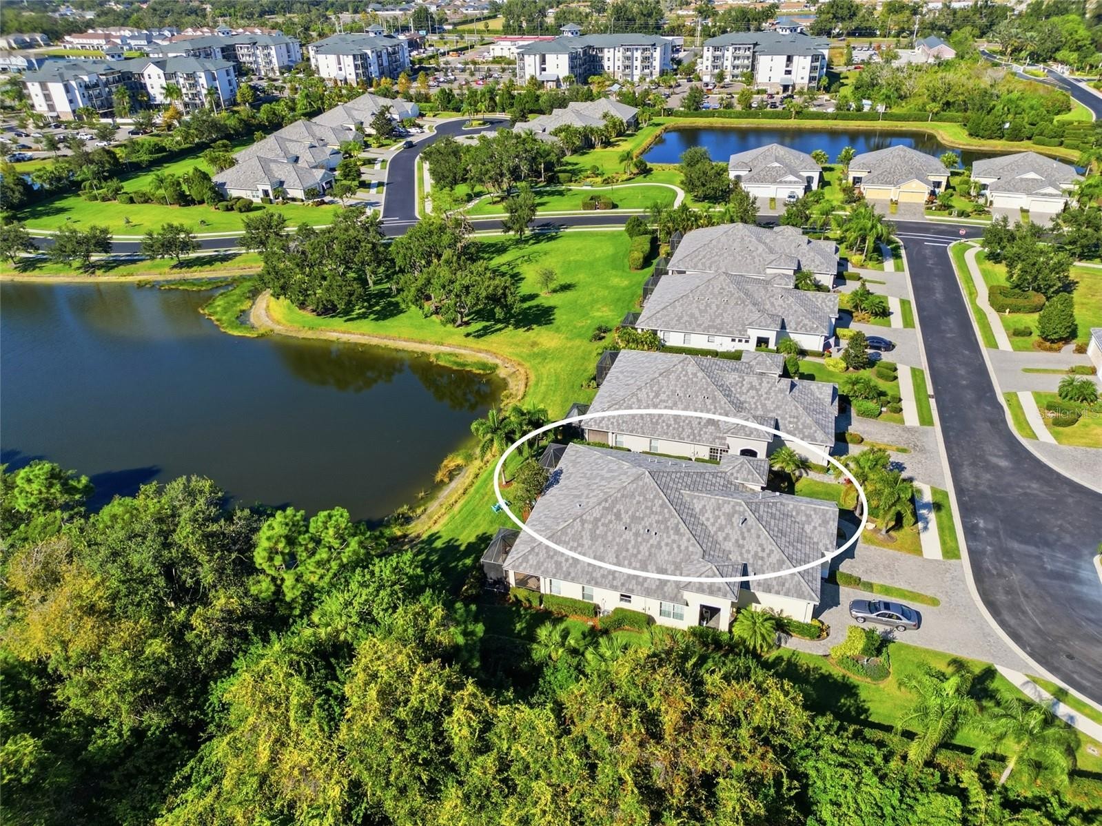 Introducing this beautifully upgraded villa in Eagle Trace, set on a quiet lot with long water views and a preserve positioned to the left side for enhanced privacy. As you enter, tall ceilings and the impact windows throughout create a bright, open feel throughout the home. To the right, a thoughtfully designed den features built-in cabinetry and a desk area featuring a drop-down extension providing additional workspace. Across the hall, the guest bedroom and bath offer a comfortable and private space for family and friends that come to visit. Beyond the entry, the home opens into the spacious kitchen and great room. The kitchen includes a spacious island, an under-counter water filtration system, and a dual-fuel gas range with a double oven, creating a functional and inviting space for everyday cooking or for entertaining. South American mahogany interior doors throughout the home add extra warmth and character, while custom closets in every room provide beautifully organized storage and a refined, custom-built feel. The primary suite is positioned at the rear of the villa featuring serene views of the water and preserve, offering a peaceful space at the end of the day to unwind. Energy-efficient improvements include radiant barriers and extra insulation in the attic and foam filled block walls, enhancing comfort year-round. The insulated impact-rated garage door provides peace of mind and protection while the additional storage and cabinetry are a huge bonus. Outside, the extended lanai takes full advantage of the home’s premium setting, offering a generous outdoor living space with tranquil water views and a quiet natural backdrop. Located within the gated community of Eagle Trace, residents enjoy maintenance-free landscaping along with access to a resort style pool and spa, tennis/pickle ball court, dog parks, and a playground. Thoughtfully enhanced and ideally situated, this villa combines comfort, efficiency, and a desirable homesite within one of Lakewood Ranch’s sought after communities.