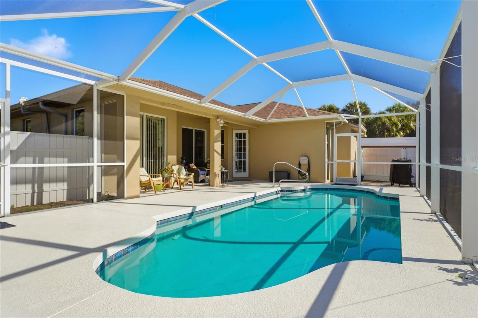 Set on nearly half an acre, this thoughtfully updated North Port home offers space, privacy, and outdoor living that’s hard to find. A 30-foot swimming pool anchors the backyard, complete with a covered lanai, ideal for relaxing, entertaining, or enjoying Florida’s year-round sunshine. The pool was rescreened in 2021, with a new pool pump motor in 2023 and pool timer replaced in 2024, providing peace of mind for the next owner. Inside, the home has been recently painted and features tile and LVP flooring throughout, with carpet in the guest bedrooms. The kitchen includes updated appliances (2020) and solid-surface countertops, offering durability and a clean, modern look. Major improvements include a new roof in 2021 with a transferable warranty and oversized 6” gutters installed in 2021. The expansive yard allows room for gardens, play, or future additions, and the shed with up-to-code electric adds valuable storage or workspace. Located in a growing area of North Port, this property offers easy access to local parks, trails, shopping, dining, and nearby Gulf beaches, while still feeling comfortably removed from congestion. A balanced blend of indoor comfort, outdoor living, and long-term upgrades makes this home a standout opportunity.