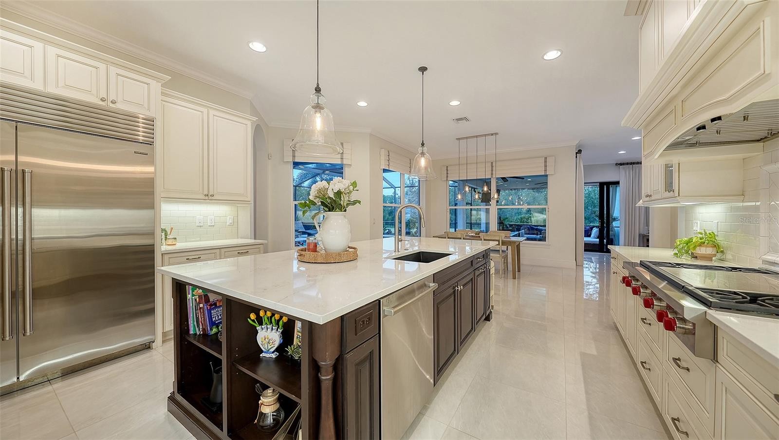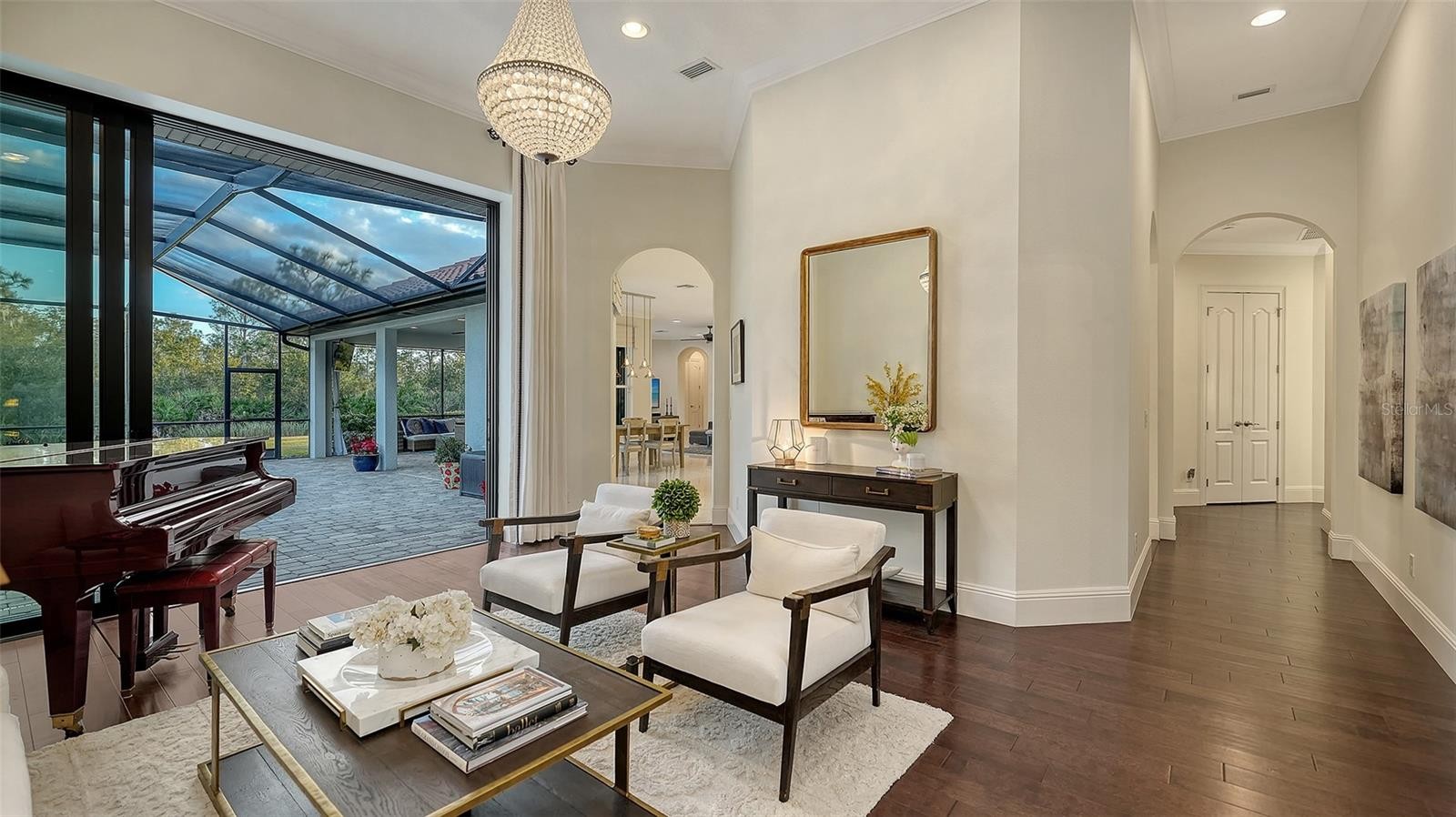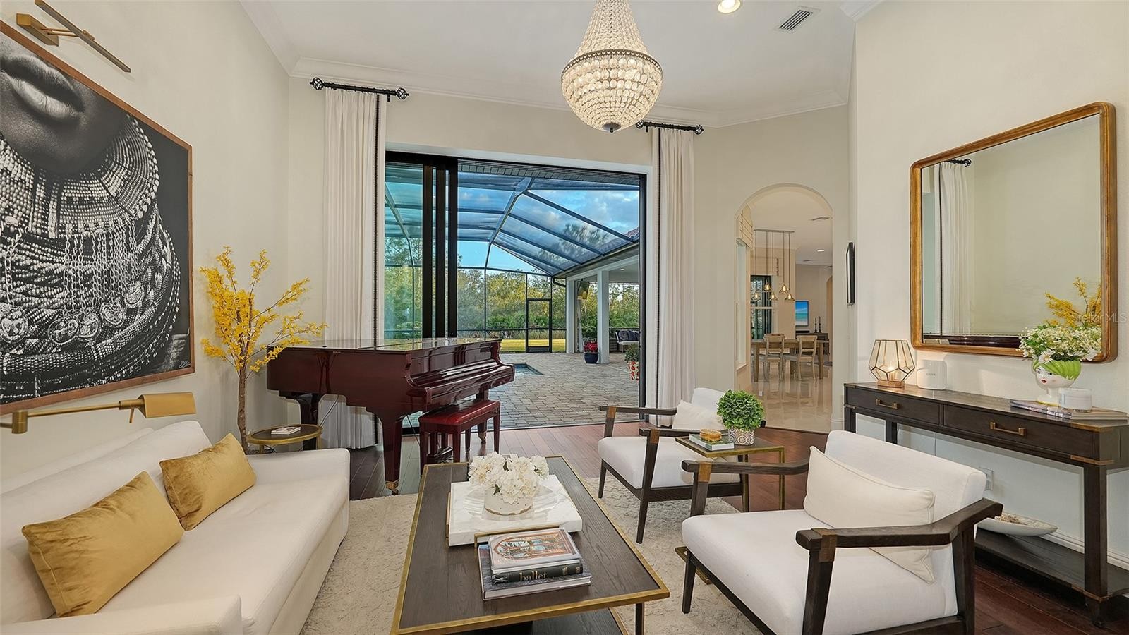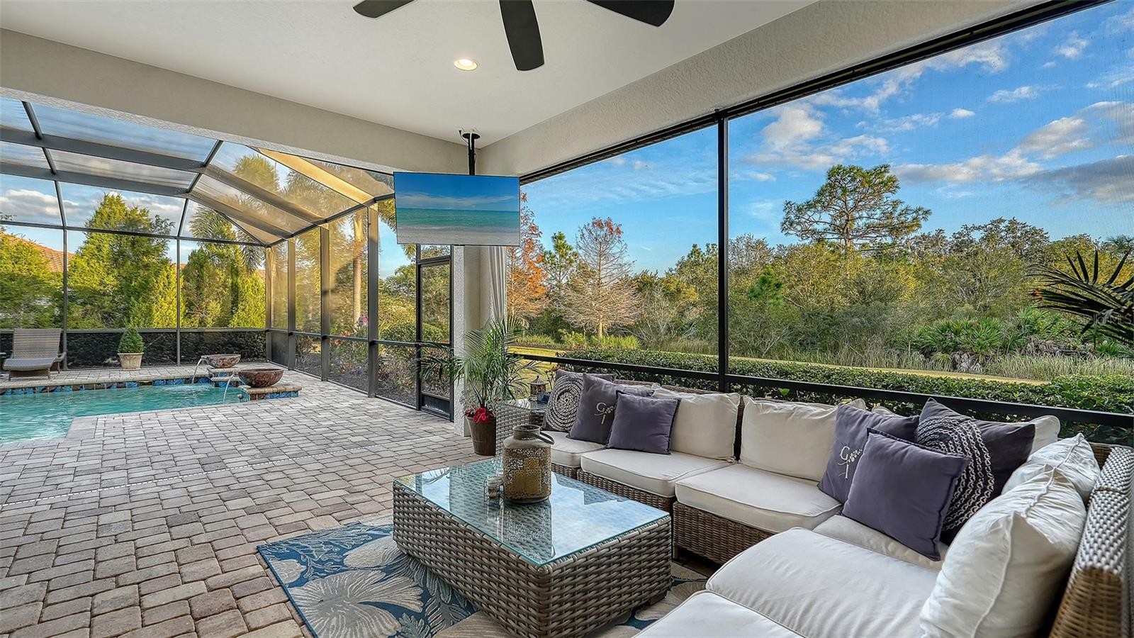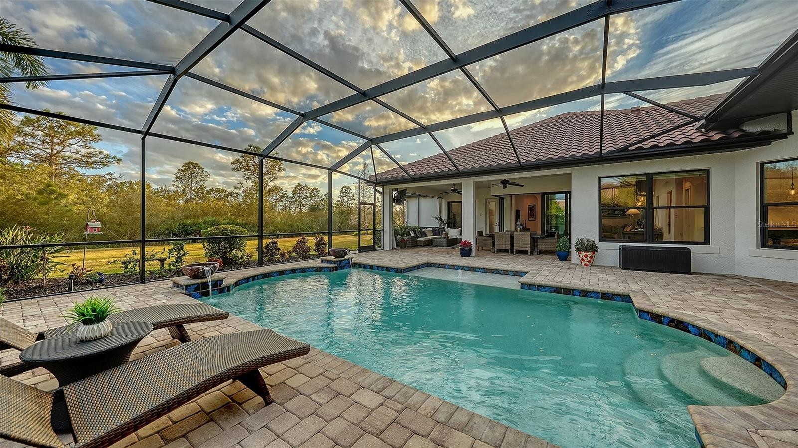 Set within the prestigious gates of The Concession, this exquisite four-bedroom John Cannon residence captures the essence of refined Florida living. Sunlight pours through expansive windows and glass doors, illuminating beautifully curated interiors and framing tranquil preserve views. Thoughtfully designed to balance elegance and comfort, the home offers both formal and casual living spaces ideal for entertaining or unwinding in style. Rich wood and tile flooring, crown molding, and timeless architectural details create a warm, sophisticated atmosphere throughout. The formal living room flows seamlessly to the pool terrace, setting the stage for memorable gatherings. At the heart of the home, the gourmet kitchen impresses with quartz countertops, a statement center island, designer tile backsplash, and top-tier appliances—perfect for hosting everything from intimate dinners to festive celebrations. A flexible den and spacious bonus room provide endless possibilities for work, relaxation, or play. The serene primary suite is a private retreat featuring wood floors, a generous walk-in closet, and a spa-inspired bath with soaking tub and separate walk-in shower. Step outside to your own resort-style escape on the screened lanai, where a sparkling heated pool, covered entertaining area, and peaceful preserve backdrop invite year-round enjoyment. Additional highlights include a large laundry room, impact windows, and a three-car side-entry garage. The Concession is renowned for its majestic estates, privacy, and timeless elegance—offering a lifestyle of distinction just minutes from premier shopping, dining, world-class beaches, and Sarasota’s vibrant arts and culture scene.