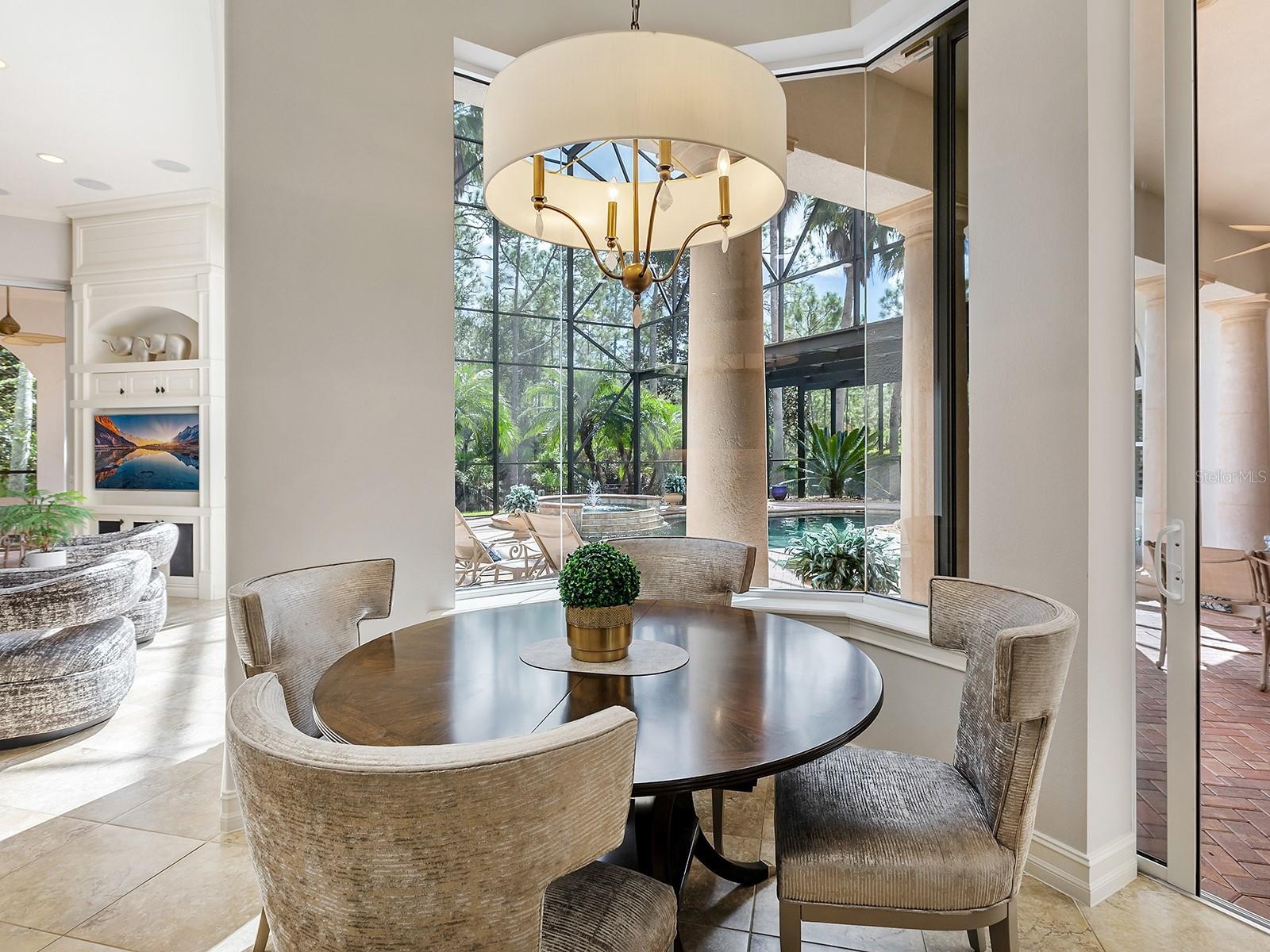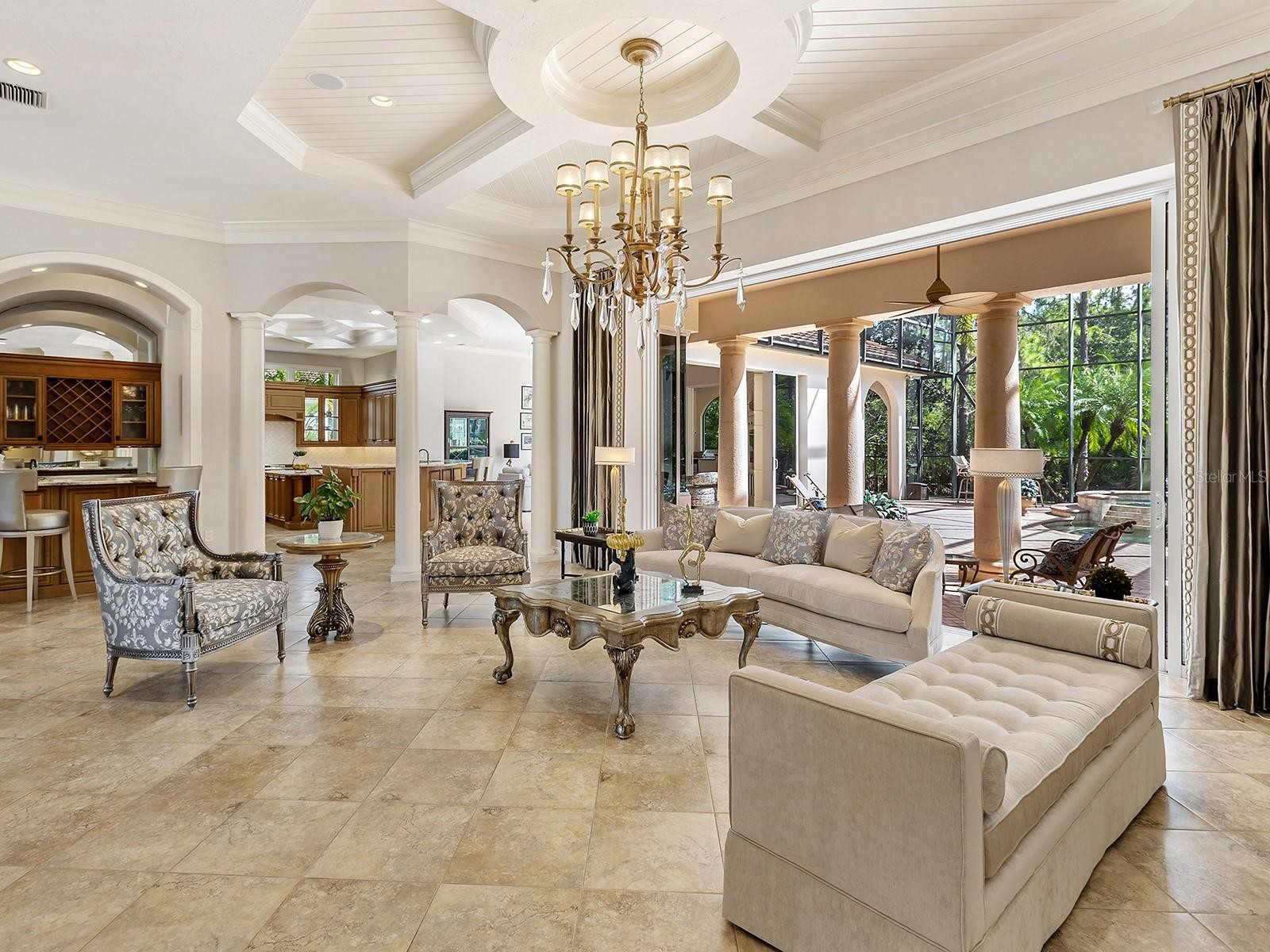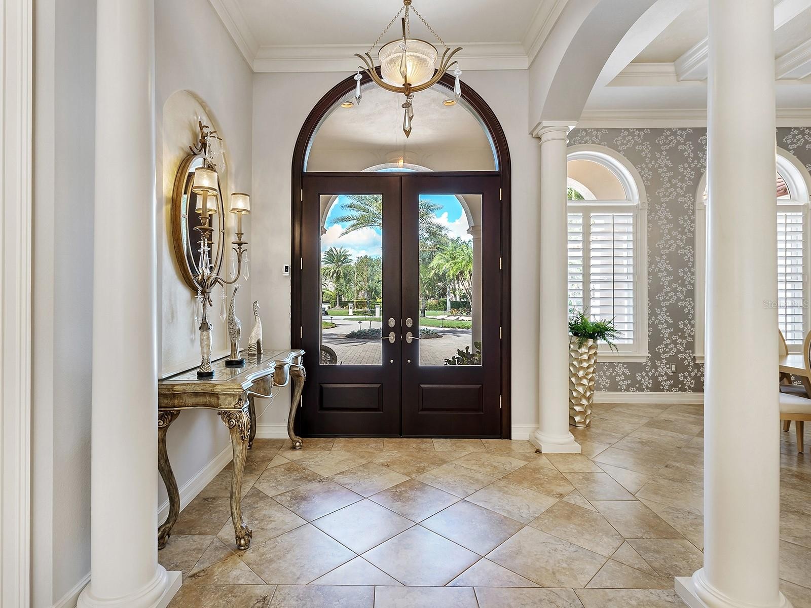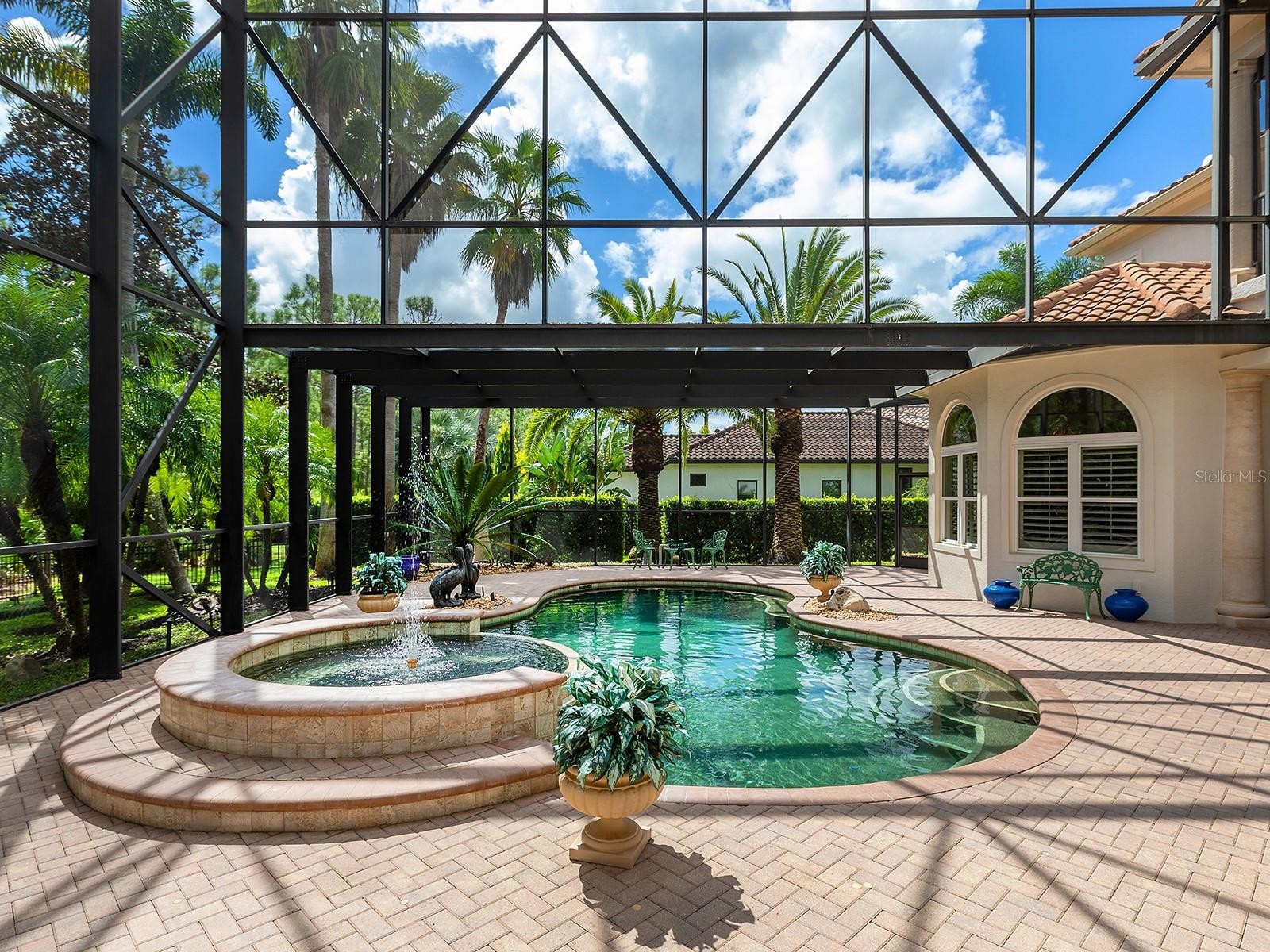 Built by Pruett Homes, this timeless estate embodies exceptional craftsmanship and thoughtful design, offering more than 7,000 square feet of living space on a beautifully landscaped 0.80-acre homesite in The Concession. A circular paver drive with a landscaped island and a barrel tile roof set a grand tone, while a welcoming front porch with stately columns leads to the double glass entry doors. Inside, architectural details include crown moldings, plantation shutters, oversized tile flooring, and soaring ceilings that enhance the home’s open, elegant aesthetic. The foyer introduces a refined entry with column accents and an art niche leading to the formal living and dining rooms. The living room centers on a gorgeous fireplace flanked by built-in shelving and opens through four-panel pocketing sliders to the lanai. A nearby wet bar features dolomite countertops with seating, wine storage, glass cabinetry, and a wine cooler—ideal for entertaining. The dining room showcases a tray ceiling with beams, designer wallpaper, and large picture windows. The enormous kitchen is perfectly designed for cooking and entertaining, highlighted by GE Monogram appliances, including a six-burner gas range with griddle, dual ovens, and a professional-grade refrigerator/freezer. Dolomite counters with bar seating, a center island, custom solid-wood cabinetry, a mother-of-pearl-accented backsplash, and an expansive walk-in pantry combine beauty and function. A breakfast nook with an aquarium window connects seamlessly to the family room, which opens fully to the lanai through dual pocketing sliders. A dedicated office with engineered wood flooring, crown molding, and surround sound provides a quiet workspace. Additional main-level spaces include a laundry room with abundant cabinetry, GE washer and dryer, and folding station, plus a half bath and a pool bath with custom tile finishes. The generous primary suite is privately positioned on the first floor, featuring engineered wood floors, a spacious, elevated seating area overlooking the pool, two oversized walk-in closets with wooden storage, and a spa-inspired bath with a jetted tub, frameless shower, dual vanities, and a makeup station. Upstairs, three expansive guest suites offer walk-in closets, plantation shutters, and en-suite or shared baths with custom tilework. The upper level also includes a spacious game and bonus room with a wet bar, granite counters, refrigerator, and microwave, plus a theater that seats 18 with tiered leather seating and a built-in bar. A large, covered terrace overlooks the pool and lanai, and an additional half bath serves the entertainment area. Outdoor living is equally impressive with a two-story screened lanai, heated saltwater pool and elevated spa with a cascading water feature, an outdoor kitchen with Stirling grill, refrigerator, sink, and bar seating, plus multiple covered lounging and dining areas. The fenced yard, landscape lighting, and lush tropical foliage complete the resort-style setting. In addition, four garage spaces—two on each side of the home—one side includes additional golf cart parking, while both feature ceiling fans, epoxy floors, and plantation shutters. Abundant storage throughout the home ensures space and functionality meet luxury at every turn. The Concession, home to the PGA Tour World Golf Championship and Senior PGA Championship is one of the most prestigious golf communities in the country and provides a serene environment.