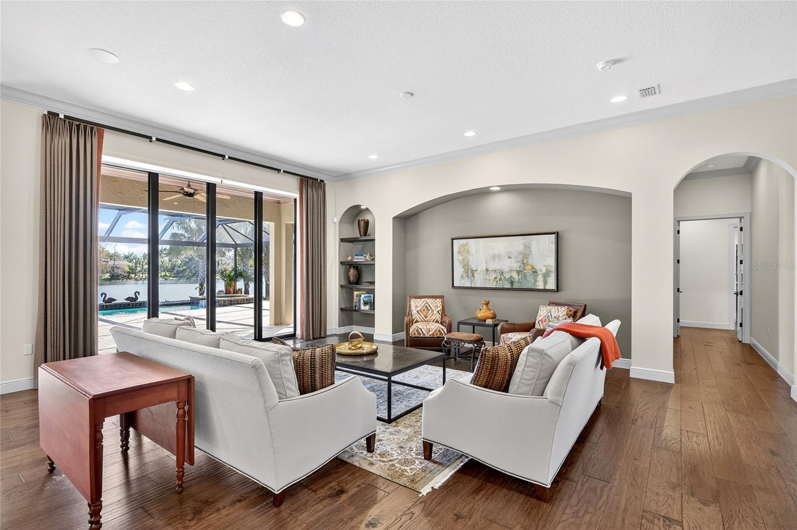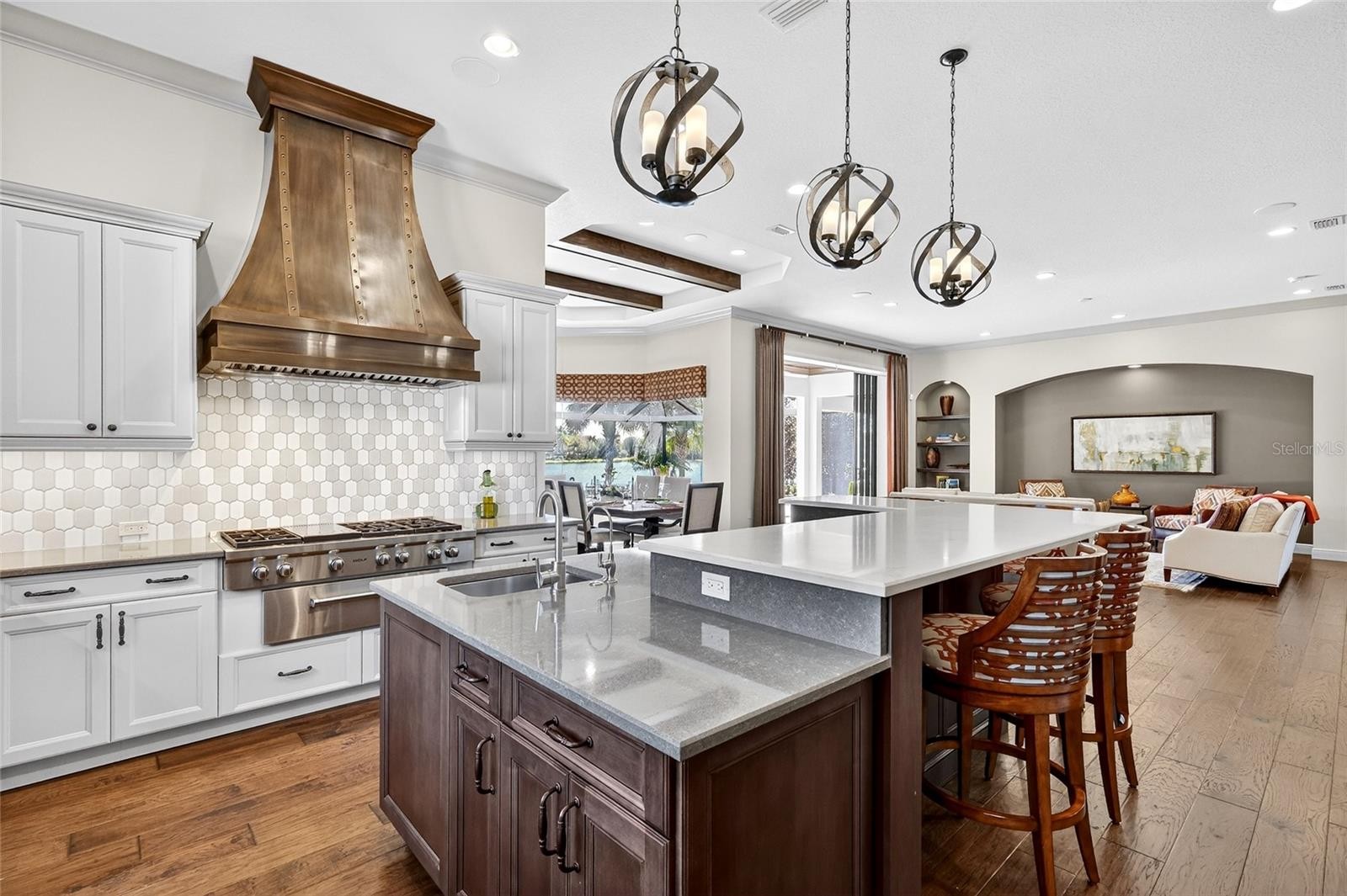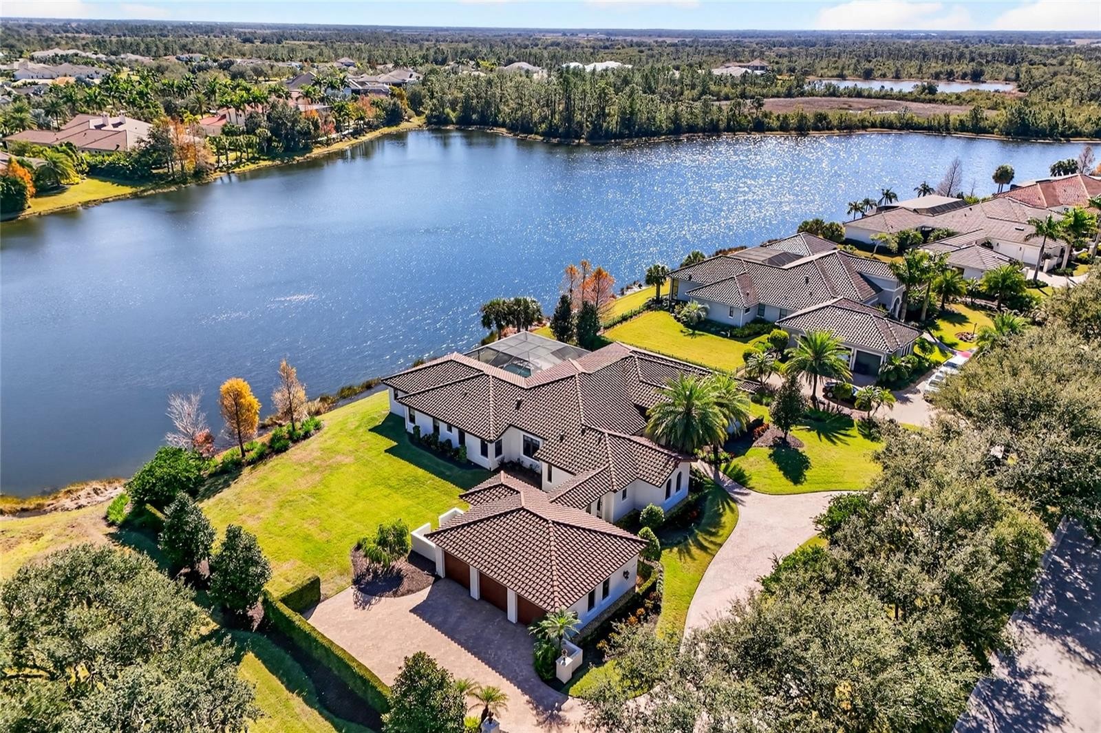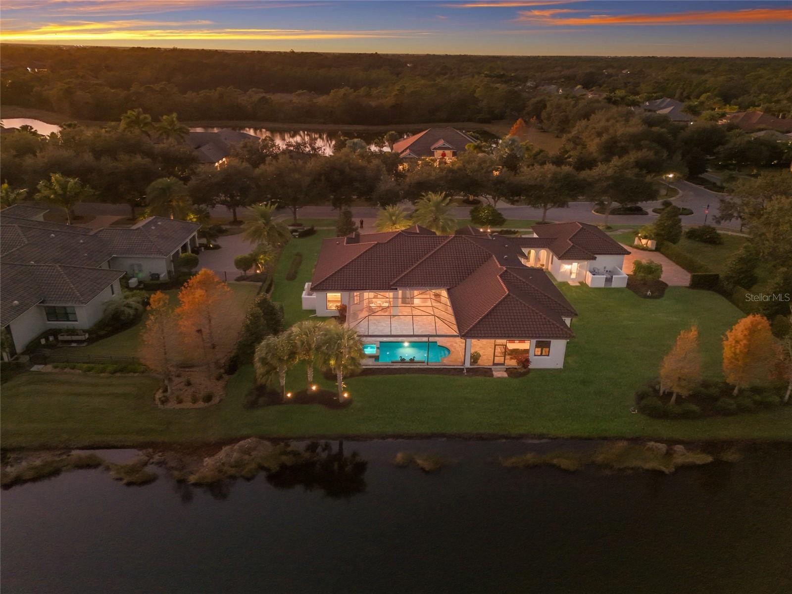 Set behind the private gates of The Concession, this custom John Cannon residence blends timeless craftsmanship with serene lake and preserve views, offering a refined and meticulously maintained retreat in one of Lakewood Ranch’s most exclusive communities. Thoughtfully designed with high-end finishes and a functional, livable layout, the home welcomes you with a circular paver drive, upgraded landscaping, and stately double iron doors that open to immediate water views. Engineered hickory hardwood floors and a wall of disappearing glass sliders anchor the generous great room, creating a seamless connection to the lanai and outdoor living spaces. The chef’s kitchen is both striking and highly functional, featuring a Sub-Zero refrigerator with custom cabinetry panels, a Wolf six-burner gas cooktop, warming drawer, KitchenAid convection oven and microwave, and a custom-fabricated copper range hood that serves as a dramatic focal point. A large two-tone quartz island, oversized picture window, and a walk-in butler’s pantry with extensive cabinetry further elevate the space. A versatile bonus room at the rear of the home offers surround-sound audio, electric window treatments, and triple sliders opening to the lanai, creating an ideal extension of the living area. Outdoors, enjoy an expansive screened retreat with unobstructed water views, tongue-and-groove cypress ceilings, custom lighting, and a fully equipped outdoor kitchen with cedar cabinetry, granite counters, built-in grill, stainless vent hood, and mounted television. The grand double-door entry to the primary suite reveals a private sanctuary complete with a spacious sitting area, spa-inspired bathroom with dual sinks, large glass-enclosed shower, and two oversized walk-in closets with custom built-ins. Two additional guest suites each offer their own full bathrooms, ensuring comfort and privacy. The dedicated office features French doors, surround-sound speakers, custom window treatments, and French doors with access to the lanai. Additional features include a generously sized laundry room with abundant cabinetry and a stainless apron-front sink, Kohler 20W whole-house generator, whole-house water filtration with reverse osmosis at the prep sink, two HVAC systems that are zoned, upgraded security with Ring doorbell, motion-sensor floodlights, and a new ADT panel, integrated surround sound, plantation shutters, custom draperies, solid wood interior doors, four-foot wide hallways, and extensive crown molding throughout. The oversized three-car side-load garage with gardening prep area and hybrid electrical outlet completes the home. A rare combination of craftsmanship, comfort, and captivating natural views, this residence embodies luxury living in The Concession.
