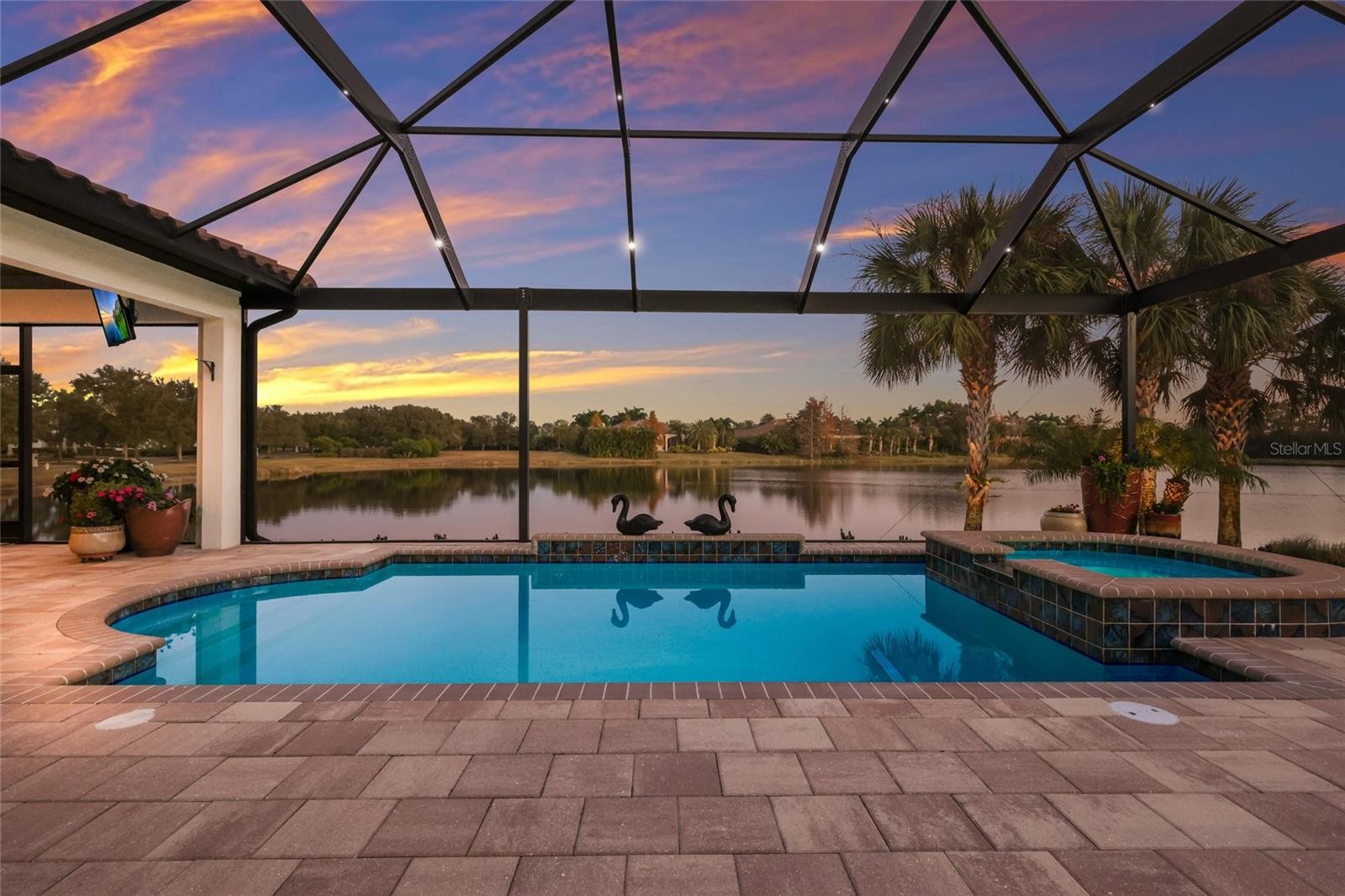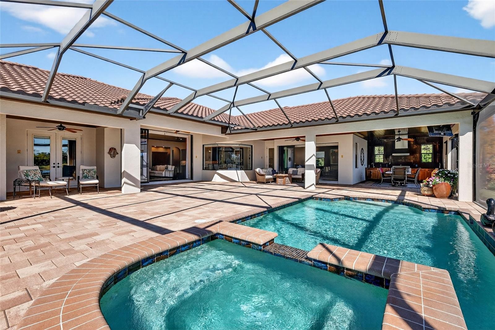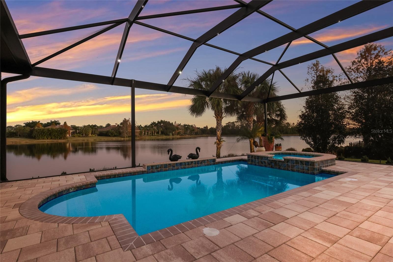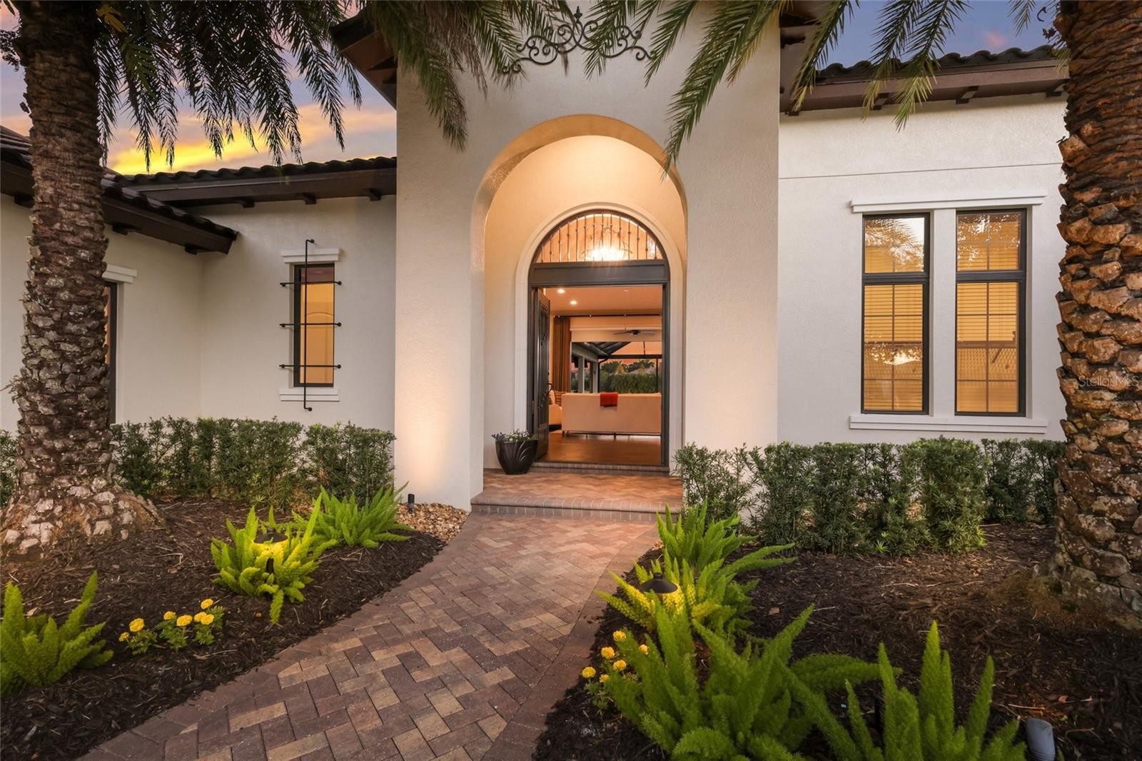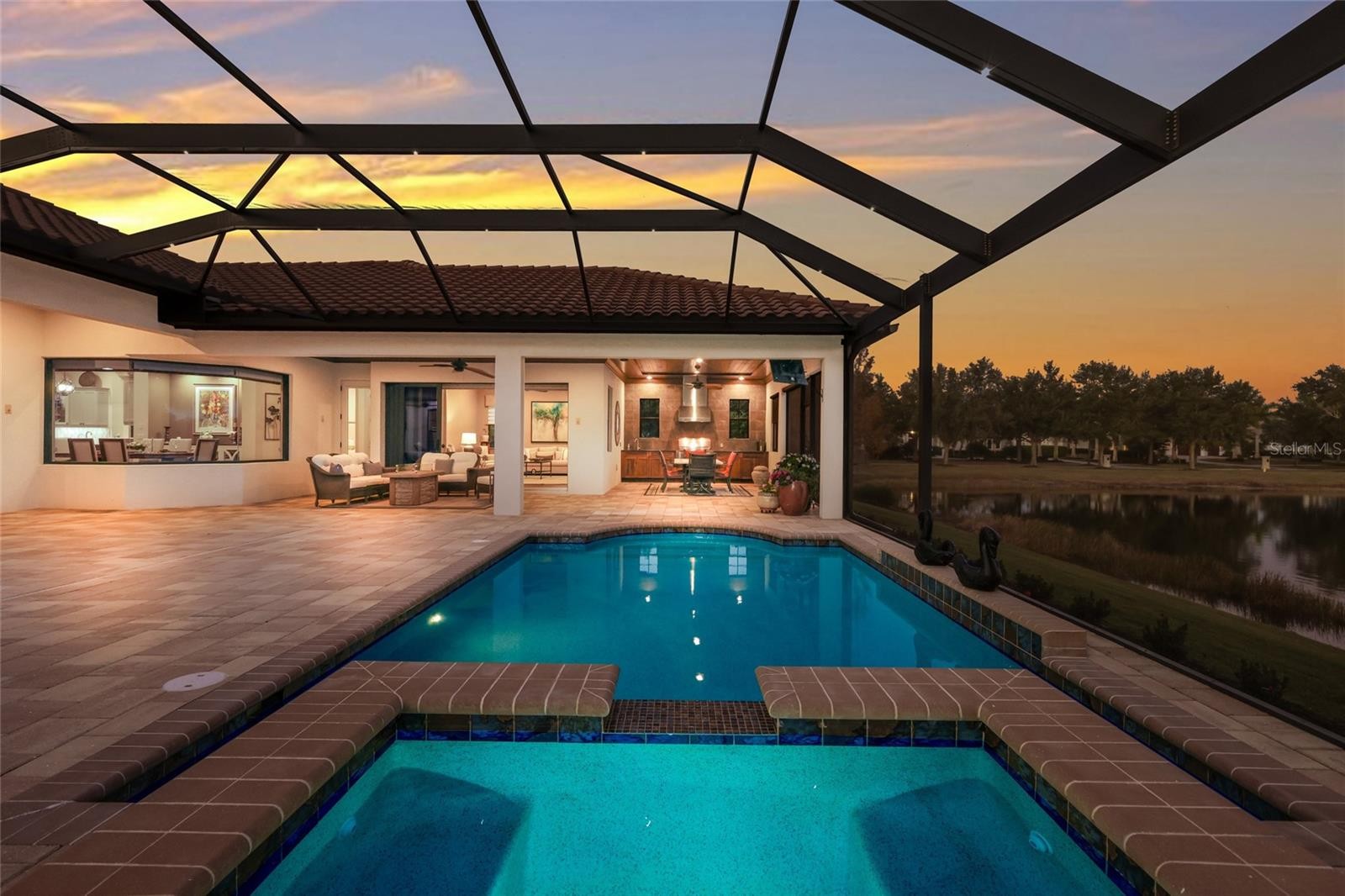 Set behind the private gates of The Concession, this custom John Cannon residence blends timeless craftsmanship with serene lake and preserve views, offering a refined and meticulously maintained retreat in one of Lakewood Ranch’s most exclusive communities. Thoughtfully designed with high-end finishes and a functional, livable layout, the home welcomes you with a circular paver drive, upgraded landscaping, and stately double iron doors that open to immediate water views. Engineered hickory hardwood floors and a wall of disappearing glass sliders anchor the generous great room, creating a seamless connection to the lanai and outdoor living spaces. The chef’s kitchen is both striking and highly functional, featuring a Sub-Zero refrigerator with custom cabinetry panels, a Wolf six-burner gas cooktop, warming drawer, KitchenAid convection oven and microwave, and a custom-fabricated copper range hood that serves as a dramatic focal point. A large two-tone quartz island, oversized picture window, and a walk-in butler’s pantry with extensive cabinetry further elevate the space. A versatile bonus room at the rear of the home offers surround-sound audio, electric window treatments, and triple sliders opening to the lanai, creating an ideal extension of the living area. Outdoors, enjoy an expansive screened retreat with unobstructed water views, tongue-and-groove cypress ceilings, custom lighting, and a fully equipped outdoor kitchen with cedar cabinetry, granite counters, built-in grill, stainless vent hood, and mounted television. The grand double-door entry to the primary suite reveals a private sanctuary complete with a spacious sitting area, spa-inspired bathroom with dual sinks, large glass-enclosed shower, and two oversized walk-in closets with custom built-ins. Two additional guest suites each offer their own full bathrooms, ensuring comfort and privacy. The dedicated office features French doors, surround-sound speakers, custom window treatments, and French doors with access to the lanai. Additional features include a generously sized laundry room with abundant cabinetry and a stainless apron-front sink, Kohler 20W whole-house generator, whole-house water filtration with reverse osmosis at the prep sink, two HVAC systems that are zoned, upgraded security with Ring doorbell, motion-sensor floodlights, and a new ADT panel, integrated surround sound, plantation shutters, custom draperies, solid wood interior doors, four-foot wide hallways, and extensive crown molding throughout. The oversized three-car side-load garage with gardening prep area and hybrid electrical outlet completes the home. A rare combination of craftsmanship, comfort, and captivating natural views, this residence embodies luxury living in The Concession.