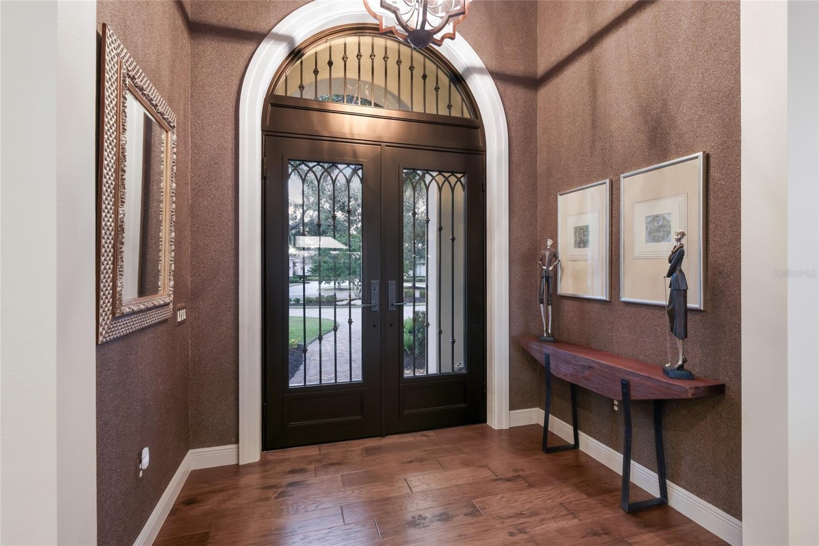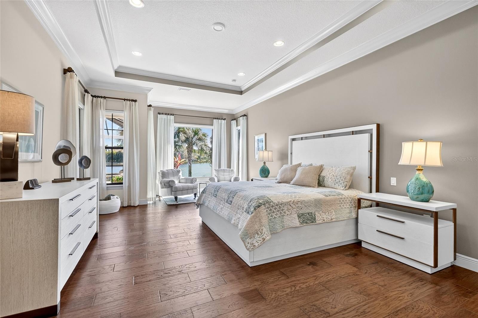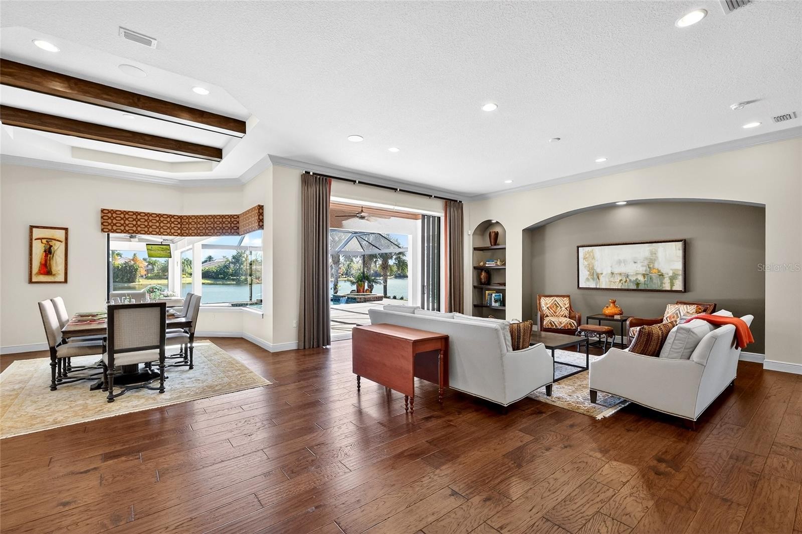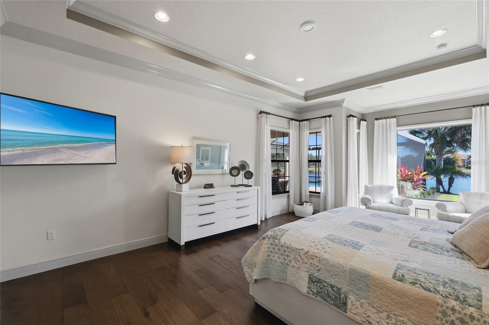 Set behind the private gates of The Concession, this custom John Cannon residence blends timeless craftsmanship with serene lake and preserve views, offering a refined and meticulously maintained retreat in one of Lakewood Ranch’s most exclusive communities. Thoughtfully designed with high-end finishes and a functional, livable layout, the home welcomes you with a circular paver drive, upgraded landscaping, and stately double iron doors that open to immediate water views. Engineered hickory hardwood floors and a wall of disappearing glass sliders anchor the generous great room, creating a seamless connection to the lanai and outdoor living spaces. The chef’s kitchen is both striking and highly functional, featuring a Sub-Zero refrigerator with custom cabinetry panels, a Wolf six-burner gas cooktop, warming drawer, KitchenAid convection oven and microwave, and a custom-fabricated copper range hood that serves as a dramatic focal point. A large two-tone quartz island, oversized picture window, and a walk-in butler’s pantry with extensive cabinetry further elevate the space. A versatile bonus room at the rear of the home offers surround-sound audio, electric window treatments, and triple sliders opening to the lanai, creating an ideal extension of the living area. Outdoors, enjoy an expansive screened retreat with unobstructed water views, tongue-and-groove cypress ceilings, custom lighting, and a fully equipped outdoor kitchen with cedar cabinetry, granite counters, built-in grill, stainless vent hood, and mounted television. The grand double-door entry to the primary suite reveals a private sanctuary complete with a spacious sitting area, spa-inspired bathroom with dual sinks, large glass-enclosed shower, and two oversized walk-in closets with custom built-ins. Two additional guest suites each offer their own full bathrooms, ensuring comfort and privacy. The dedicated office features French doors, surround-sound speakers, custom window treatments, and French doors with access to the lanai. Additional features include a generously sized laundry room with abundant cabinetry and a stainless apron-front sink, Kohler 20W whole-house generator, whole-house water filtration with reverse osmosis at the prep sink, two HVAC systems that are zoned, upgraded security with Ring doorbell, motion-sensor floodlights, and a new ADT panel, integrated surround sound, plantation shutters, custom draperies, solid wood interior doors, four-foot wide hallways, and extensive crown molding throughout. The oversized three-car side-load garage with gardening prep area and hybrid electrical outlet completes the home. A rare combination of craftsmanship, comfort, and captivating natural views, this residence embodies luxury living in The Concession.