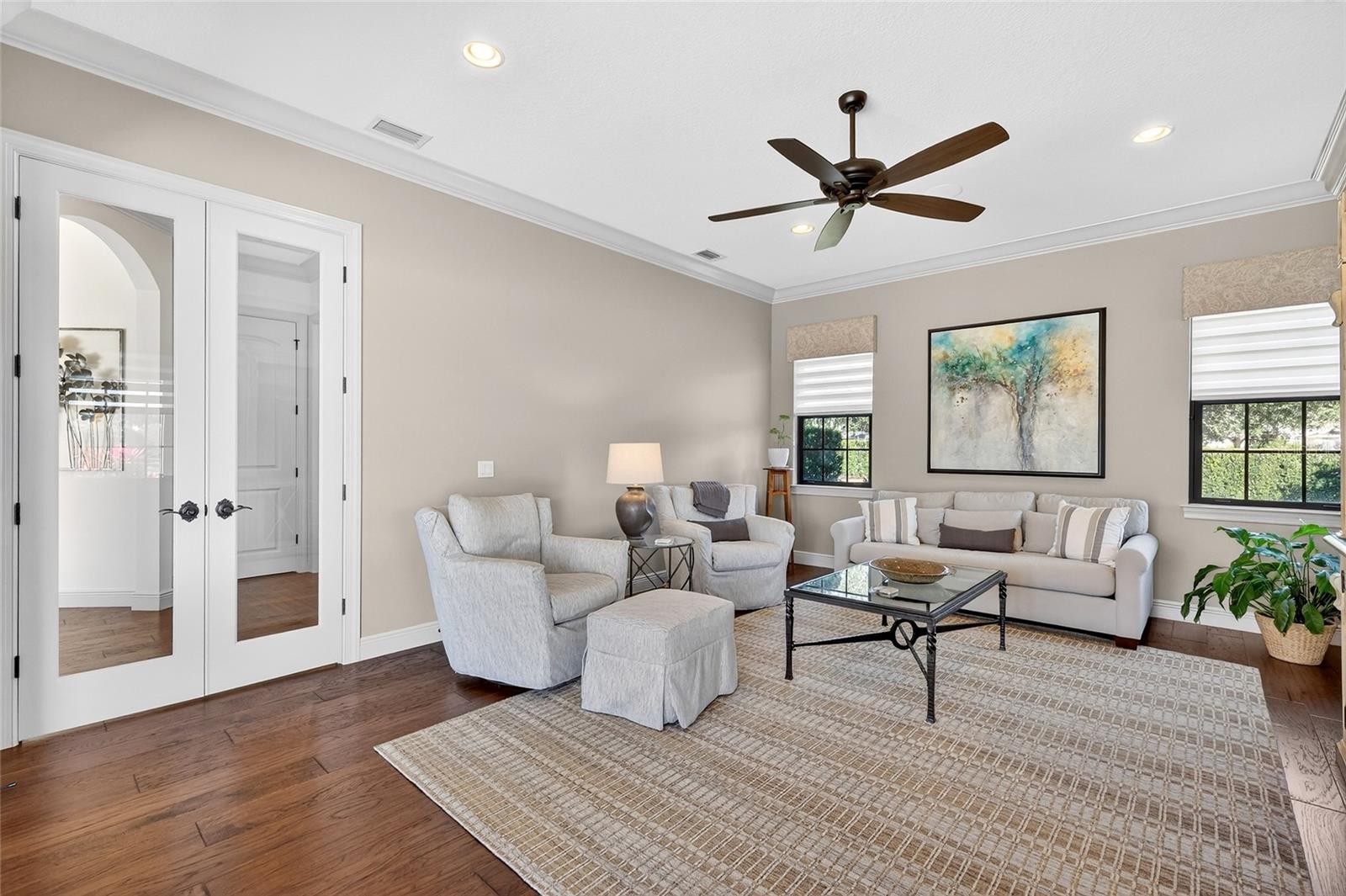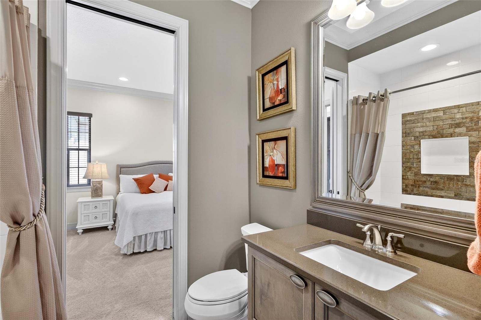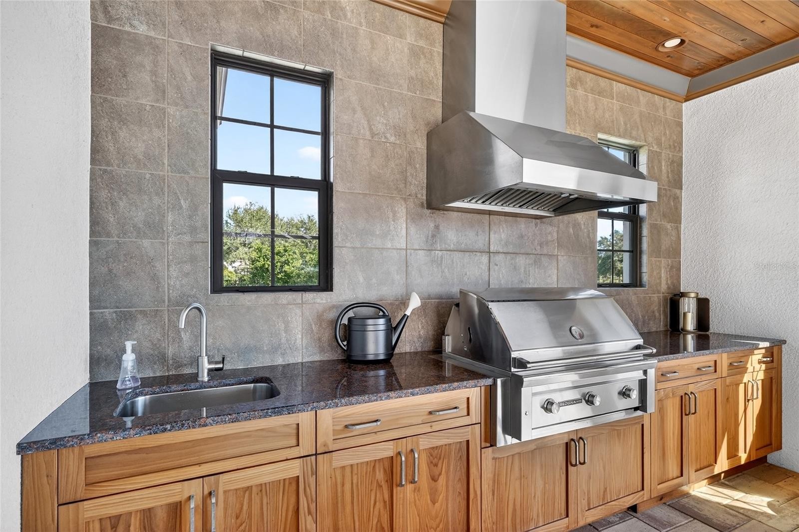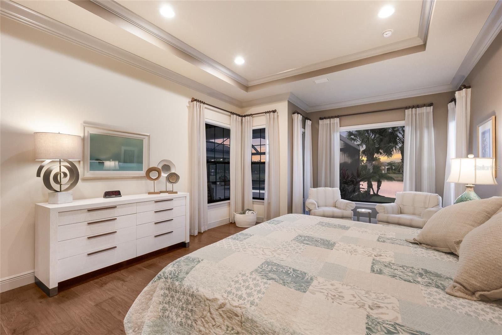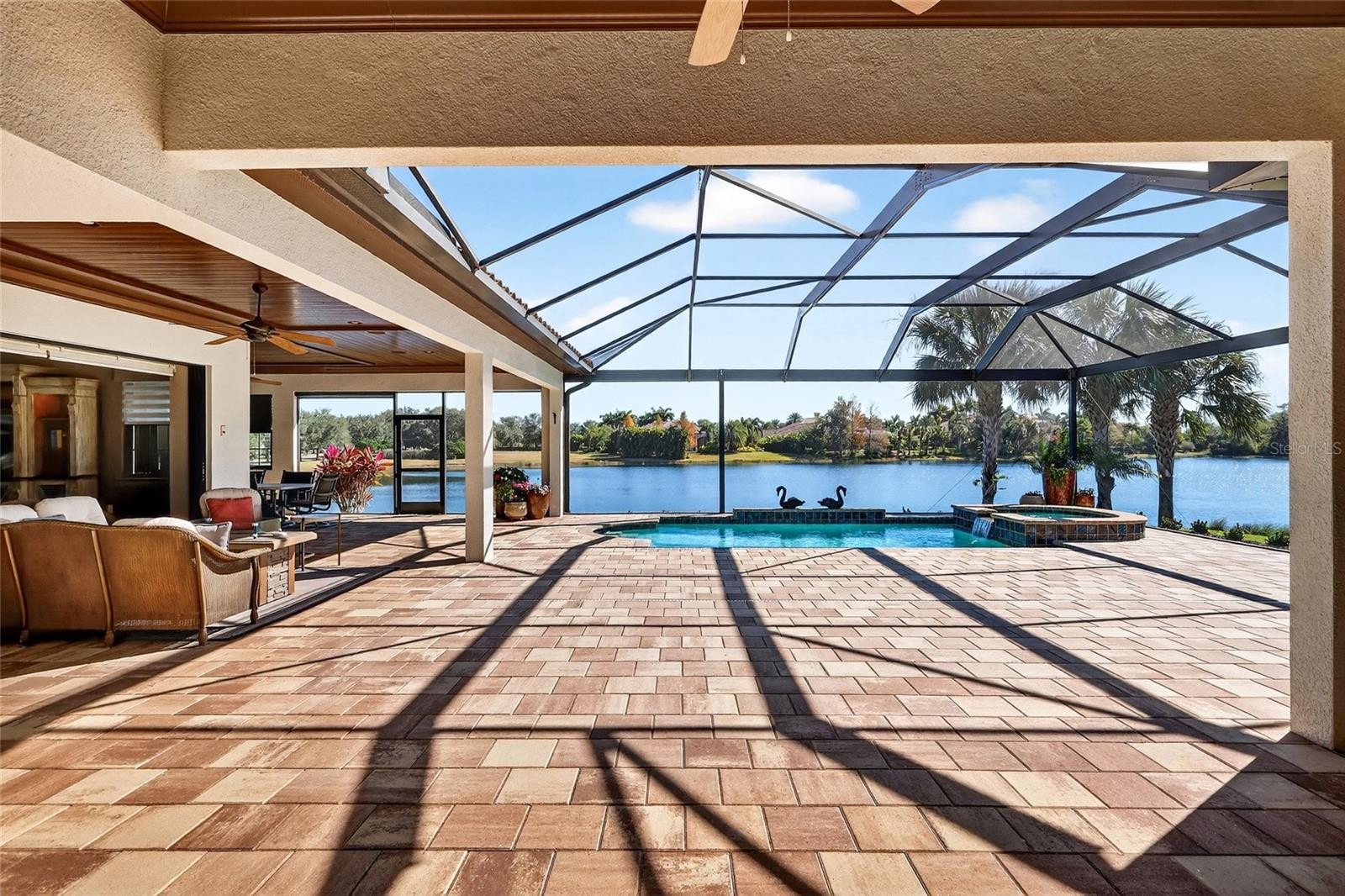 Set behind the private gates of The Concession, this custom John Cannon residence blends timeless craftsmanship with serene lake and preserve views, offering a refined and meticulously maintained retreat in one of Lakewood Ranch’s most exclusive communities. Thoughtfully designed with high-end finishes and a functional, livable layout, the home welcomes you with a circular paver drive, upgraded landscaping, and stately double iron doors that open to immediate water views. Engineered hickory hardwood floors and a wall of disappearing glass sliders anchor the generous great room, creating a seamless connection to the lanai and outdoor living spaces. The chef’s kitchen is both striking and highly functional, featuring a Sub-Zero refrigerator with custom cabinetry panels, a Wolf six-burner gas cooktop, warming drawer, KitchenAid convection oven and microwave, and a custom-fabricated copper range hood that serves as a dramatic focal point. A large two-tone quartz island, oversized picture window, and a walk-in butler’s pantry with extensive cabinetry further elevate the space. A versatile bonus room at the rear of the home offers surround-sound audio, electric window treatments, and triple sliders opening to the lanai, creating an ideal extension of the living area. Outdoors, enjoy an expansive screened retreat with unobstructed water views, tongue-and-groove cypress ceilings, custom lighting, and a fully equipped outdoor kitchen with cedar cabinetry, granite counters, built-in grill, stainless vent hood, and mounted television. The grand double-door entry to the primary suite reveals a private sanctuary complete with a spacious sitting area, spa-inspired bathroom with dual sinks, large glass-enclosed shower, and two oversized walk-in closets with custom built-ins. Two additional guest suites each offer their own full bathrooms, ensuring comfort and privacy. The dedicated office features French doors, surround-sound speakers, custom window treatments, and French doors with access to the lanai. Additional features include a generously sized laundry room with abundant cabinetry and a stainless apron-front sink, Kohler 20W whole-house generator, whole-house water filtration with reverse osmosis at the prep sink, two HVAC systems that are zoned, upgraded security with Ring doorbell, motion-sensor floodlights, and a new ADT panel, integrated surround sound, plantation shutters, custom draperies, solid wood interior doors, four-foot wide hallways, and extensive crown molding throughout. The oversized three-car side-load garage with gardening prep area and hybrid electrical outlet completes the home. A rare combination of craftsmanship, comfort, and captivating natural views, this residence embodies luxury living in The Concession.