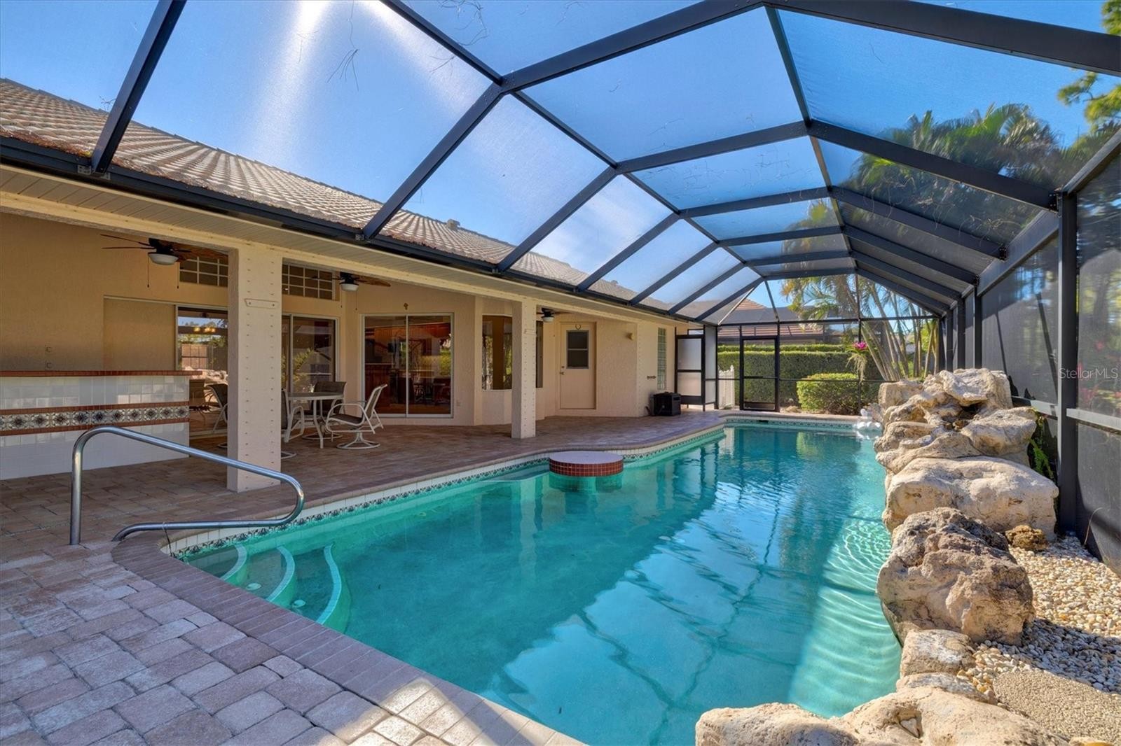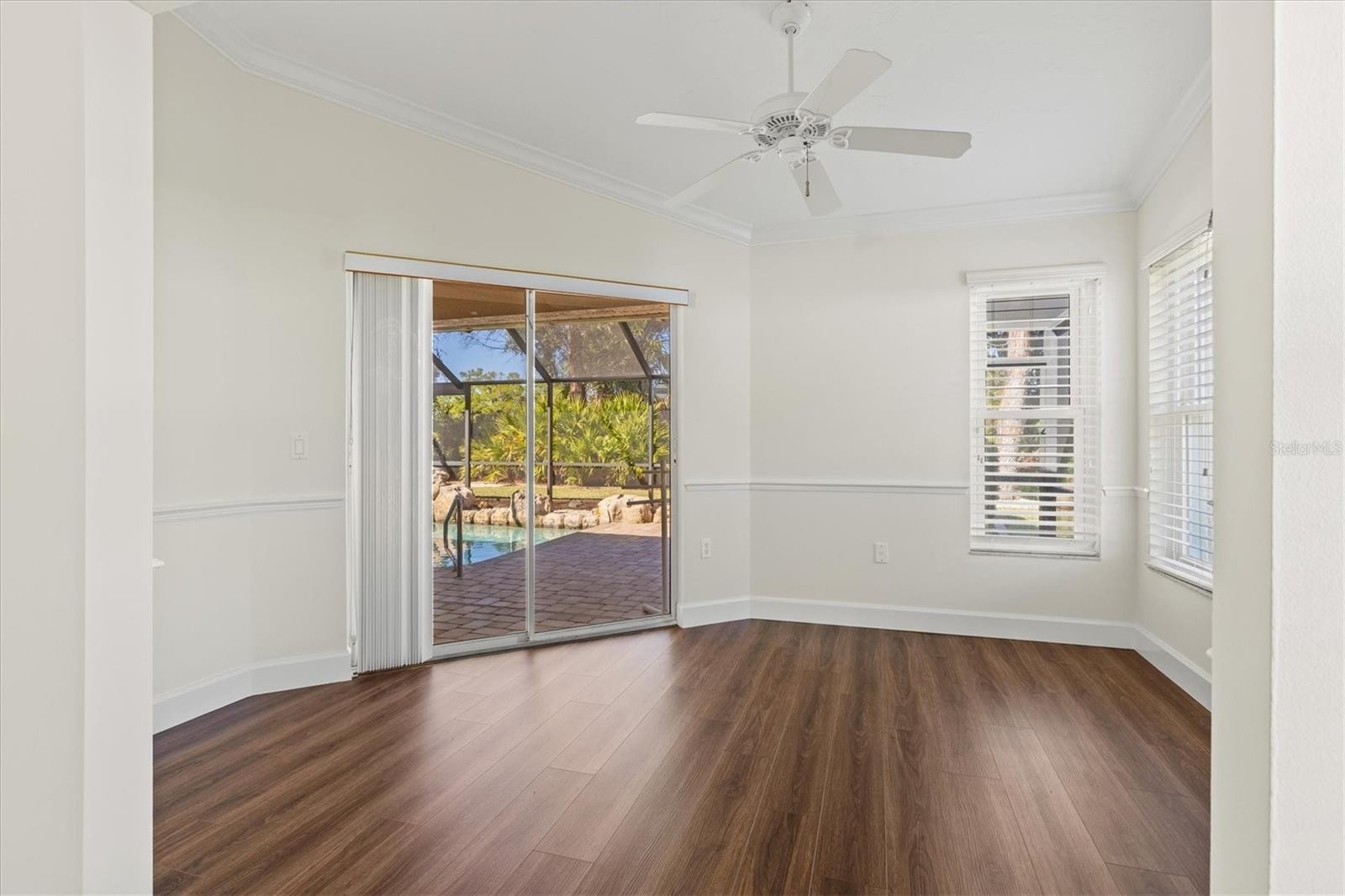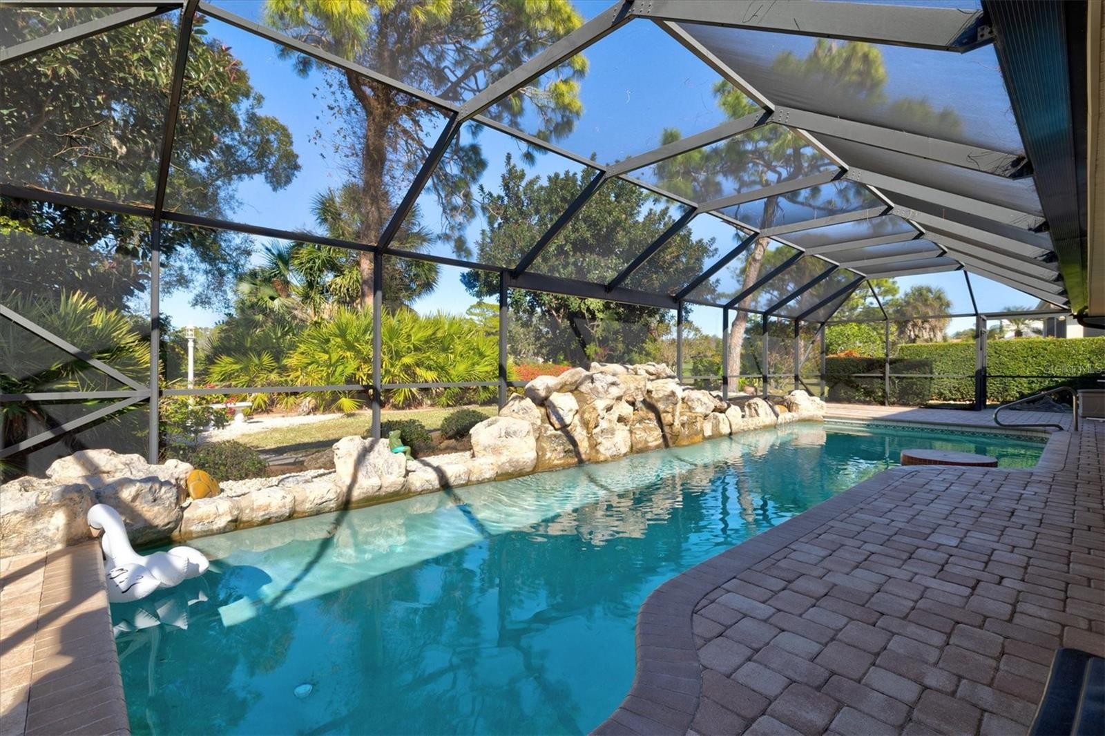 One or more photo(s) has been virtually staged. Welcome home to Calusa Lakes, a sought-after gated golf community nestled along the 5th fairway and set on a spacious 0.28-acre lot. This stunning pool home welcomes you with a circular driveway and a 3-car garage. Inside, you’ll find nearly 2,400 square feet of beautifully refreshed living space featuring fresh paint throughout, soaring ceilings in the great room, and stylish upgrades like brand-new crown molding and 5 ½-inch baseboards. A separate dining room adds extra charm with a shiplap accent wall, while the kitchen shines with stainless steel appliances, rich wood cabinetry, and plenty of counter space for everyday living or entertaining. Just off the kitchen, a window-lined breakfast nook overlooks the pool area, creating the perfect spot to start your morning with a view. The spacious owner’s suite is a true retreat, complete with brand-new luxury vinyl plank flooring and a separate sitting area ideal for a home office, library, or cozy lounge. Sliding glass doors lead directly to the lanai, and the ensuite bathroom offers a spa-like feel with a large soaking tub, a glass-enclosed walk-in shower, and a generous walk-in closet. The split-bedroom floor plan provides much-desired privacy, and the guest bathroom conveniently offers direct access to the pool area. You’ll also love the indoor laundry room with ample storage and a sink, making daily routines easy and organized. Step outside to your own private oasis, where a screened-in paver lanai frames a sparkling pool complete with a rock waterfall feature and a swim-up bar table for ultimate Florida living. An outdoor bar area is ready for grilling and hosting, plus there’s an outdoor shower for added convenience after a day in the sun. All of this comes with beautiful golf course views of the 5th fairway, and peace of mind knowing the AC was replaced in 2024. Calusa Lakes offers low HOA fees, no CDD fees, and a naturally beautiful setting spread across 460 acres of mature pines and oaks, with community perks including 28 lakes, a semi-private 18-hole golf course with optional membership, Har-Tru tennis courts, and a clubhouse with dining. Perfectly located in Nokomis between Sarasota and Venice, you’re just minutes from I-75, shopping, dining, boating, the Legacy Trail, and the white sands of Nokomis Beach, plus the charm of Venice Island’s boutiques and restaurants. Schedule your private showing today and come experience the lifestyle this home and community provide.