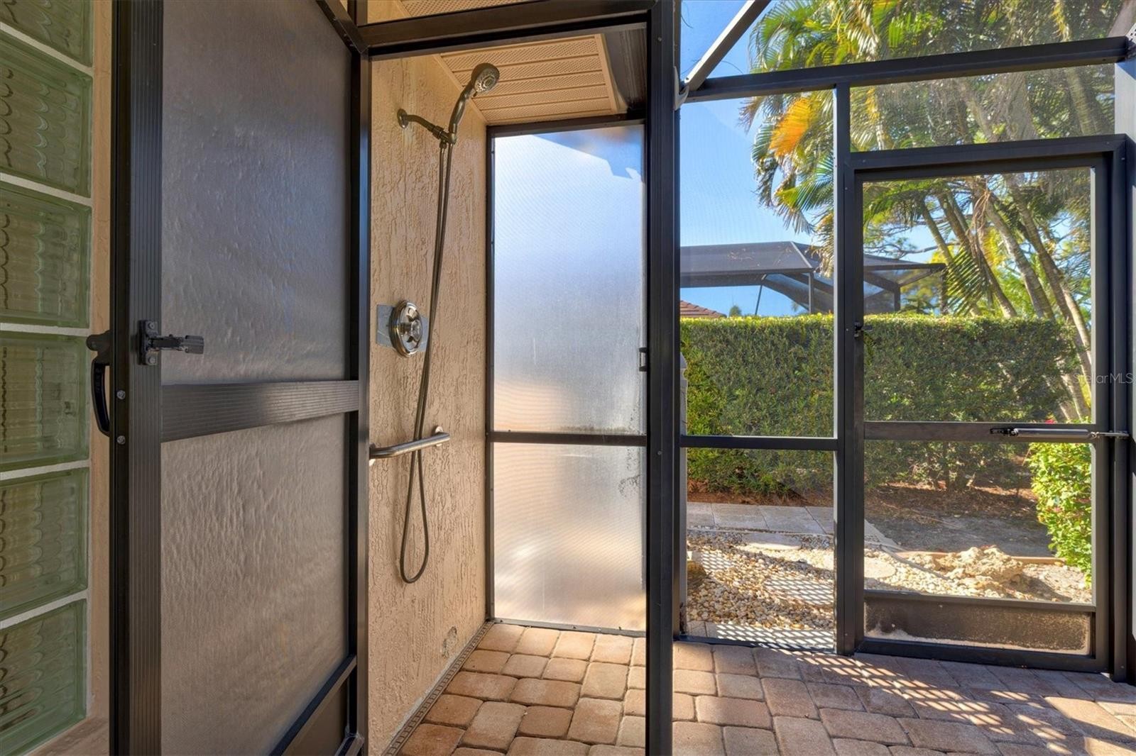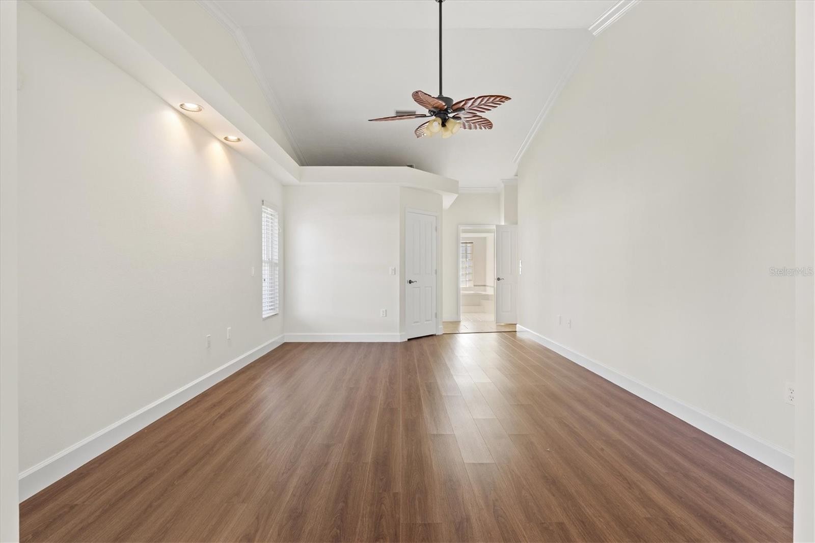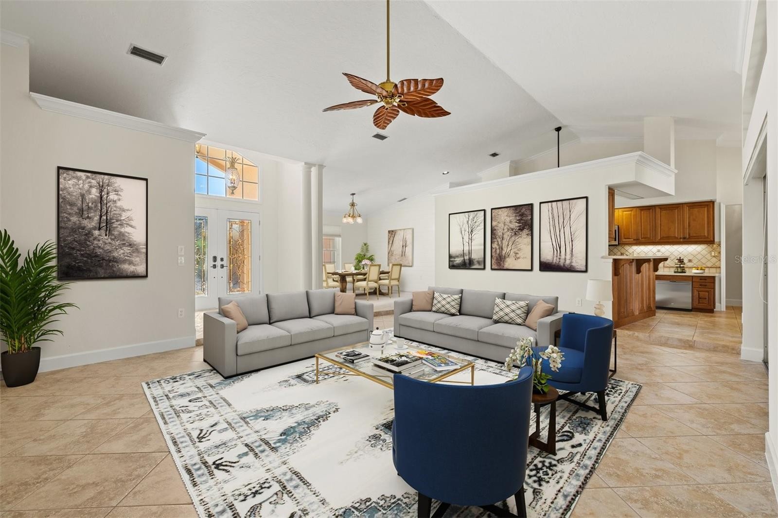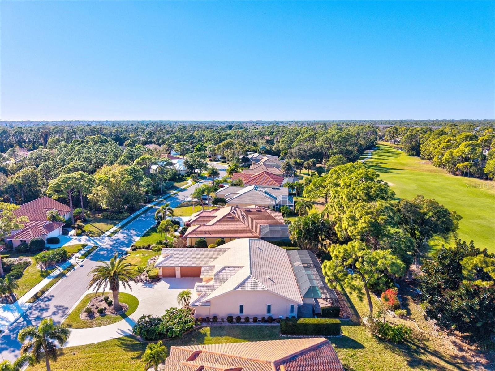 One or more photo(s) has been virtually staged. Welcome home to Calusa Lakes, a sought-after gated golf community nestled along the 5th fairway and set on a spacious 0.28-acre lot. This stunning pool home welcomes you with a circular driveway and a 3-car garage. Inside, you’ll find nearly 2,400 square feet of beautifully refreshed living space featuring fresh paint throughout, soaring ceilings in the great room, and stylish upgrades like brand-new crown molding and 5 ½-inch baseboards. A separate dining room adds extra charm with a shiplap accent wall, while the kitchen shines with stainless steel appliances, rich wood cabinetry, and plenty of counter space for everyday living or entertaining. Just off the kitchen, a window-lined breakfast nook overlooks the pool area, creating the perfect spot to start your morning with a view. The spacious owner’s suite is a true retreat, complete with brand-new luxury vinyl plank flooring and a separate sitting area ideal for a home office, library, or cozy lounge. Sliding glass doors lead directly to the lanai, and the ensuite bathroom offers a spa-like feel with a large soaking tub, a glass-enclosed walk-in shower, and a generous walk-in closet. The split-bedroom floor plan provides much-desired privacy, and the guest bathroom conveniently offers direct access to the pool area. You’ll also love the indoor laundry room with ample storage and a sink, making daily routines easy and organized. Step outside to your own private oasis, where a screened-in paver lanai frames a sparkling pool complete with a rock waterfall feature and a swim-up bar table for ultimate Florida living. An outdoor bar area is ready for grilling and hosting, plus there’s an outdoor shower for added convenience after a day in the sun. All of this comes with beautiful golf course views of the 5th fairway, and peace of mind knowing the AC was replaced in 2024. Calusa Lakes offers low HOA fees, no CDD fees, and a naturally beautiful setting spread across 460 acres of mature pines and oaks, with community perks including 28 lakes, a semi-private 18-hole golf course with optional membership, Har-Tru tennis courts, and a clubhouse with dining. Perfectly located in Nokomis between Sarasota and Venice, you’re just minutes from I-75, shopping, dining, boating, the Legacy Trail, and the white sands of Nokomis Beach, plus the charm of Venice Island’s boutiques and restaurants. Schedule your private showing today and come experience the lifestyle this home and community provide.