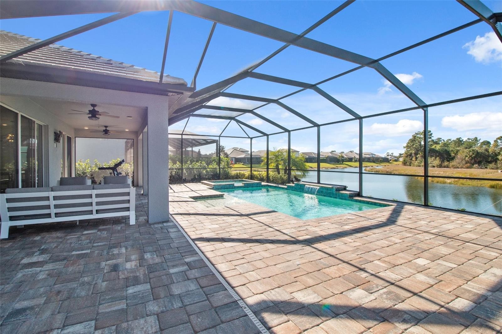 Luxury, space, and privacy converge in this exceptional lakefront residence, thoughtfully designed to balance refined elegance with everyday livability. Offering over 3,100 square feet and the largest floor plan currently available, this flexible two-story home is complemented by resort-style outdoor living and tranquil water views. Situated on a premium private lake-view lot within a gated enclave of Wellen Park, the residence features four bedrooms, four full baths, and a three-car garage, with a layout ideal for both elevated entertaining and comfortable daily living. The main level includes three bedrooms, three full baths, and a dedicated office, all centered around an open-concept living, dining, and kitchen space filled with natural light. At the heart of the home, the chef’s kitchen is appointed with Cambria quartz countertops, a generous center island, a walk-in pantry, and a GE Café smart appliance suite, including a built-in Keurig coffee system. Seamless flow into the living and dining areas creates an inviting setting for gatherings of any scale. The upper level offers a huge bonus room and a private bedroom with a full bath, providing exceptional versatility for guests, multigenerational living, or a game room with a guest suite. The primary suite is a serene retreat, featuring peaceful lake views, a private morning kitchen, an expansive walk-in closet, and a spa-inspired bath highlighted by a dramatic walk-in shower. Outdoor living is equally compelling, with a spacious screened lanai designed for true Florida enjoyment. The setting includes a saltwater pool with sun shelf and spa, ample covered entertaining space, and uninterrupted lake views—creating a private, resort-like atmosphere. Additional features include hurricane-impact windows and doors rated up to Cat 4, advanced smart home technology, and a fully owned solar panel system providing meaningful long-term energy efficiency. Residents enjoy access to a private clubhouse, resort-style pool, and pickleball courts, all just a short golf cart ride to the dining, shopping, and lifestyle offerings of Wellen Park, one of the nation’s most dynamic master-planned communities. Private showings available by appointment only.