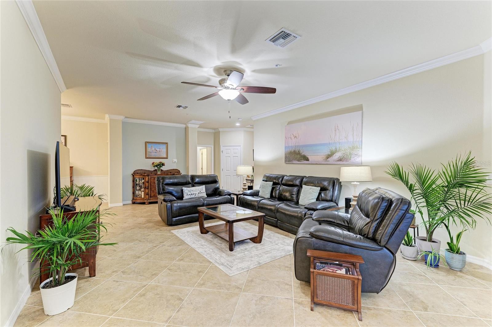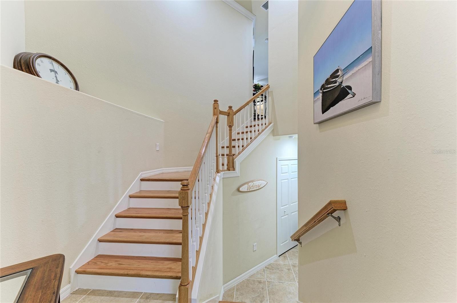 This well maintained “Oleander” Coach Home in the maintenance-free, gated, resort-style community of Gran Paradiso. This UPDATED, second-floor unit offers three bedrooms, two bathrooms, and a two and a half car garage in 2187 Square feet of living space! The foyer opens to a spacious, open-concept living and dining area with ceramic tile set on the diagonal. The kitchen features 42" wood cabinets with brushed nickel hardware, new QUARTZ countertops, a 2021 stove, tile backsplash and pantry. DOUBLE IMPACT SLIDERS lead to the oversized TILED lanai with custom UVA solar shades, valance, dual ceiling fans, and beautiful pond view. The split floor plan offers plenty privacy. The master suite includes his-and-her walk-in closets, double vanities, a large walk-in shower, and a garden tub. The oversized two-car garage offers extra storage and an insulated garage door, in 2024 all SPRINGS AND WHEELS REPLACED. Additional UPGRADES include LARGE STORAGE CLOSET, a professionally installed Water-shield WATER SOFTENER SYSTEM, watts water CIRCULATION PUMP, for instant hot water, and a 2018 upgraded water heater. AC UPGRADES in 2024 to outdoor unit and new Garbage disposal 2024. HURRICANE RATED IMPACT WINDOWS will provide added peace of mind. Whole building UPGRADES include Painted building 2024 and Driveways leveled, cleaned and sealed 2025. Other updates include- TILED LANAI floor, LUXURY VINYL in all bedrooms with accent trim, custom ceiling fixtures, dining room wainscoting, red oak stairway with risers, and shaker cabinets in the laundry room. Gran Paradiso is a Tuscan-inspired, luxury, maintenance-free community in Wellen Park’s West Villages. Amenities include a resort-style zero-entry pool, fitness center, tennis, pickleball, playground, and spa-like locker rooms with steam rooms and saunas.