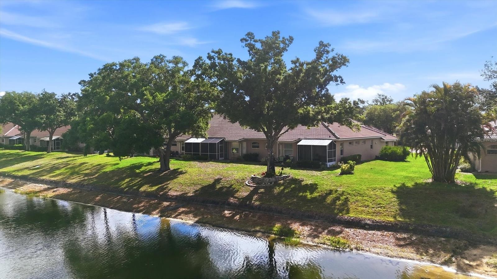 A gorgeous lake view with majestic oak trees make this a beautiful setting to enjoy your morning coffee. This 2bedroom plus den Villa is furnished TURNKEY!! The flexible floor plan has soaring 11 foot ceilings throughout. The kitchen has newer appliances, a spacious pantry with full size washer and dryer. The kitchen and living room have an open view through to the lake. This villa has two bedrooms plus den with built in shelving. The bonus/Florida room has sun/privacy shades. The primary suite features include a huge walk in closet and deluxe ensuite with Roman shower. The guest room features a walk in closet as well. The home has plenty of windows throughout that include blinds and custom window treatments. The screened covered lanai has a brick floor, shady trees and is perfect for reading and relaxing. Extra paver patio for grilling or sunbathing. Oversized two car garage with extra storage. Short walking distance to the villa's pool and clubhouse. The main clubhouse offers a larger pool, fitness center, tennis and pickle ball courts. Scheduled activities are available at both. Maintenance and roofs are the responsibility off the HOA. Close to gulf coast beaches, Legacy Trail bicycle path, golf and 2 major league spring training baseball stadiums. Easy access to I75, and both Fort Myers International and Sarasota airports are about a 35 minute drive. NEW TILE ROOF 10/25 and newly painted exterior! Make this villa your home or winter home today!