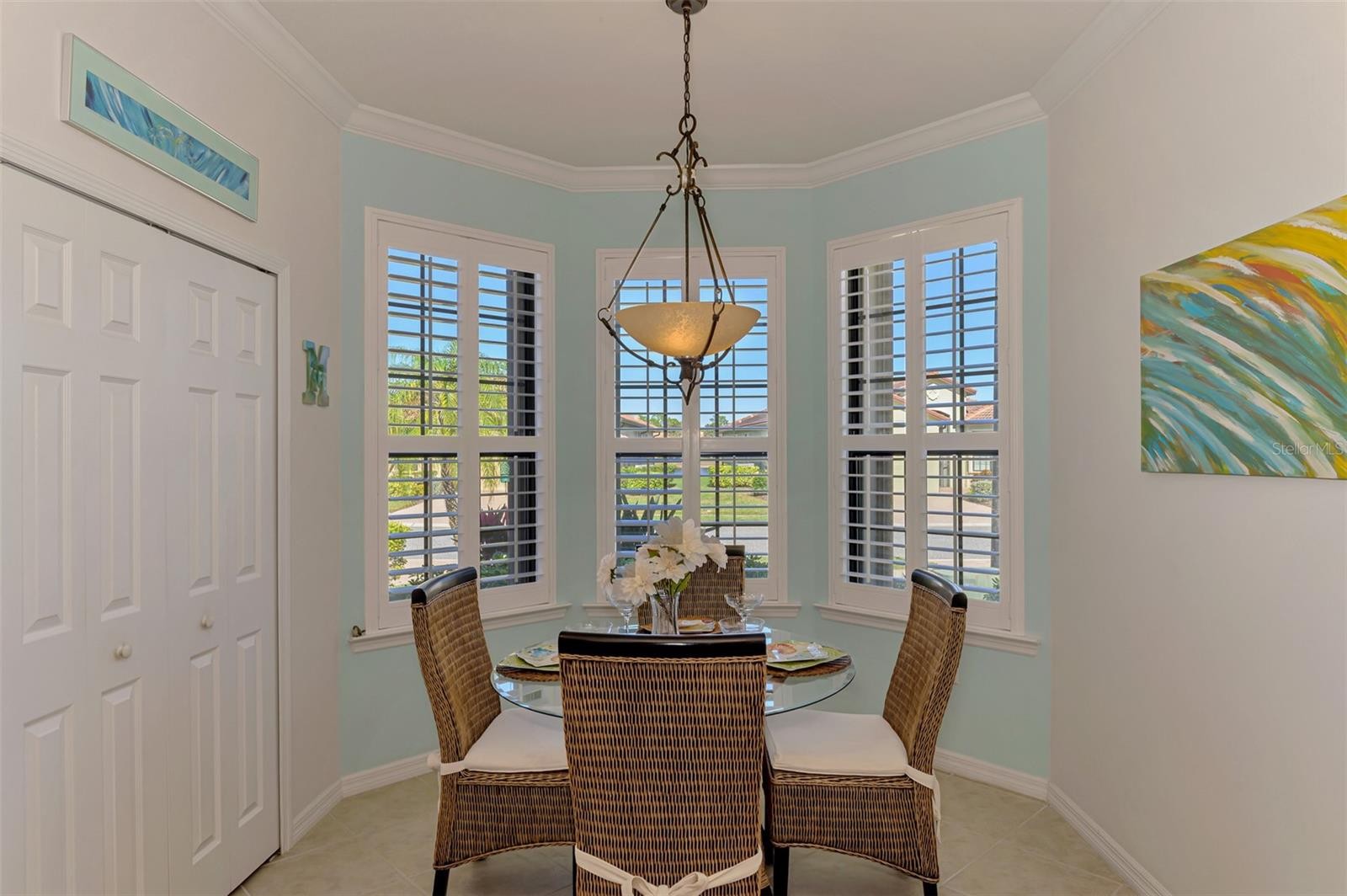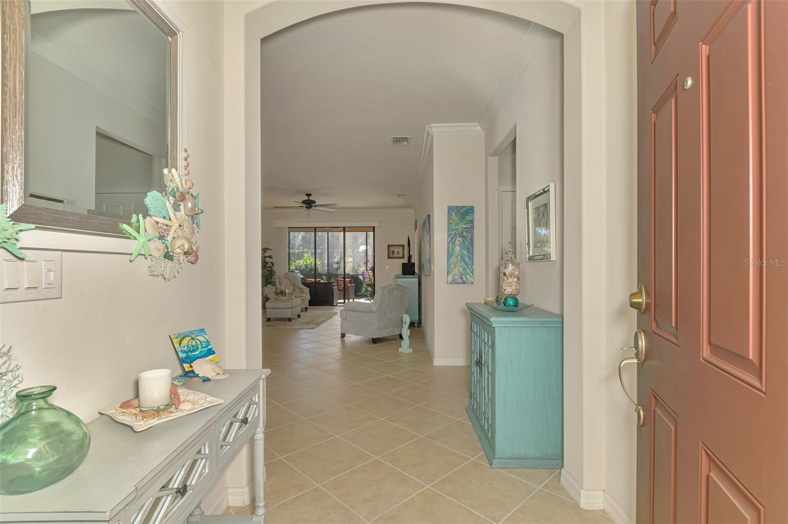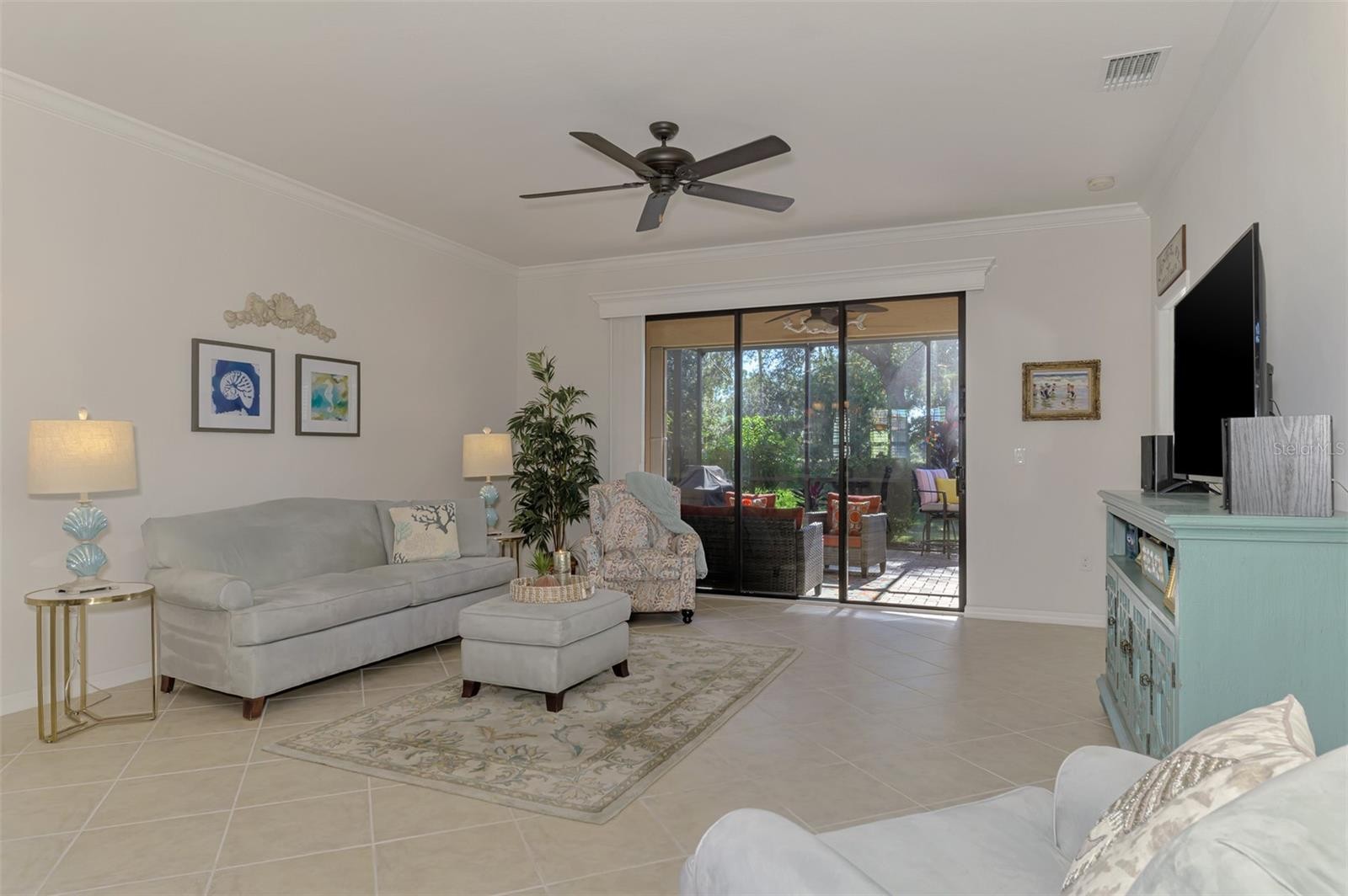 Welcome to this meticulously cared-for, freshly painted gem in a desirable 55+ gated community! This two-bedroom, two-bath home boasts an additional office/den, perfect for work or hobbies. Step inside to an open floor plan where you will delight in the coastal theme, crown molding, plantation shutters, and custom lighting throughout. The split layout offers guests their own private space, while the delightful bay window in the breakfast area floods the room with natural light. Enjoy no carpeting, stainless steel appliances, granite countertops, a large pantry closet and warm wood cabinets in the kitchen. Practical updates include a recent water heater and refrigerator. The paver driveway and walkway lead you to a screened front entry. Out back you will find plenty of space to relax on the extended screened lanai. The home is protected by accordion hurricane shutters. Community perks shine with low HOA fees, no CDD, and a fabulous clubhouse featuring a calendar of events for those who wish to stay involved. Amenities abound: resort pool, resistance pool, hot tub, bocce courts, fitness center, banquet room, arts and crafts room, library, pool room, putting green, and internet cafe. This is Florida living at its finest—schedule your showing today!