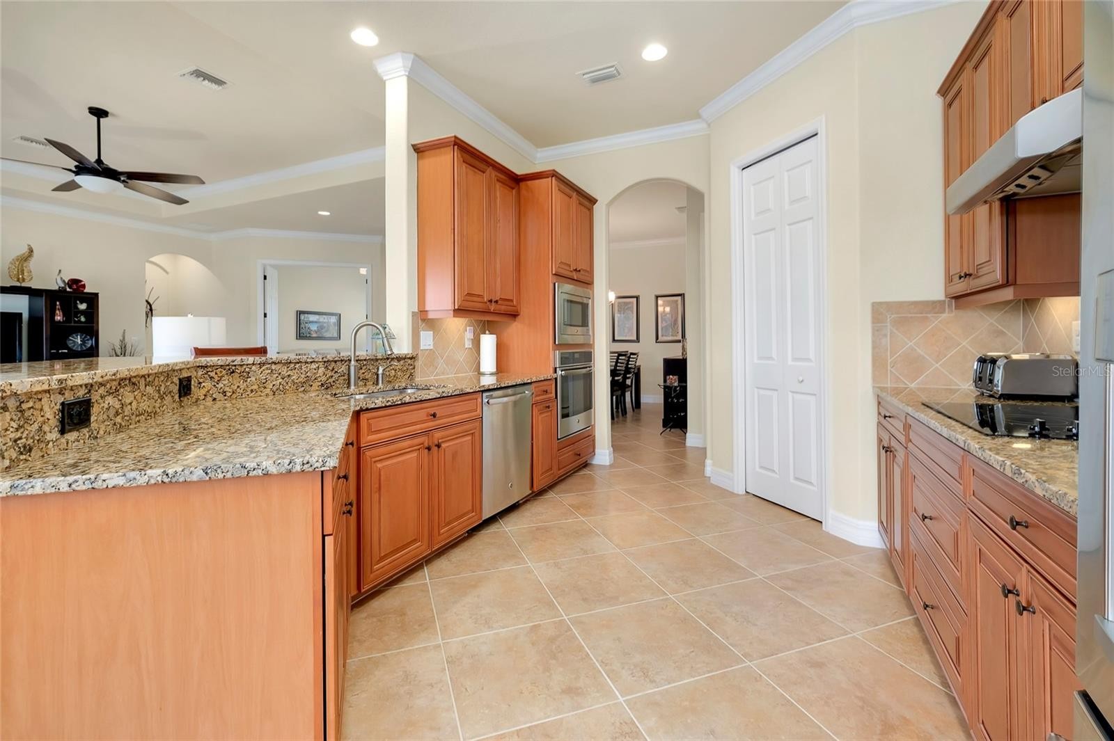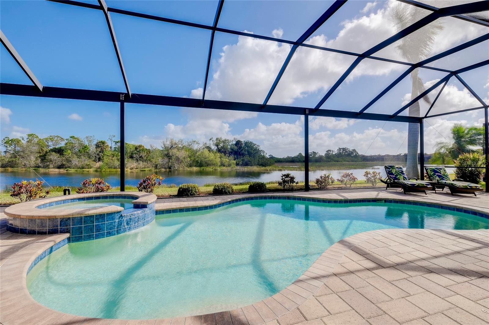 Built on a premium full lake view lot, this immaculate luxury home includes a custom designed pool and spa, study or 4th bedroom and the 3 car garage. Beautiful finishes, cabinetry and attention to detail makes this meticulously maintained estate home an exceptional property. Leaded glass entry doors open into the great room to an amazing lake and lush vegetation view through the triple sliders. The pool cage has the scenic-view screening and the large lanai with sealed pavers allows for entertaining. Great privacy and so relaxing! The heated salt-water pool includes auto fill to maintain the proper level year round, pop up cleaning jets, lighting and attached heated spa. The pool pump, filter, housing and cage screening is all new. The lanai has access to the pool bath. The Oakmont model offers a split floor plan with an open concept living area, tray ceilings, crown moldings, and ceramic tile floors in main areas. The beautiful kitchen has granite countertops, stainless steel appliances, cooktop, detailed wood cabinetry, a raised bar plus a dinette area looking out to the lake. Safety features include hurricane locking accordion shutters for the windows, Kevlar automated screens on front entry and covered lanai area and a security system. The primary bedroom has access to the pool area, large walk in closet, en-suite bath with 2 separate vanities, a Roman walk in shower and a soaking tub. The front bedroom is currently used as an office. The remaining 2 bedrooms are on the other side of the home with a full bathroom plus the 1/2 bath for the pool area. The laundry room has built in cabinetry and a sink and leads to the 3 car garage. The garage has been upgraded with an epoxy finished floor, a workshop and pull down stairs to storage attic area. New AC unit and air purification system installed in April 2025. The gated community of Gran Paradiso has a low HOA fee that includes lawn care, irrigation, cable, internet and use of the community amenities: a resort-style swimming pool, clubhouse, gym, tennis/pickleball courts, playground and full time activity director. Conveniently located to Venice beaches, airports, hospitals and schools, Wellen Park and the Atlanta Braves Spring Training facility. Furniture is available under separate contract. Move-in ready, perfect for snowbirds as well.