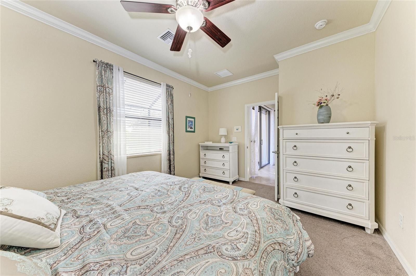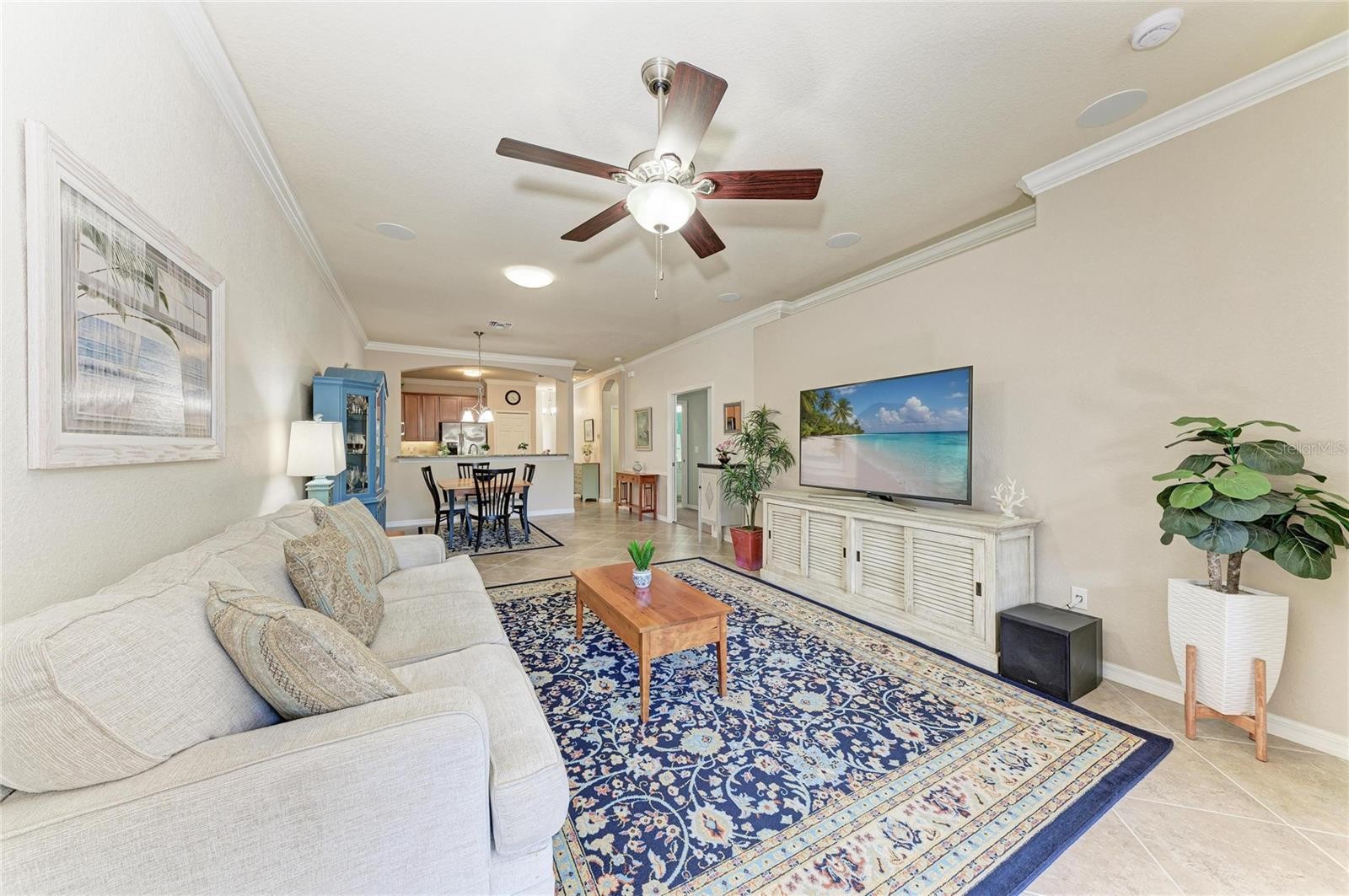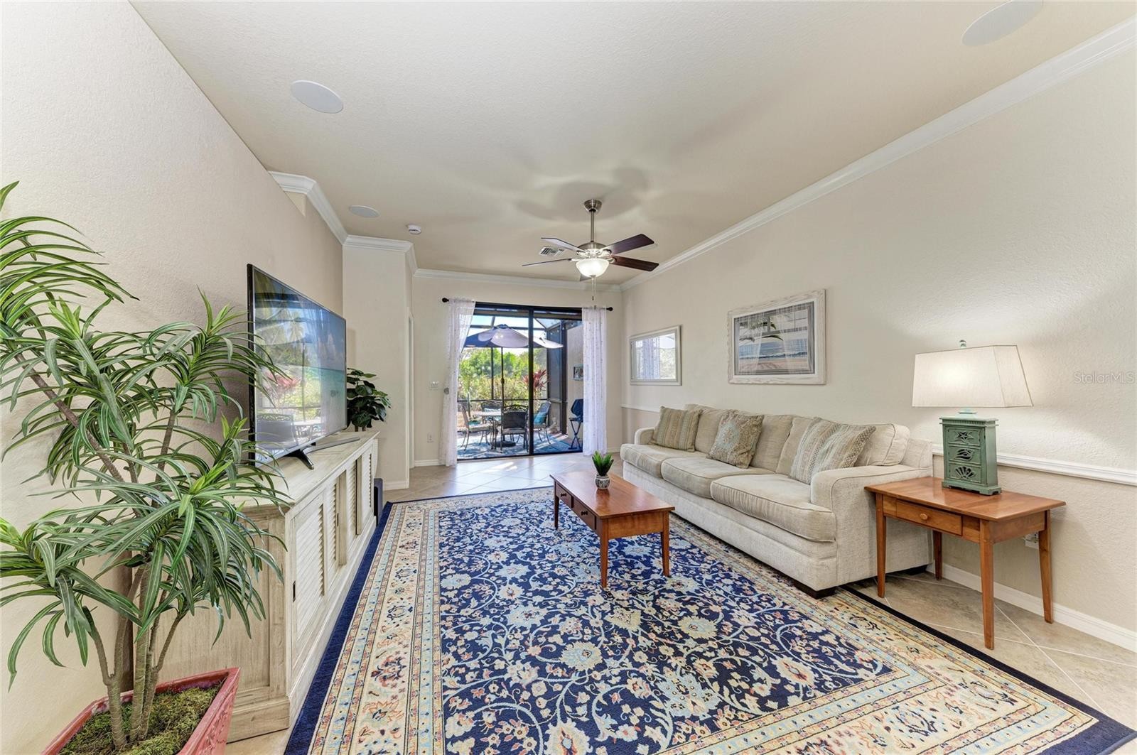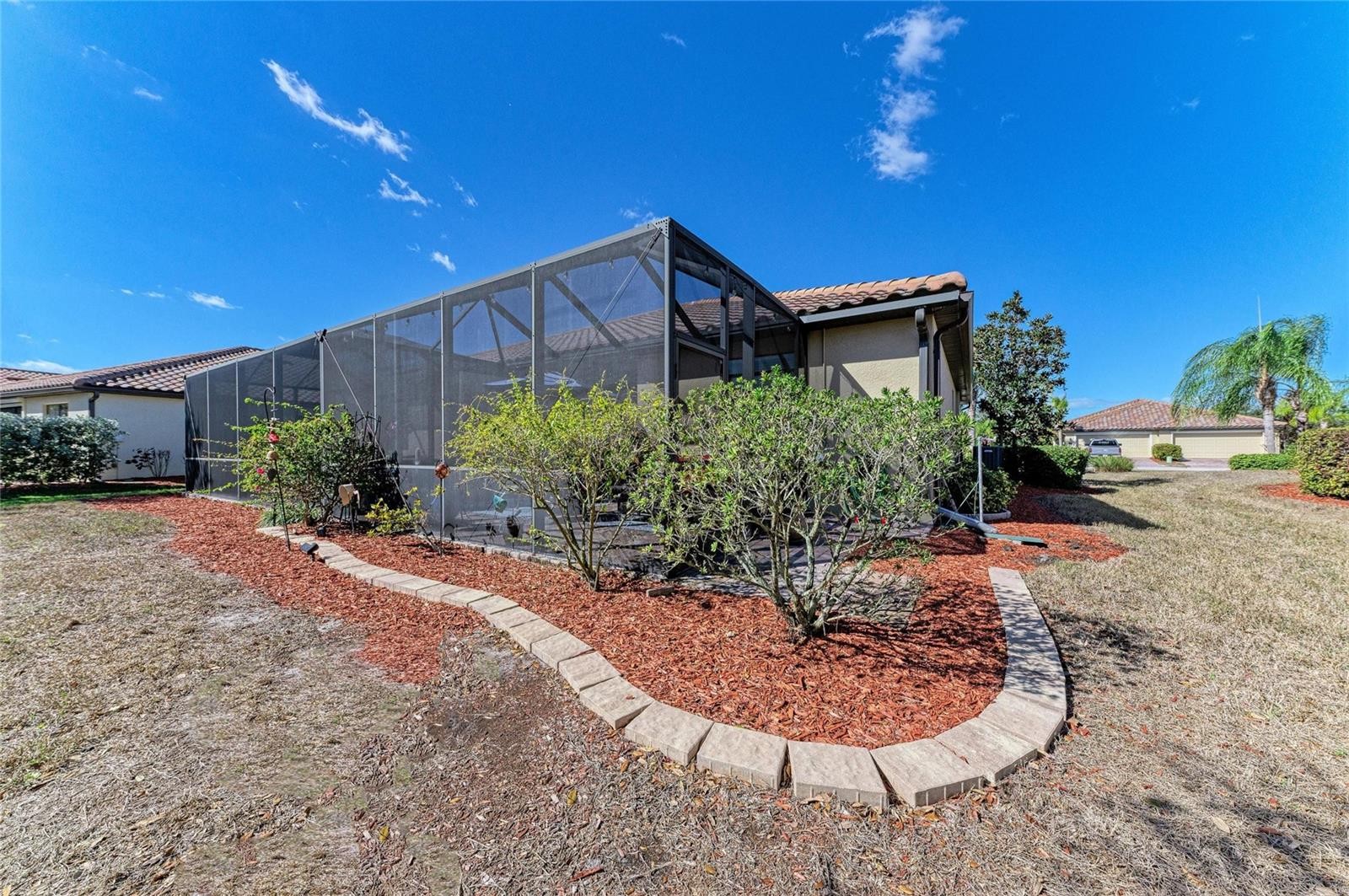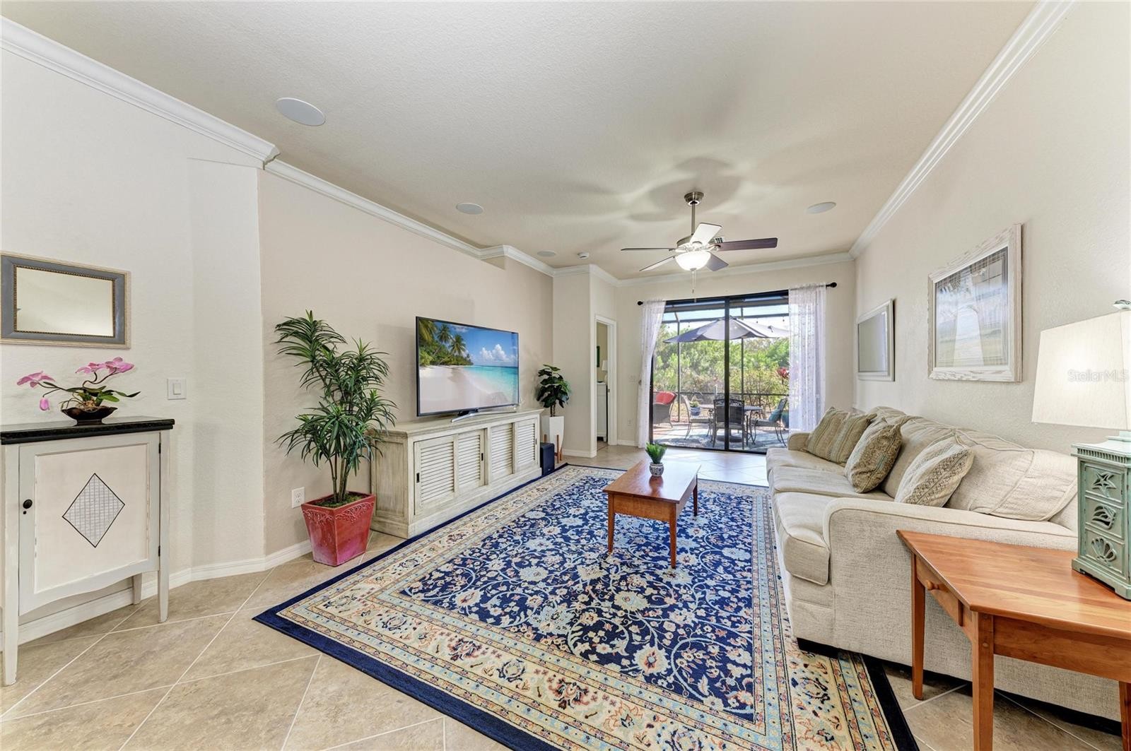 Welcome to this attractive villa in the gated, Tuscan-inspired community of Grand Paradiso. Ideally situated on our private preserve lot, this light-filled residence offers an open concept floor plan with diagonal porcelain tile flooring, crown molding, and updated LED lighting throughout. The extended lanai is a true highlight, featuring a motorized or retractable Kevlar hurricane screen and a tranquil preserve view, creating the perfect space for seamless indoor/ outdoor living year-round. The kitchen is equipped with granite countertops, a tile backsplash, under-cabinet lighting, a solar tube for natural light, an upgraded garbage disposal, and a new microwave (2025). The dining area features decorative wainscoting and a dimmable chandelier, flowing into a spacious living room with surround sound and abundant natural light. The primary suite features crown molding and a spa-style bath with solar tube lighting and a Gerber comfort-height toilet. The guest bath includes a walk-in shower with safety bars (added 2025). Additional features include a 2019 water heater, a whole-home water treatment system, ample garage storage, and pre-wiring for a future lanai hot tub. Enjoy maintenance-free living with resort-style amenities, including pool, spa, fitness center, tennis, pickleball, and an active social calendar. HOA fees includes free basic cable and Internet, and roof repair/replacement. All conveniently located near beaches, dining, shopping, golf, and downtown attractions. Can be sold furnished/turnkey-ready.