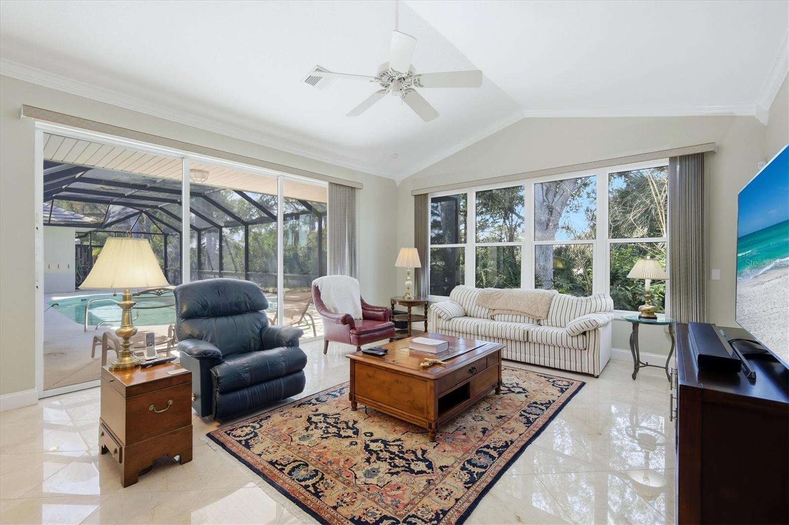 Welcome Home! Nestled within the desirable Calusa Lakes community, this beautiful residence is thoughtfully designed with living space that blends luxury with comfort! This beautifully maintained home features three bedrooms, a den/office, and 3.5 bathrooms, all set on a heavily treed lot overlooking the 13th fairway of Mission Valley Country Club. Custom craftsmanship is evident throughout, from the medallion inlaid tiled front porch with new electronic lock and brass hardware to the expansive lanai and pool area. One of the largest lanais in Calusa Lakes, the outdoor living space features a 411-square-foot PebbleTec heated saltwater pool and a brand-new (2025) 150-mph rated cage with extra-fine screening to block gnats and similar pests. The lanai is well lit and equipped with ceiling fans and outdoor speakers, creating an ideal space for entertaining or relaxing while enjoying the golf course views. Inside, imported marble flooring, high baseboards, and crown molding enhance the main living area, while the bedrooms and den feature comfortable carpeting. The spacious kitchen is a cook’s dream with stainless steel appliances, a five-burner propane cooktop, granite countertops with a center island, abundant cabinetry, walk-in pantry, and a motion-sensor Kohler faucet above the double stainless-steel sinks. The adjoining dining area comfortably seats up to nine guests. The family room features a wet bar with wine rack and glass storage, and pocket sliding doors that open seamlessly to the lanai. The large primary suite provides a private retreat with two walk-in closets, plantation shutters, and pocket sliding doors to the lanai. It includes two full bathrooms, one serving as a convenient pool bath, with dual vanities, a jetted tub, and a spacious walk-in shower with rainmaker, handheld, and body spray heads. Additional highlights include plantation shutters throughout the guest area, a bay-window den overlooking the front yard, a large laundry room with sink, and an over sized two-car garage with a generous extra area perfect for a workshop or extra storage. Major updates include a new roof in 2019 and an energy-efficient HVAC system installed in 2020 with three programmable zones, high-efficiency filtration, and UV light. The home also includes a central vacuum system and a comprehensive security system with glass-break detectors and motion sensors. Conveniently located just minutes from Sarasota Memorial Hospital’s Venice campus, I-75, and US-41, Calusa Lakes offers a semi-private golf course setting close to beautiful Gulf beaches, shopping, dining and the Legacy Trail for biking and walking. This exceptional home truly completes the Florida lifestyle.