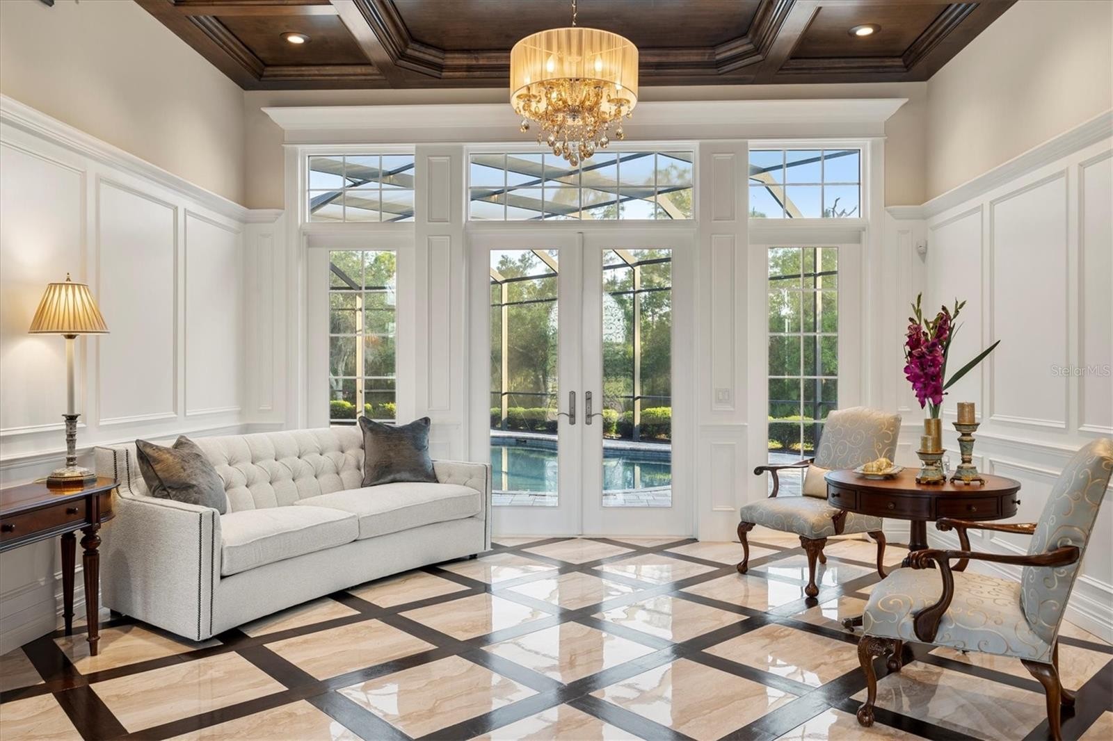 Set on over seven acres in the prestigious equestrian community of Panther Ridge, this custom-built estate offers refined single-story living surrounded by serene preserve views and a private lake. Thoughtfully designed for everyday living and elegant entertaining, the residence spans four bedrooms, four and a half baths, a dedicated office and a spacious bonus room, all underpinned by quality craftsmanship, security of impact-rated windows and front door, and impeccable overall design. A long, private drive leads to a stately entry framed by double-arched, hurricane-rated wood and glass doors with custom ironwork. Inside, high ceilings, architectural detailing, and a combination of rich wood and inlaid tile flooring create a sophisticated yet inviting atmosphere. Expansive windows bring in natural light and connect the interiors to the tranquil outdoor setting. The kitchen is professionally equipped with premium Dacor appliances, including a six-burner gas cooktop, wall oven, microwave drawer, built-in refrigerator and dishwasher. A custom pantry, custom-built breakfast banquette and seamless flow into the living room make this space ideal for everyday use and casual entertaining. A formal dining area is framed by tray ceilings and detailed millwork, offering a timeless setting for special occasions. The home’s guest accommodations include three well-appointed suites, two sharing a Jack and Jill bath, and a third with a private en suite and walk-in closet. A spacious bonus room with vaulted beamed ceilings offers flexibility as a media room, studio or play space. The home office, beautifully designed with custom built-in cabinets, provides a quiet and functional workspace. The expansive primary suite is a private retreat featuring dual walk-in closets and a spa-inspired bath with a freestanding soaking tub, walk-in shower with dual heads, dual vanities and elegant finishes throughout. Outdoor living is equally impressive. The screened lanai includes a saltwater heated pool and spa, an outdoor kitchen with built-in grill and multiple seating areas, all set against a private preserve. Limestone pavers and extensive landscaping elevate the outdoor experience. Additional features include whole-house water filtration and water softener systems, upgraded landscaping and thoughtful storage throughout. Minutes from Lakewood Ranch and close to top-rated schools, dining, shopping and Gulf Coast beaches, this estate offers the rare combination of privacy, luxury and convenience. Panther Ridge is known for its expansive homesites, equestrian trails and peaceful natural setting, making it one of Sarasota’s sought-after communities. This property is more than a residence, it’s an exceptional lifestyle opportunity.