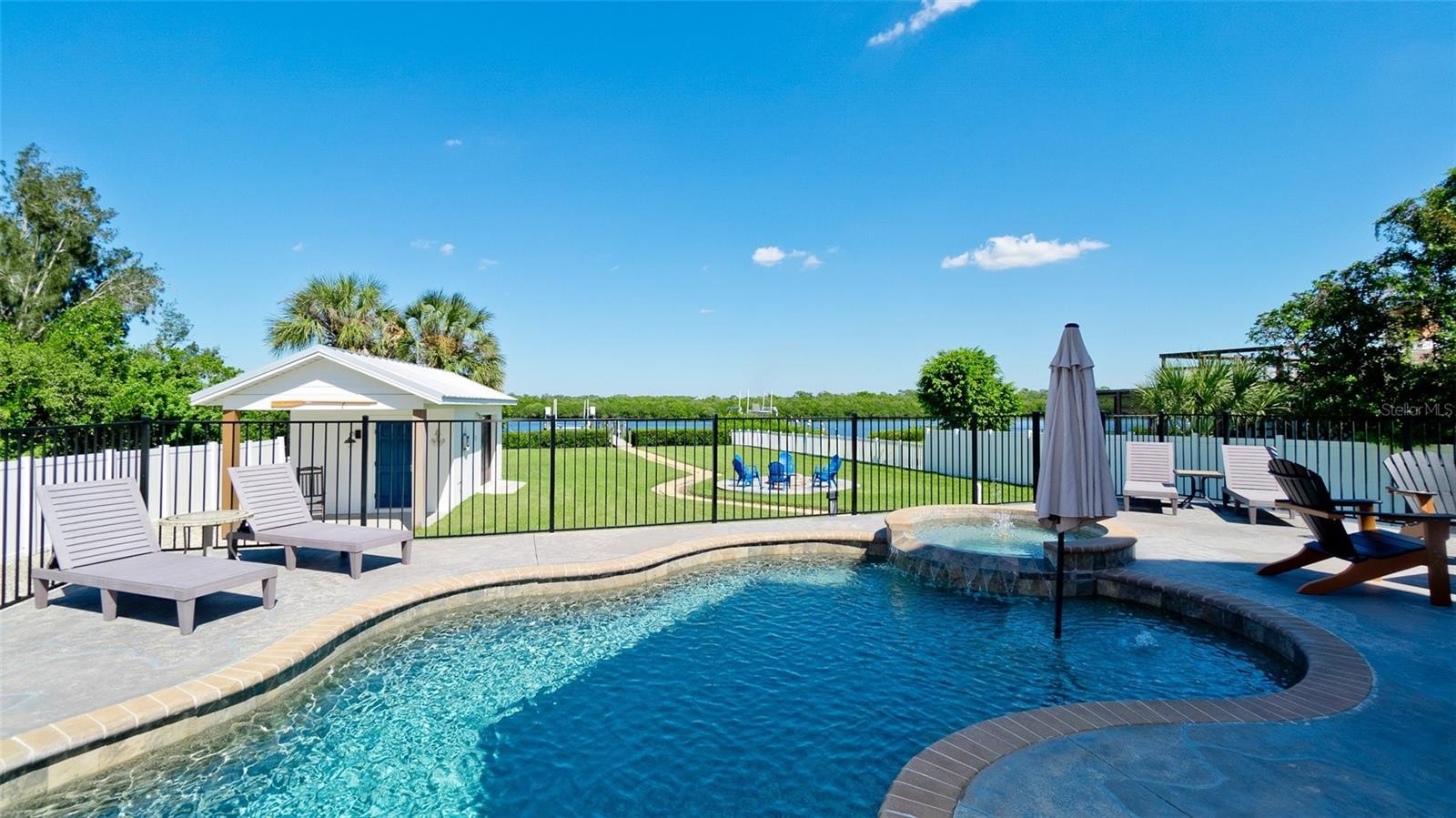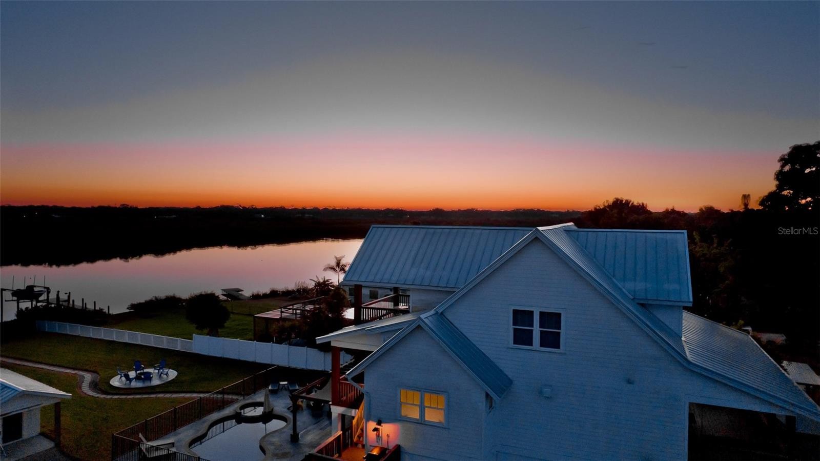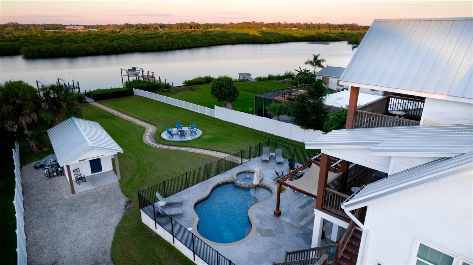 Welcome to this stunning 3-story oasis, perfectly perched on .73 acres, overlooking serene nature islands and offering breathtaking sunrises. This exceptional property features a boat dock with a 10,000-pound lift and a floating jet ski dock, making it a water lover's paradise. Enjoy a lagoon-style heated pool with a spa and a dedicated storage house for pool toys and boat equipment—all without HOA or CDD fees! The meticulously designed interior boasts 9-foot ceilings throughout, with a ground level featuring a completely surrounded concrete block room that can have many uses such as workshop, storage or for safety in case of storms. Don't forget a sauna and a spacious 3-car garage and a home fitness area. Step onto the expansive front and rear decks on the second level, complete with a barbeque deck hooked up to a 500-gallon propane tank that fuels one of two cozy fire pits. The open floor plan highlights a modern kitchen with white shaker soft-close cabinets and a stunning granite island, flowing seamlessly into the living and dining areas. The primary bedroom offers custom wood moldings, an en-suite bathroom with a luxurious 6x5 walk-in shower, double sinks, and quartz countertops. The third floor hosts two additional bedrooms, each with walk-in closets—one also featuring a bonus space perfect for an office or nursery. Additional highlights include all out-swing doors, hurricane impact windows, dual AC units, a beautiful iron and wood staircase, and thoughtfully designed outdoor spaces with cypress ceilings. Spot dolphins, manatees, and various bird species right from your home! With a whole house generator and every inch of this home crafted with intention, this property is a true testament to luxurious living. Don’t miss out on this unparalleled waterfront gem! NOTE: The stairs in this home have been constructed to accommodate stair lifts, both sets were built 4 ft wide with raised railings (stairs from garage to main level are already wired for lift in case of necessity).
