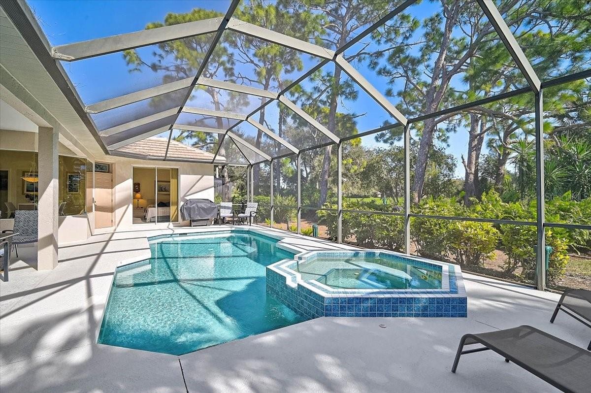 Gracefully set along the prestigious Calusa Lakes Golf Course, this impeccably maintained three-bedroom, two-bath coastal retreat offers sweeping views of the 11th fairway framed by lush, tropical greenery. Designed to embrace both luxury and tranquility, the home showcases a series of thoughtful enhancements, including a NEW ROOF in 2025, new gutters in 2021, and a freshly painted exterior completed in 2019. The light-filled kitchen has been elegantly refreshed with custom-refaced cabinetry and timeless granite countertops, creating a refined space ideal for both intimate mornings and effortless entertaining. The primary suite serves as a serene sanctuary, featuring dual walk-in closets and private access to the lanai—inviting seamless indoor-outdoor living and moments of relaxation in your private pool with NEW PUMP and the hot tub. Tile flooring throughout the main living areas is complemented by luxury vinyl in the bedrooms, offering a clean, modern aesthetic with effortless maintenance. The home’s western exposure bathes the interiors in soft natural light, setting the perfect scene to savor morning coffee while gazing over your private pool and the manicured fairway beyond. This home is being offered TURNKEY FURNISHED less a few personal items to make your move even more convenient. Residents enjoy the convenience of a private community back gate, providing quick access to major highways and the new Sarasota Memorial Hospital. Ideally located just minutes from the white-sand beaches, upscale dining, and charming boutiques of Venice Island, this residence embodies refined coastal living at its finest. An exceptional opportunity to experience elegance, comfort, and the relaxed sophistication of Florida’s Gulf Coast lifestyle. BE SURE TO VIEW THE 3-D TOUR!