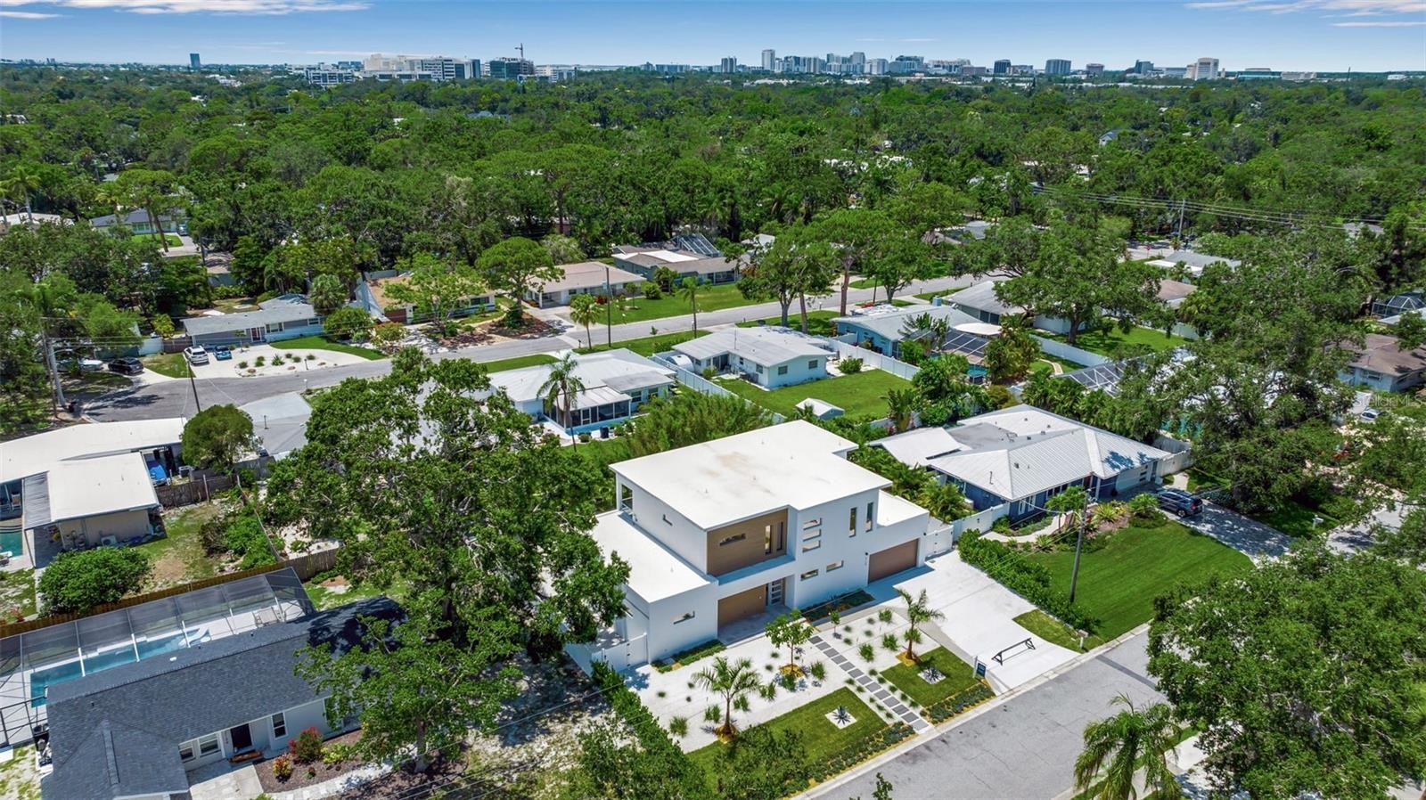 Outstanding value for new modern construction in Arlington Park. Welcome to 2124 Clematis Place, a newly completed Courtyard Modern residence influenced by the Sarasota School of Architecture. This 6-bedroom, 6-bath home delivers clean lines, bold volume, and seamless indoor–outdoor flow across 3,574 sq. ft. of conditioned living space. The main level is bright and airy, with polished concrete tile floors and a minimalist material palette. The kitchen features modern cabinetry, quartz countertops, and premium appliances, while the flexible floor plan provides space for work, guests, or multi-generational living. Outside, a private oasis includes a pool and spa, fenced yard, and low-maintenance landscaping. Ideally located near Arlington Park, downtown Sarasota, Southside Village, Sarasota Memorial Hospital, and area beaches.