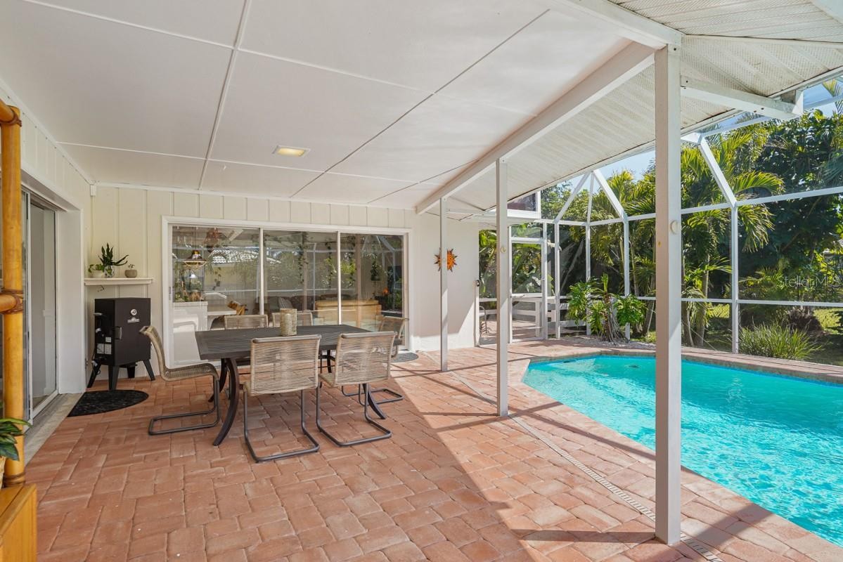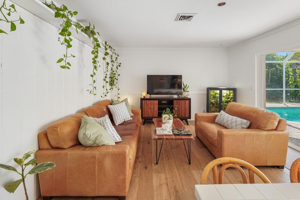 Step into the Florida charm you’ve been searching for in this beautifully updated 3-bedroom pool home in the desirable Sorrento East community. Flood Zone X and still just minutes from the areas top beaches. Move-in ready with furniture available, plus bring your boat with access to the Sorrento Dock Owners Association marina, where owners may purchase or rent a boat slip. The impressive curb appeal welcomes you home with a circular brick driveway, mature landscaping, tile roof, and freshly painted exterior. French doors open to a bright living and dining space with a wall of pocket sliders leading to the spacious paver lanai and private pool, surrounded by lush tropical green. Features include a renovated primary bathroom, updated guest bath, engineered hardwood floors, and custom trim and woodwork throughout. The kitchen with stainless steel appliances, copper accents and custom pot rack overlooks the family room and pool—ideal for entertaining. Updates: AC 2023, electrical 2024, roof 2009, replumbing 2009, partial drain repipe 2025. Conveniently located between Venice and Sarasota with A-rated schools nearby and quick access to I-75 and the new Sarasota memorial hospital. This home gives you that Florida charm with coastal living.