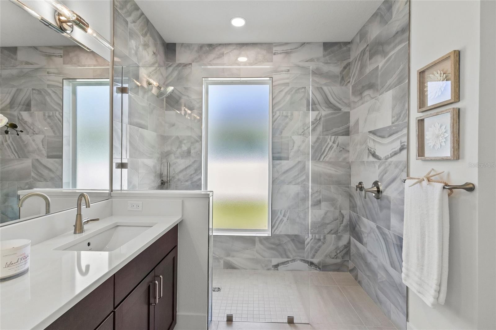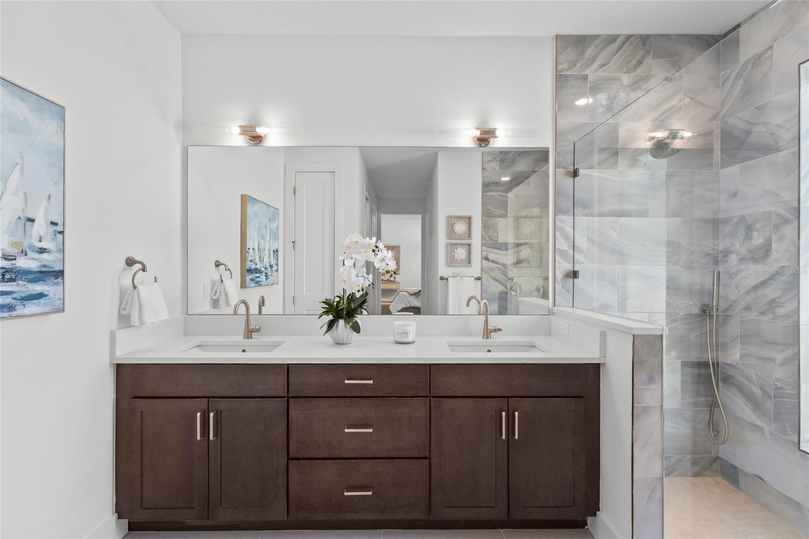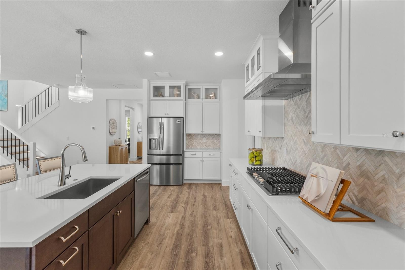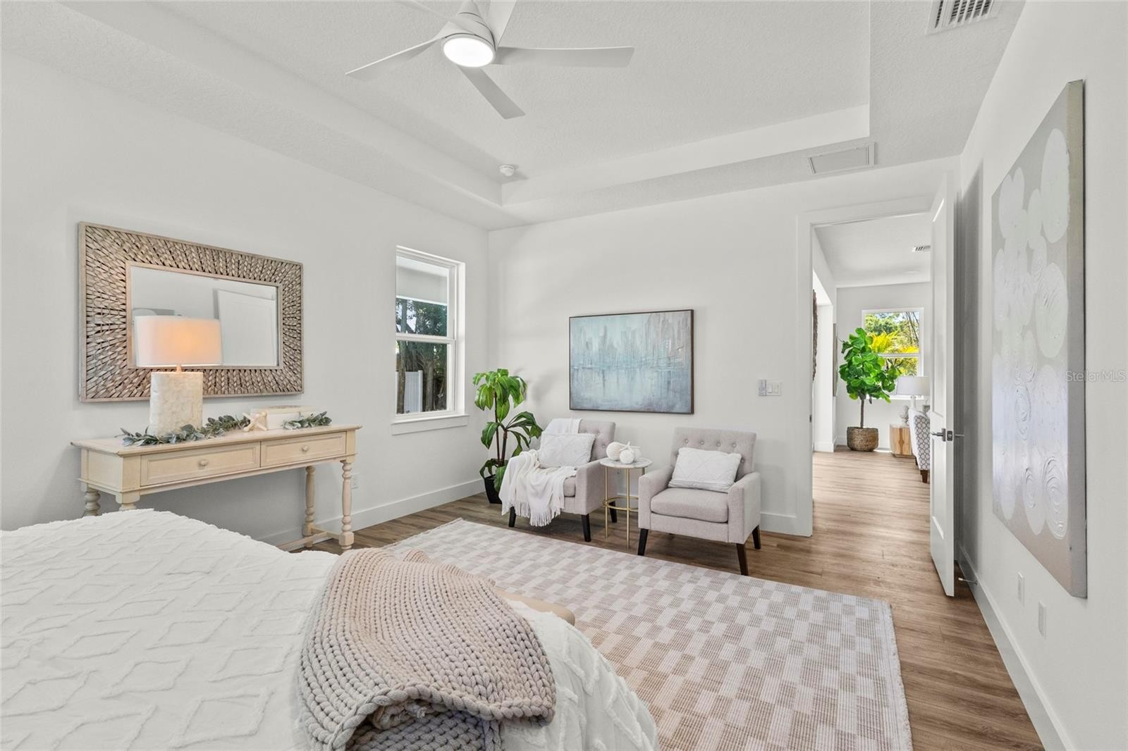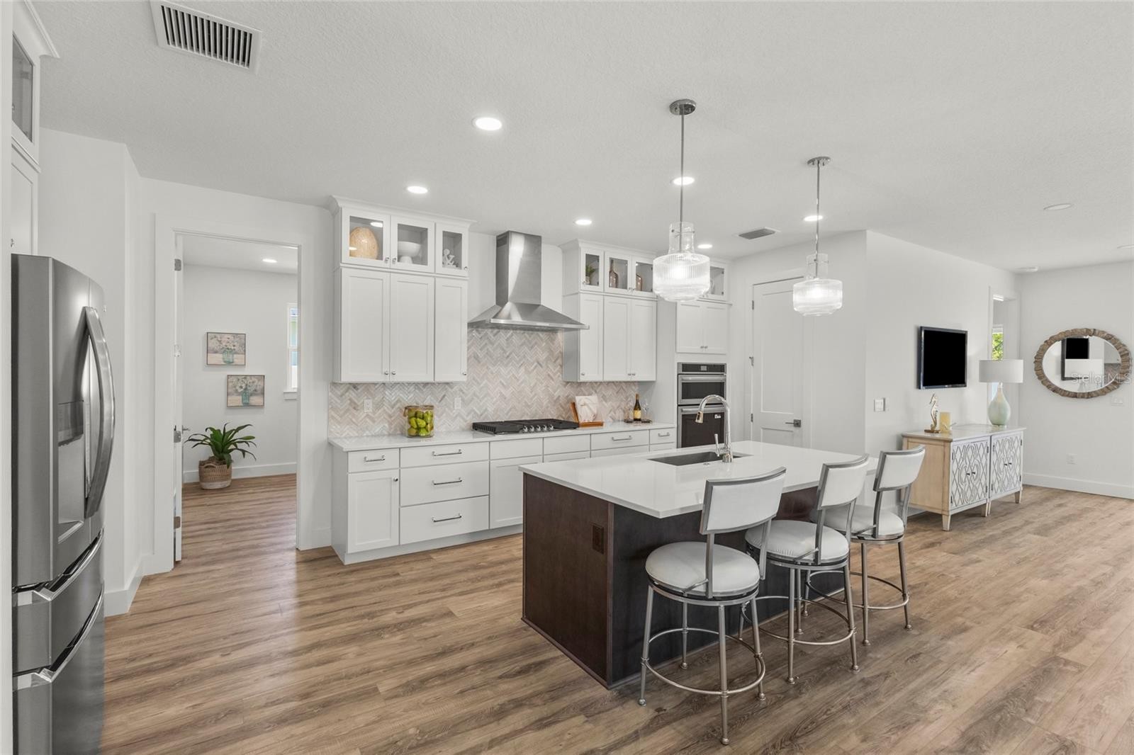 Introducing THE RETREAT, a stunning two-story residence. FOUR (4) bedroom, THREE (3) bath. Paver driveway, 3 CAR GARAGE, LVP flooring. Home has been professionally staged. Pool is complete; size 12 x 26 , leaving plenty of green space for pets in the backyard! This exceptional new build boasts superior block construction, a durable metal roof, impact-resistant windows, doors, and sliders. Inside is a thoughtfully designed open floor plan, featuring soaring 10-foot ceilings and elegant 8-foot solid core doors that enhance the home’s impressiveness. The gourmet kitchen is complete with a 6-foot island, luxurious quartz countertops, custom shaker cabinetry, and a top-of-the-line appliance package, perfect for both daily meals and entertaining. The primary bedroom, located on the main level, is a serene retreat with stunning tray ceilings, large his/her walk-in closets, double vanity, and a spacious walk-in shower. Bedroom #2, also on the first floor, is versatile and can serve as an additional bedroom or a home office. Upstairs, you'll find two more generously sized bedrooms that share a beautifully appointed full bathroom. The home’s detailed interior is complemented by luxury vinyl plank flooring throughout both levels, providing durability and style. Outdoors, a gas-heated saltwater pool and paver deck creates the ideal setting for relaxation and entertainment. Conveniently located with easy access to downtown Sarasota, the Legacy Trail, Payne Park, Sarasota Memorial Hospital, and the world-renowned beaches of Longboat and Siesta Keys, this home offers the perfect blend of luxury, comfort, and convenience for modern family living. Experience elevated living at its finest in "your RETREAT"!