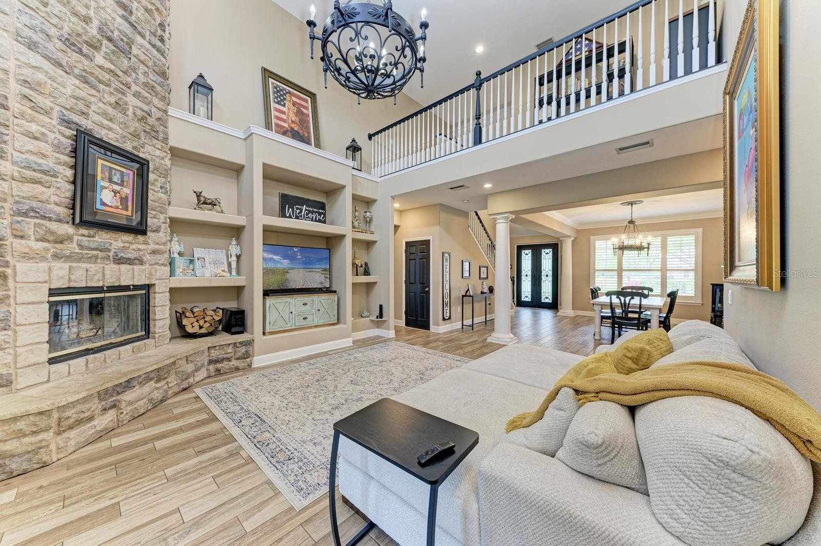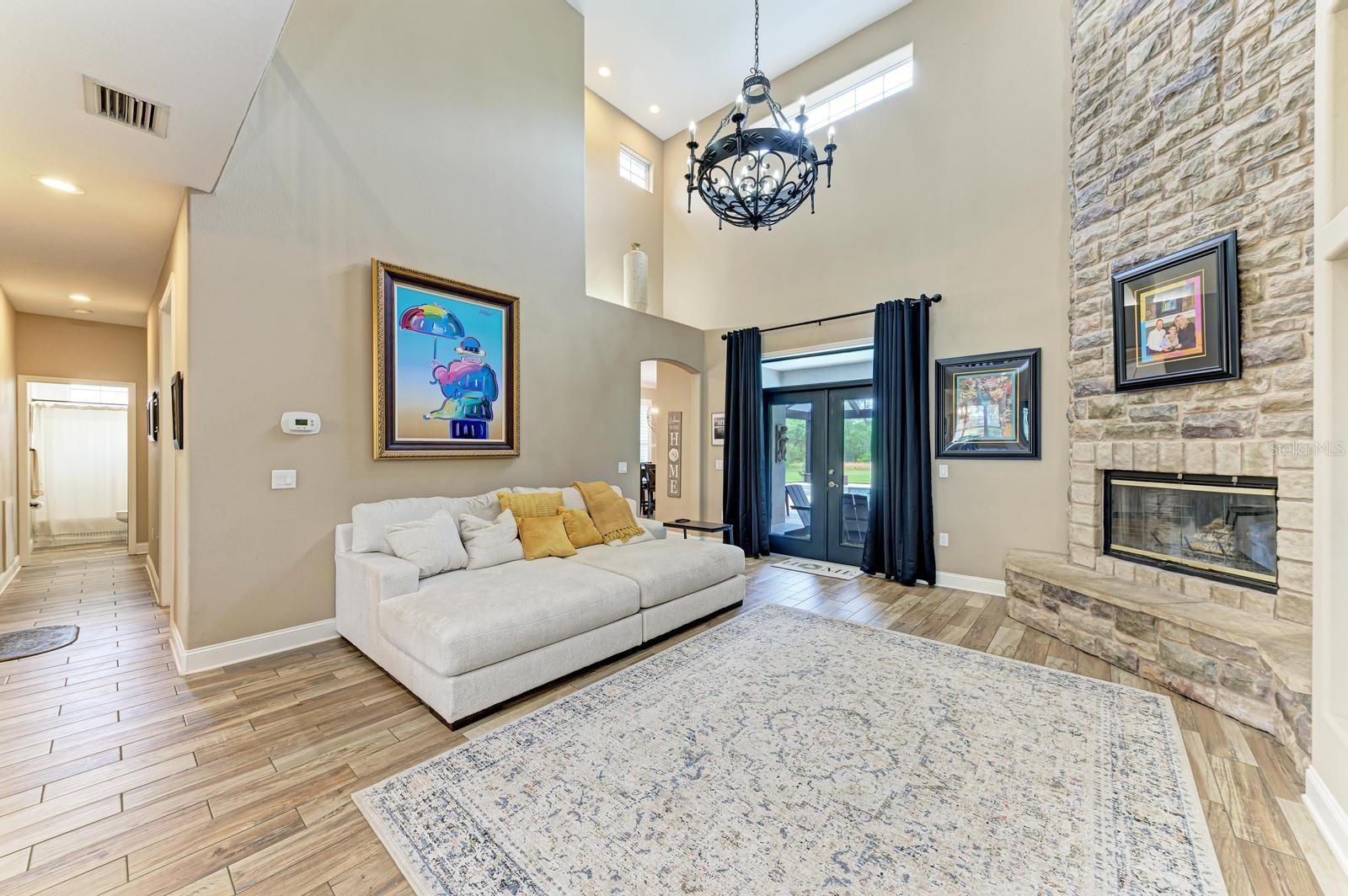 Set on 1.37 acres of complete privacy, this home gives you that rare feeling of breathing room the moment you turn up the drive. The property opens with towering oaks, quiet surroundings, and a stone exterior that feels rooted and timeless. It's the kind of setting people daydream about when they say they want more space, more quiet, and more separation from the noise. Inside, sunlight pours through tall windows and fills the home with a warm, grounded energy. The main living area wraps around a dramatic stone fireplace that immediately pulls you in. Every space flows together in a way that makes gathering feel natural, from the dining area to the freshly updated kitchen with its clean finishes, open layout, and island made for everyday life. The first-floor primary suite feels tucked away in its own corner of the home, with peaceful views and an easy connection to the outdoors. Another bedroom and full bath on the main level keep the floorplan flexible for guests or working from home. Upstairs, the catwalk gives you a sweeping view over the living room before leading to two additional bedrooms joined by a spacious Jack-and-Jill bath. Step outside, and everything opens up. The panoramic pool screen erases the boundary between indoors and out, giving your lanai and resort-style pool an uninterrupted backdrop of green space and sky. Morning coffee feels quieter. Evenings feel softer. With a raised spa, wide deck, and total seclusion, the whole space becomes your own private retreat. The home also includes a whole-home water system that keeps everything running clean and crisp without you ever having to think about it, along with a newer roof and storm-rated upgrades that bring real peace of mind. All of this sits in a place that feels wonderfully removed from the world yet keeps everyday conveniences just a short drive away. It's space, privacy, and comfort in a way that's genuinely hard to find.