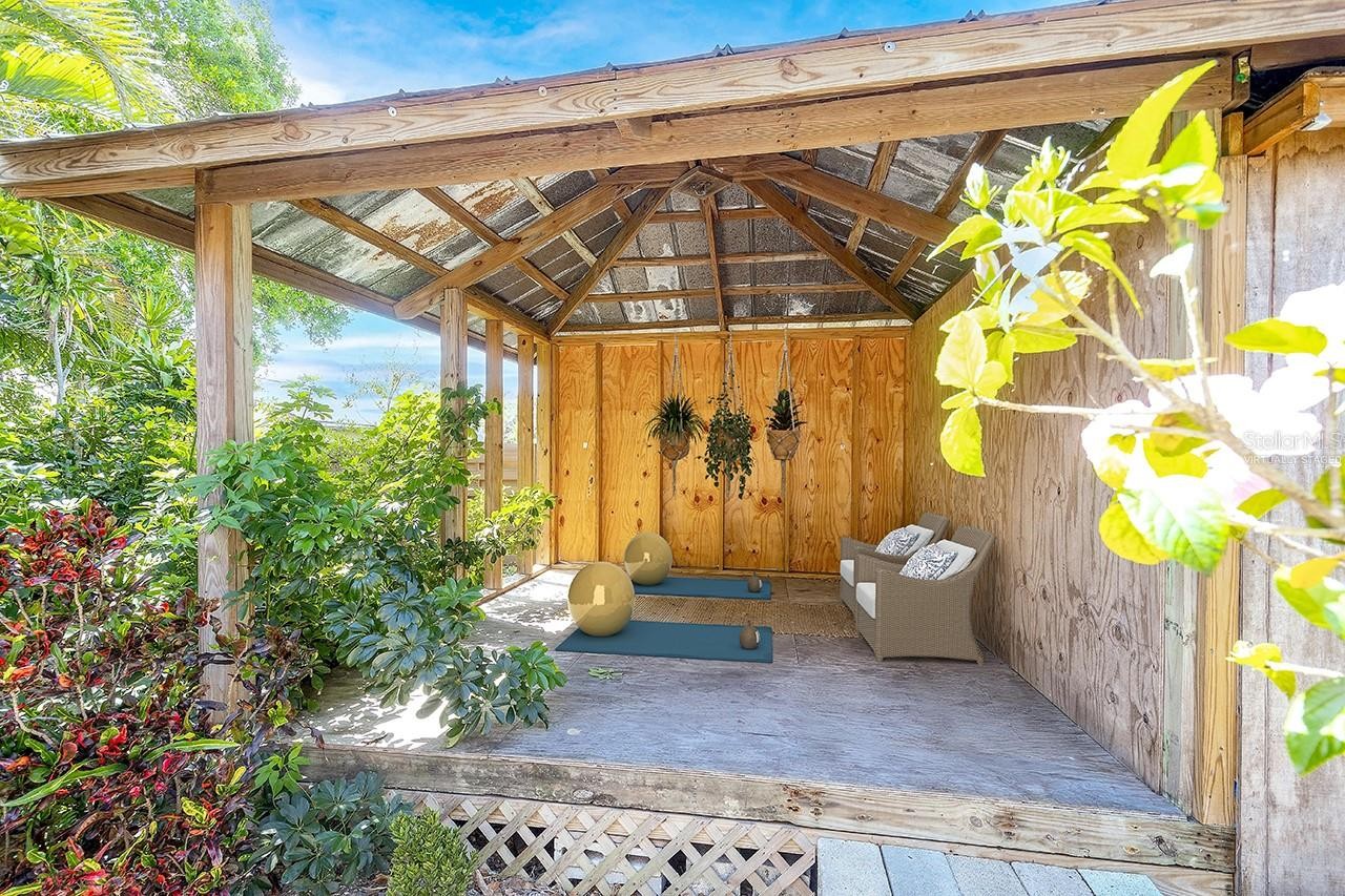 Back on The Market! With New & Upgraded Septic System (Installed Sept 2025) This Nature Lovers Retreat AS SEEN ON THE RECENT HGTV EPISODE OF MY LOTTERY DREAM HOME, Season 18 Episode 5, this beautifully updated craftsman-style home offers 1,048 sq. ft. of living space and a modern, open floor plan with vaulted ceilings creating a bright and spacious feel. Updates include seamless Luxury Vinyl Flooring throughout and Custom room-darkening shades. Entertaining or just making a stay at home dinner is a delight in the gourmet kitchen with granite countertops, herringbone backsplash, large single-basin sink, stainless steel appliances (including double oven) and butcher-block breakfast bar with foot rail, with an added bonus, the hanging spice garden that conveys makes fresh and tasty meals a daily delight. The charming built-in corner dining bench (conveys), Remodeled bathrooms (previous owner), Primary bedroom with vaulted ceiling, Guest bedroom includes custom Murphy bed with built-in desk and shelving—perfect for a home office, Newer A/C (2021) with UV light for improved air quality, High-end hybrid water heater and LED lighting throughout. Private PebbleTec heated saltwater pool (2019), Expansive covered lanai with multiple seating areas, Fenced yard (2024) with attractive woven wood fence and hanging spice garden, Treated wood walkway newly added (2025) leads to private backyard. Stay in shape or enjoy some Zen from your own elevated and covered yoga/meditation platform with attached storage shed, Mature trees maintained by a licensed botanist—home to many bird species, HURRICANE IMPACT WINDOWS & DOORS, Flood Zone X – No Flood Insurance Required, One-car air-conditioned garage (formerly 3rd bedroom – easy to convert back), Newer garage door (2021), Newer washer & dryer (2021), PIPES COMPLETELY LINED WITH PVC (2024), Grading & gutter system (2024) for proper drainage, Roof (2011) with wind mitigation (2022), Public water + brand-new septic system (2025). Conveniently located near shopping, dining, Siesta Key Beach, Oscar Scherer State Park, and The Legacy Trail. This move-in-ready home offers modern comfort, quality updates, and the best of Florida living—all in one exceptional property!